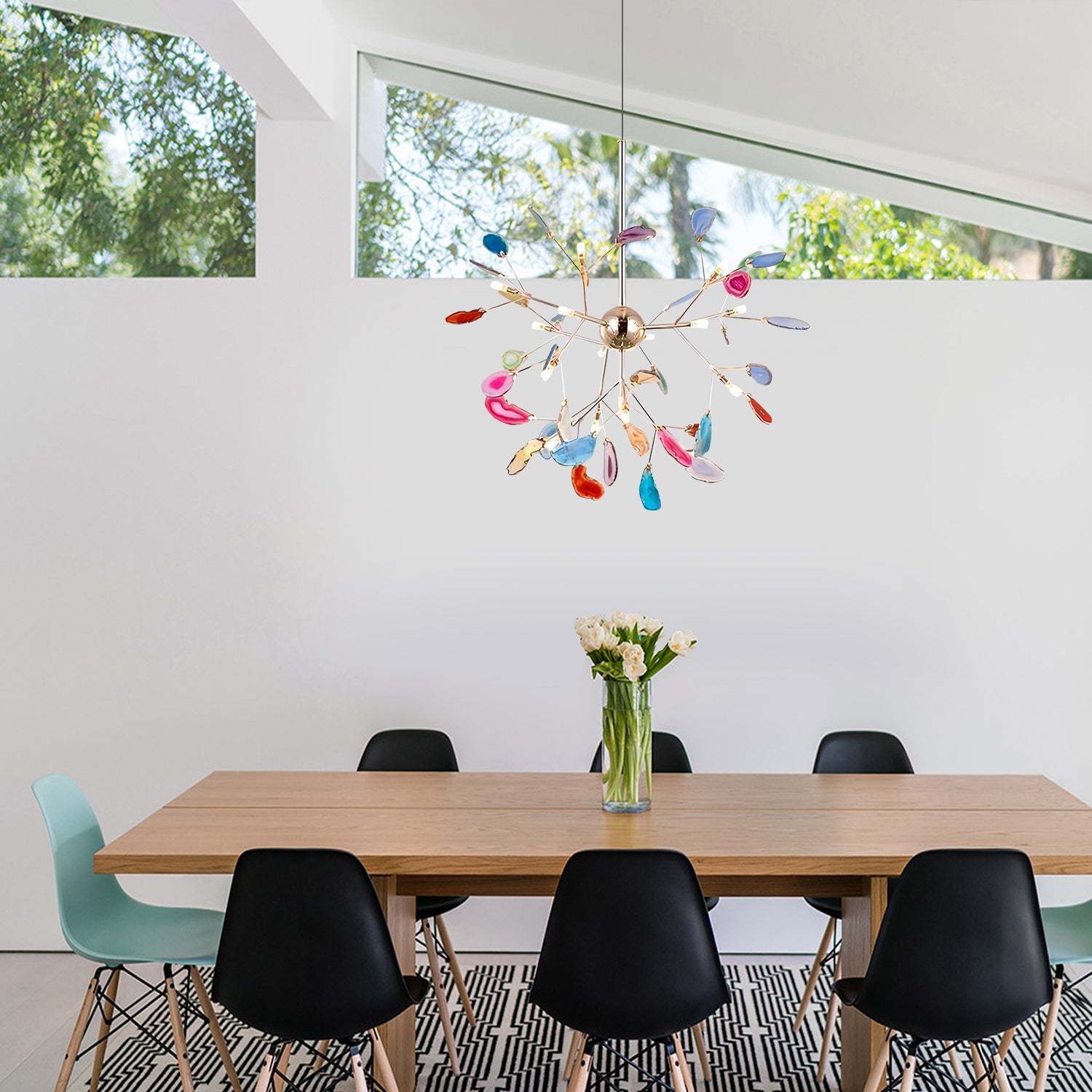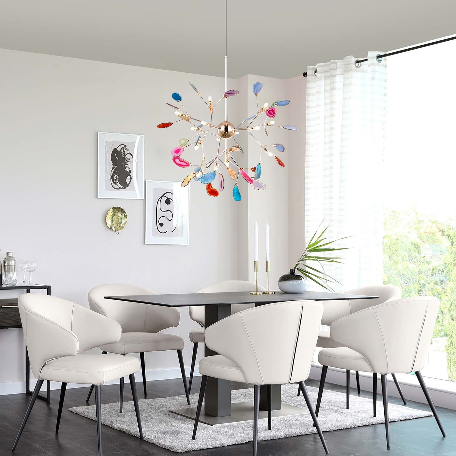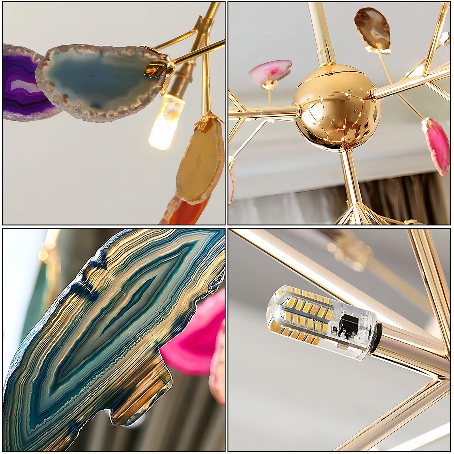 The Agate Chandelier is crafted from natural agate rough, shaped through slicing, polishing, grinding, and perforation techniques. Its vibrant colors and smooth finish highlight the stone’s natural beauty. The combination of luminous agate, meticulous craftsmanship, fine texture, and subtle lighting showcases the elegance of the gold plating.