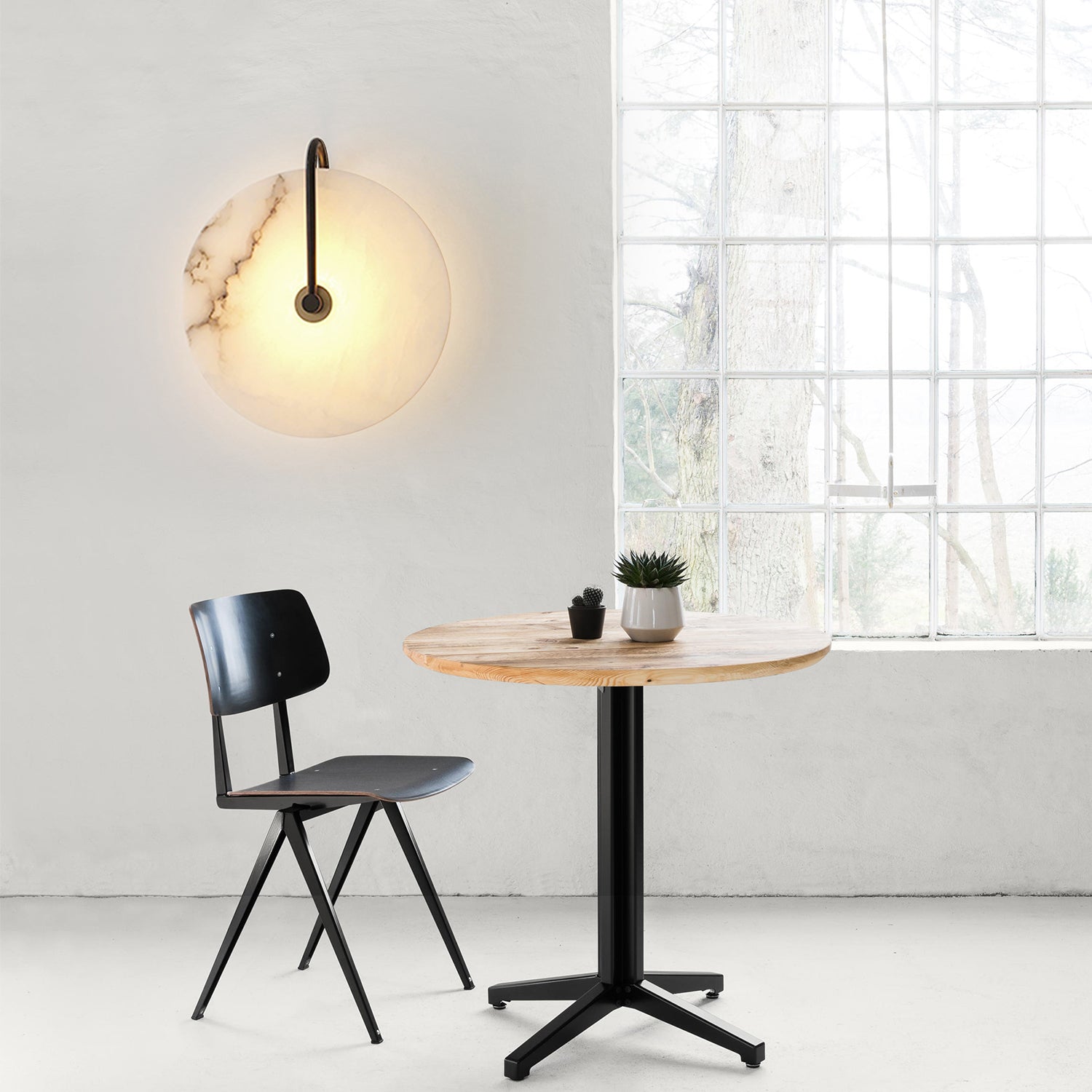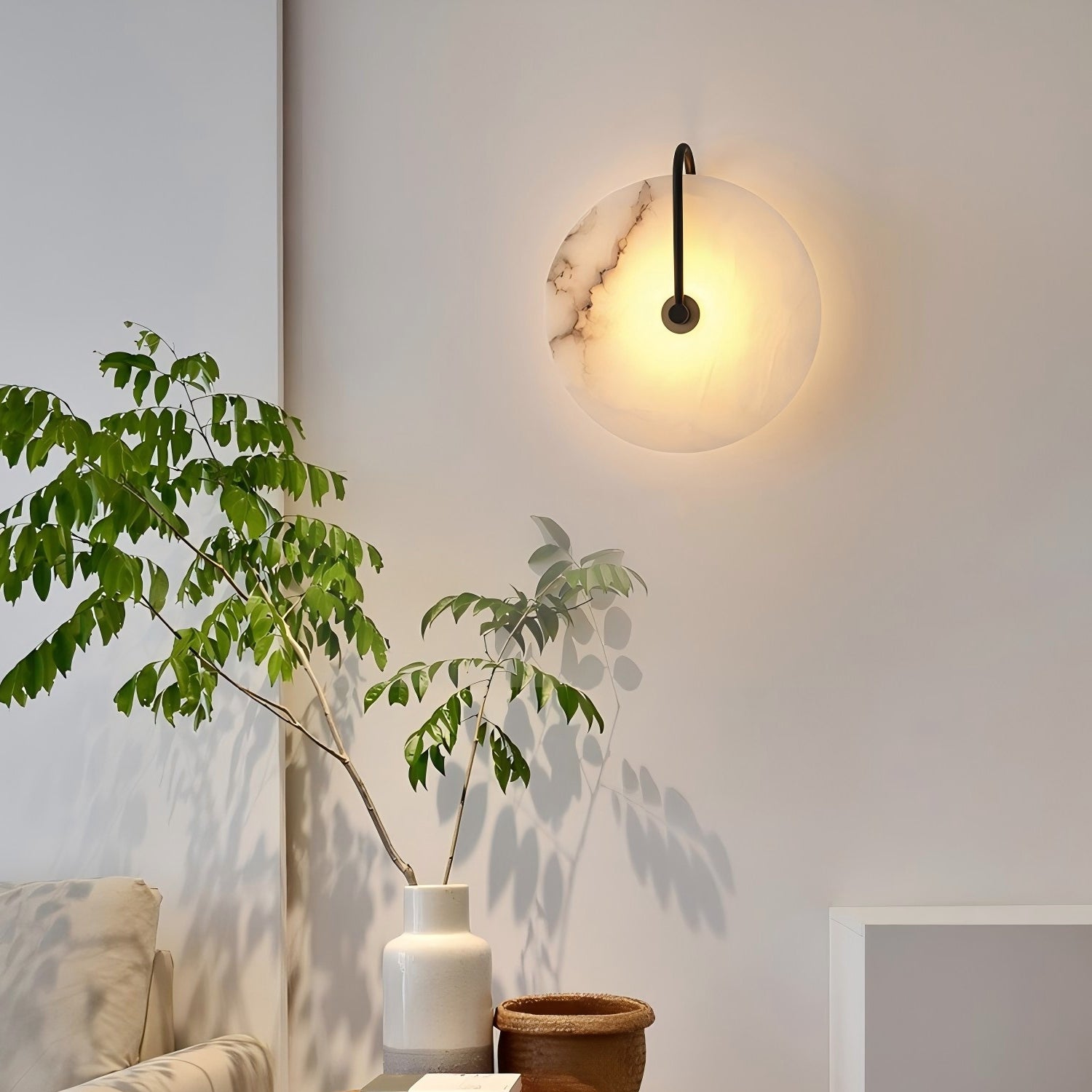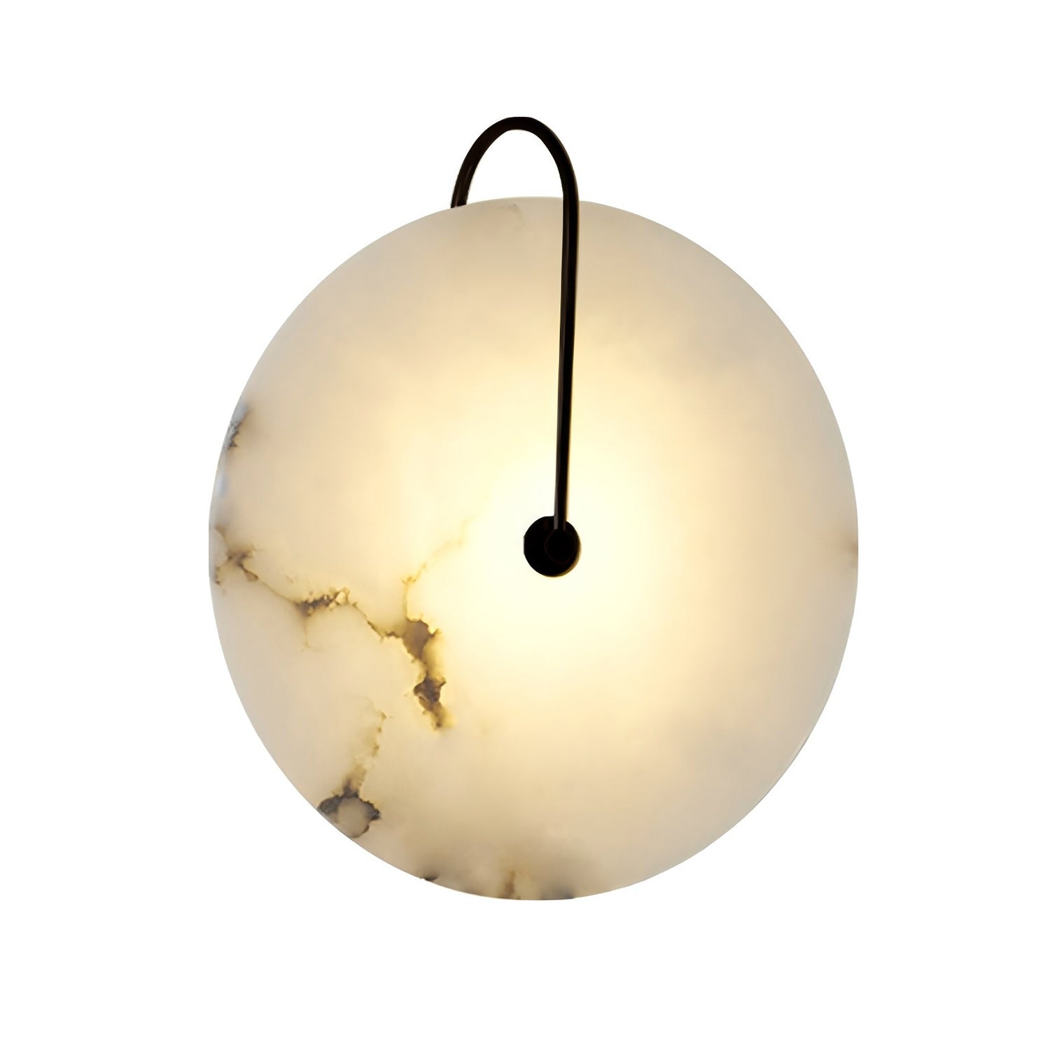 The Alabaster Sconce is made with natural alabaster, featuring a snowflake-like pattern and a perforated shade that allows light to pass through, creating a soft halo effect. The design highlights the natural texture of the marble and can be used in various interior settings, including living rooms, bedrooms, or hallways.