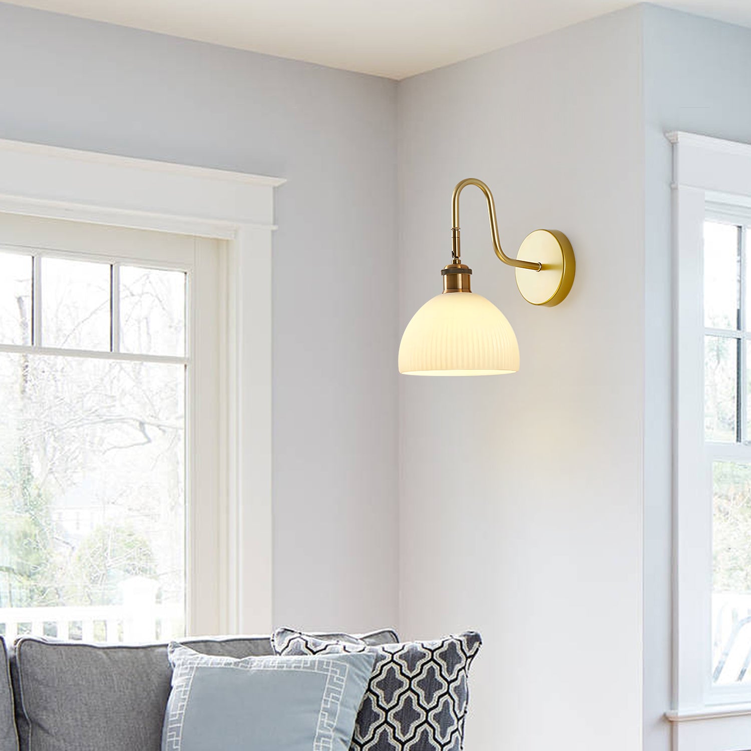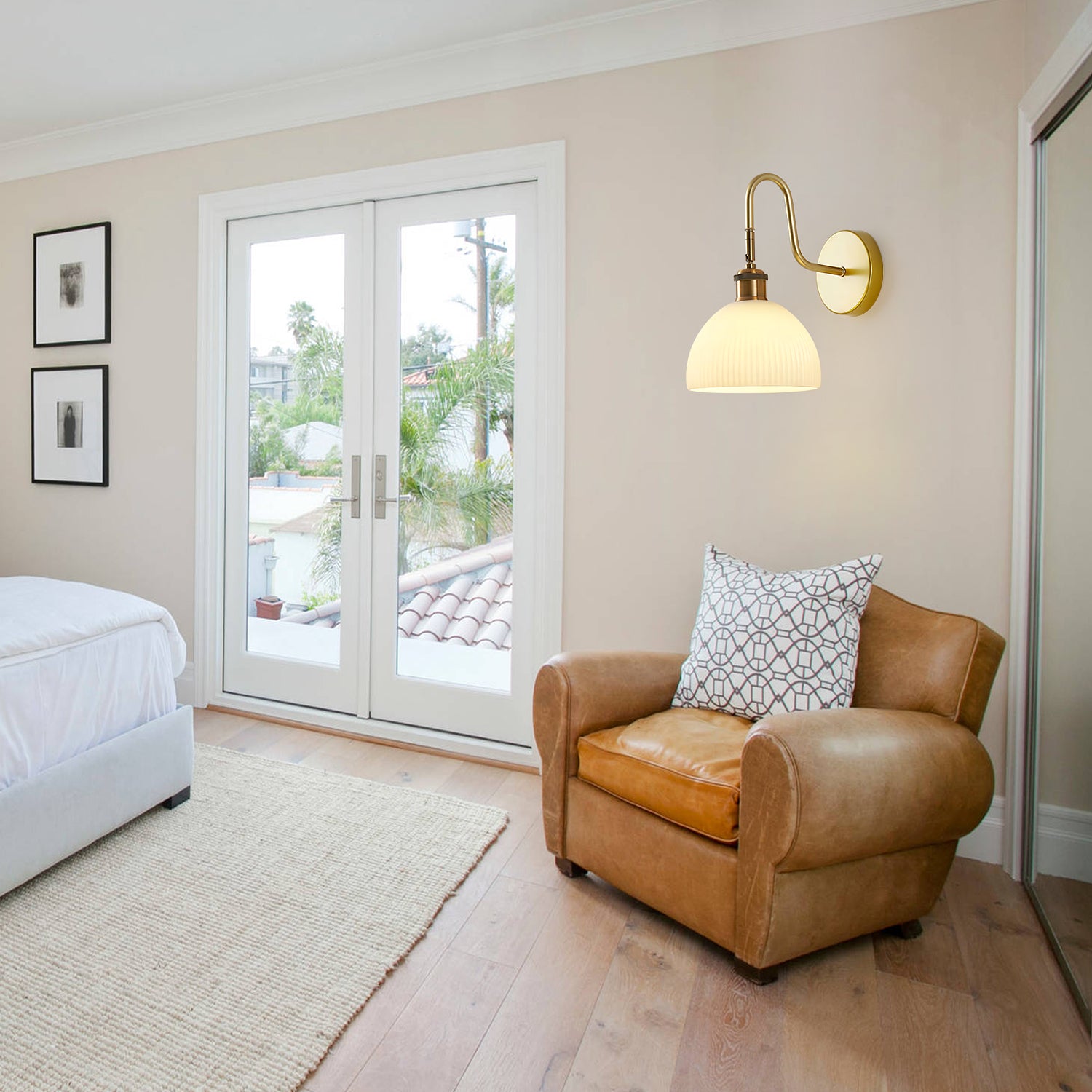 The Auri Glass Sconce combines warm golden tones with a sleek glass shade, creating a sophisticated interplay of light and form. Its minimalist design and refined materials make it an elegant addition to hallways, bedrooms, or living spaces. Perfect for modern and transitional interiors, it casts a soft, ambient glow that enhances any room with timeless charm.