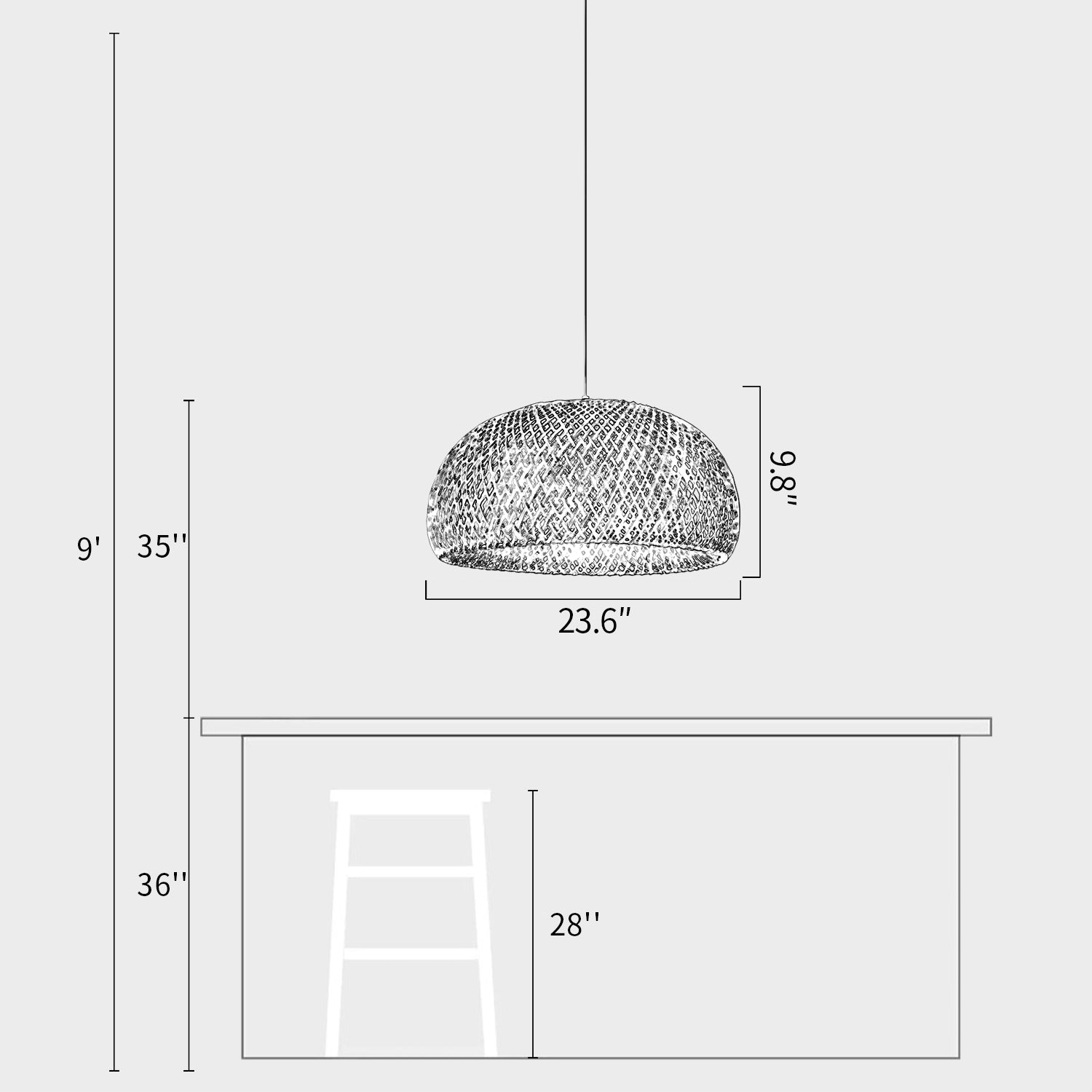 We provide 150 cm / 59 inches of hanging wire. It can be extended upon request.