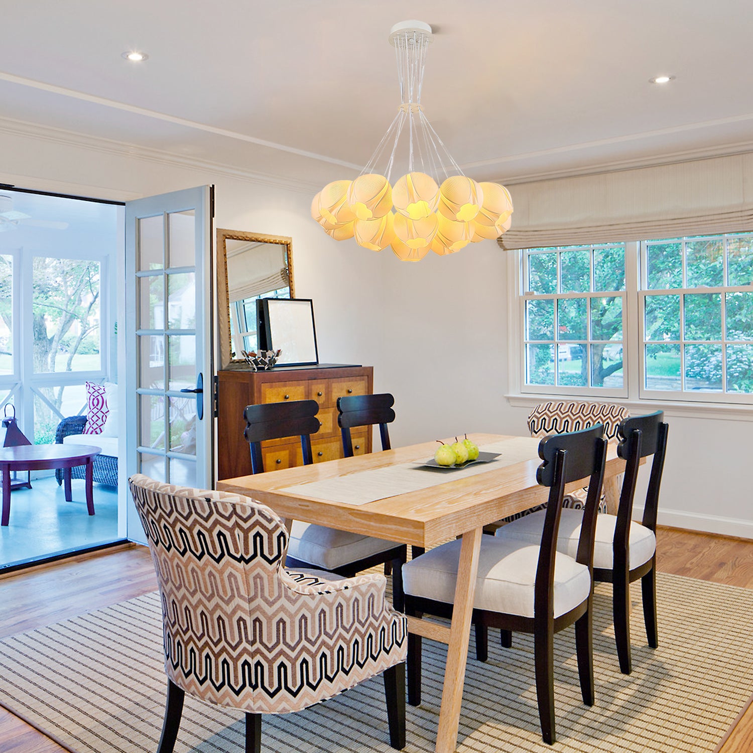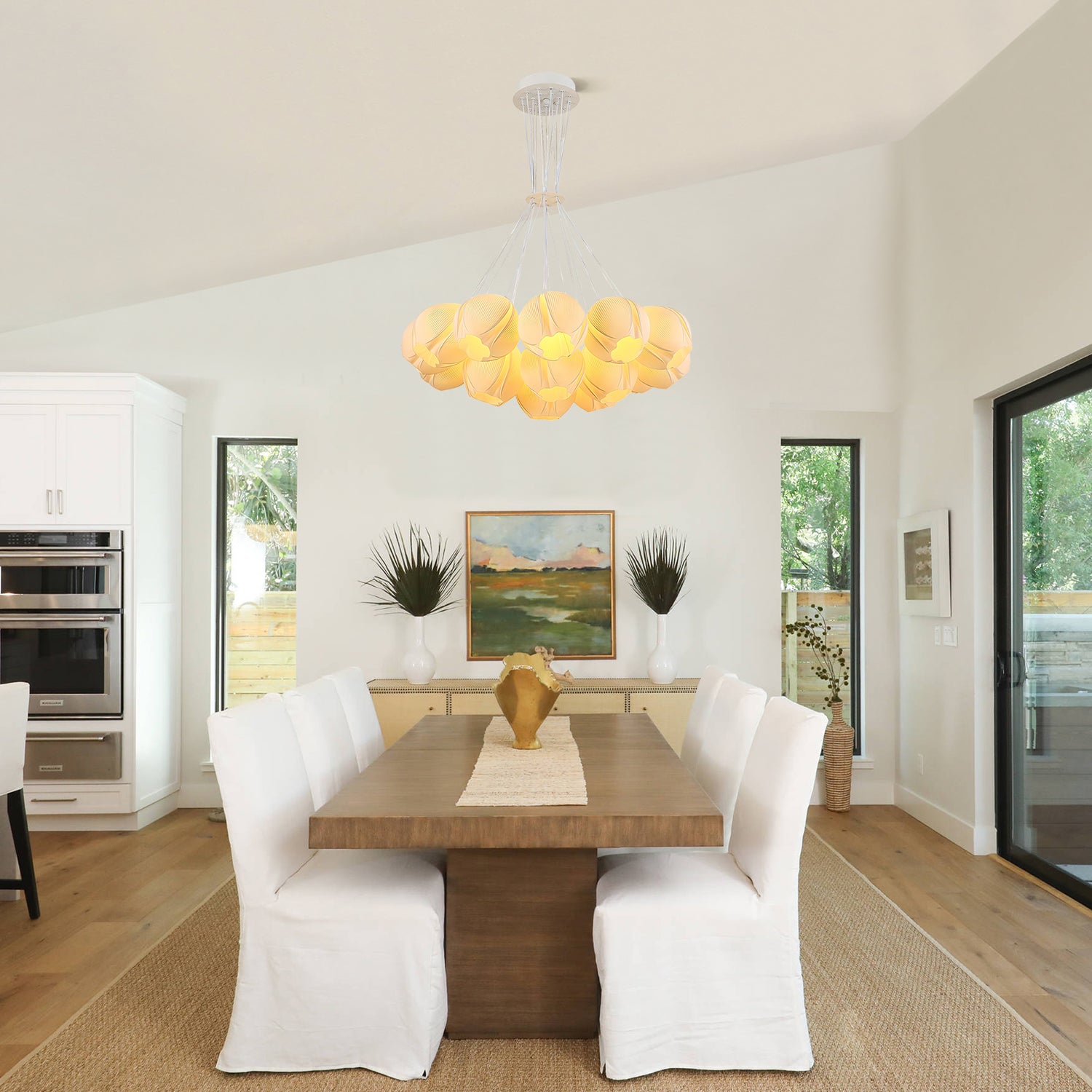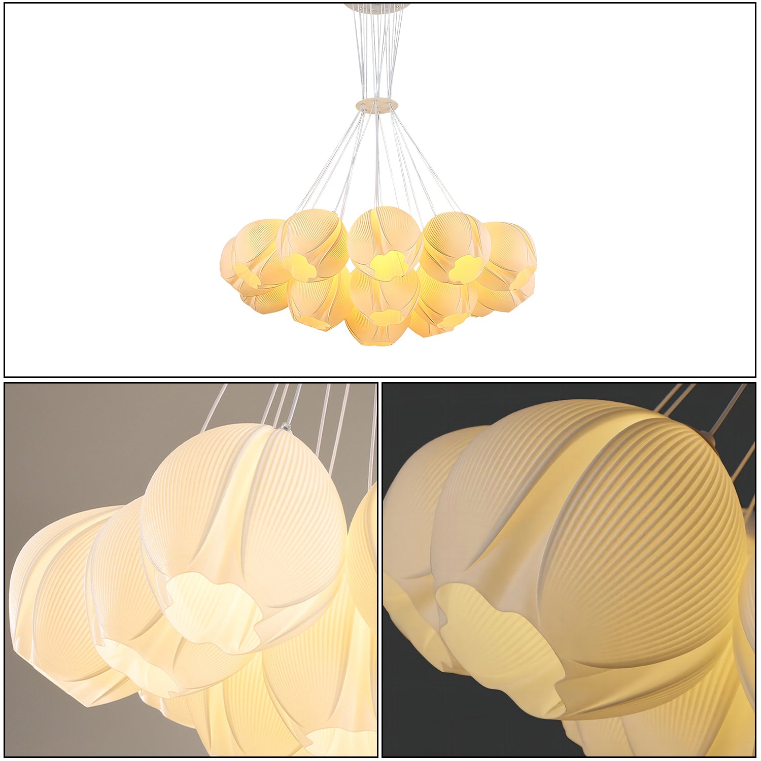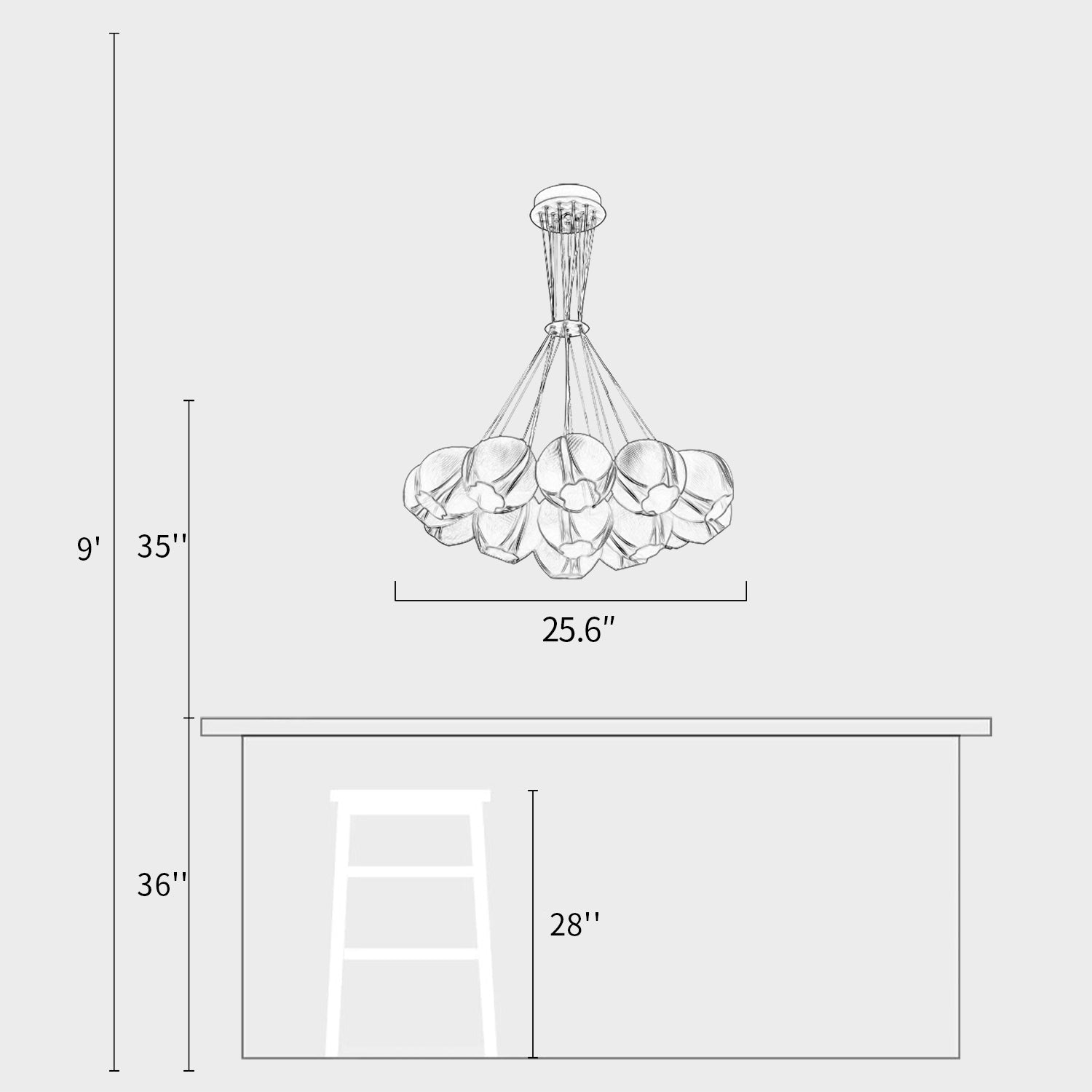 The Bud Bouquet Chandelier features a cluster-style arrangement of molded shades designed to provide soft, diffused lighting. Its suspended structure offers balanced illumination suitable for dining areas, living rooms, or shared spaces. Made with lightweight materials and a neutral finish, it integrates easily with a range of interior styles. This fixture uses standard bulbs and is designed for straightforward ceiling installation.
