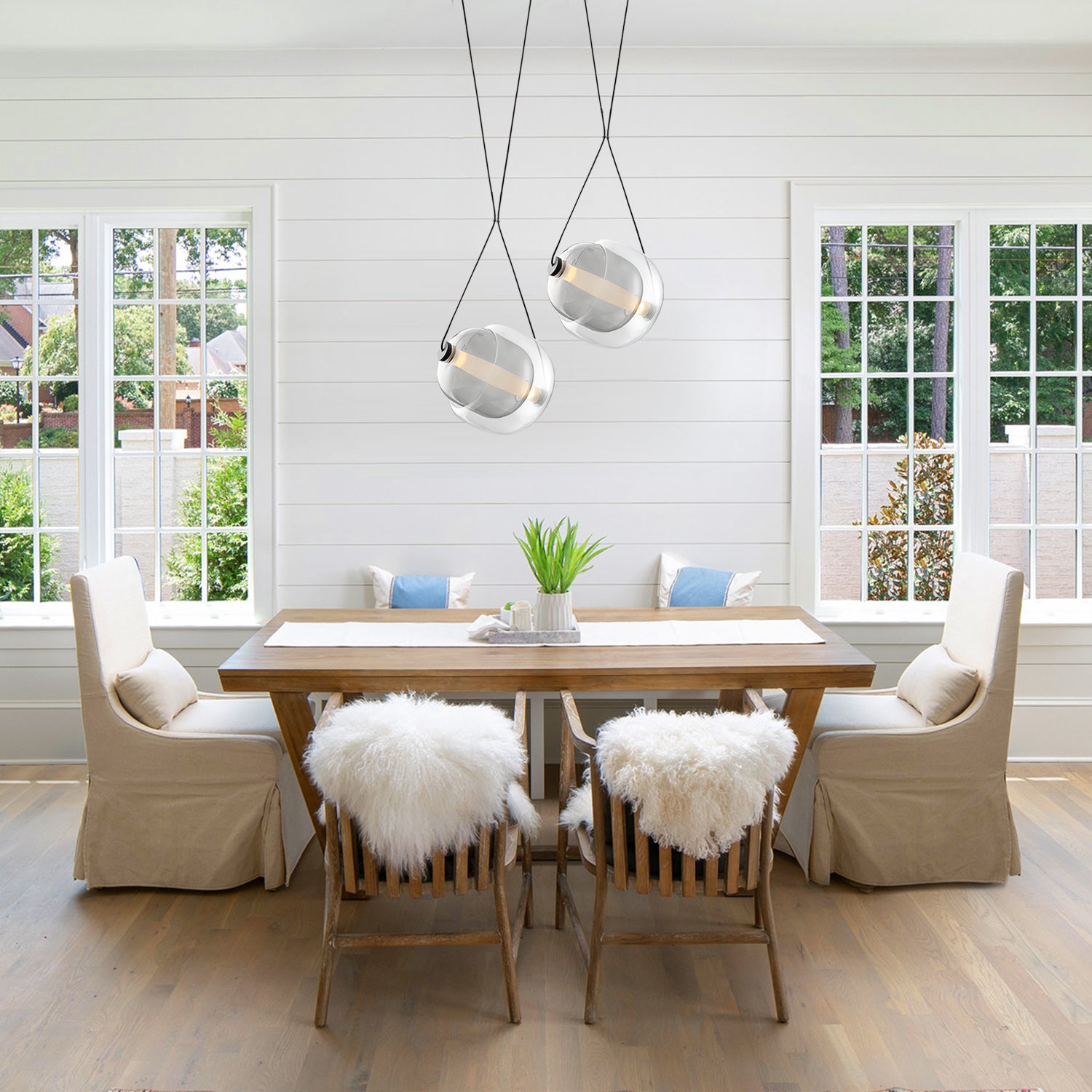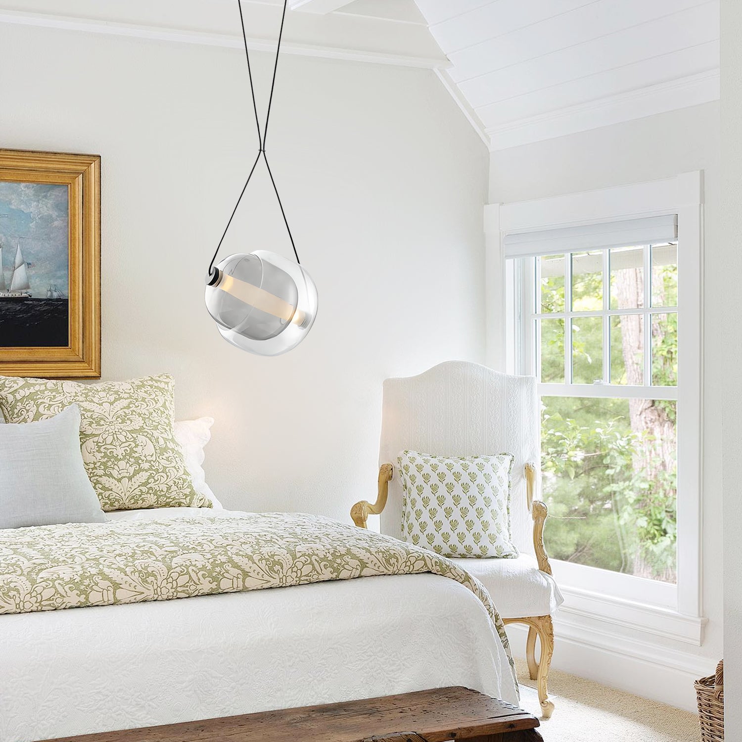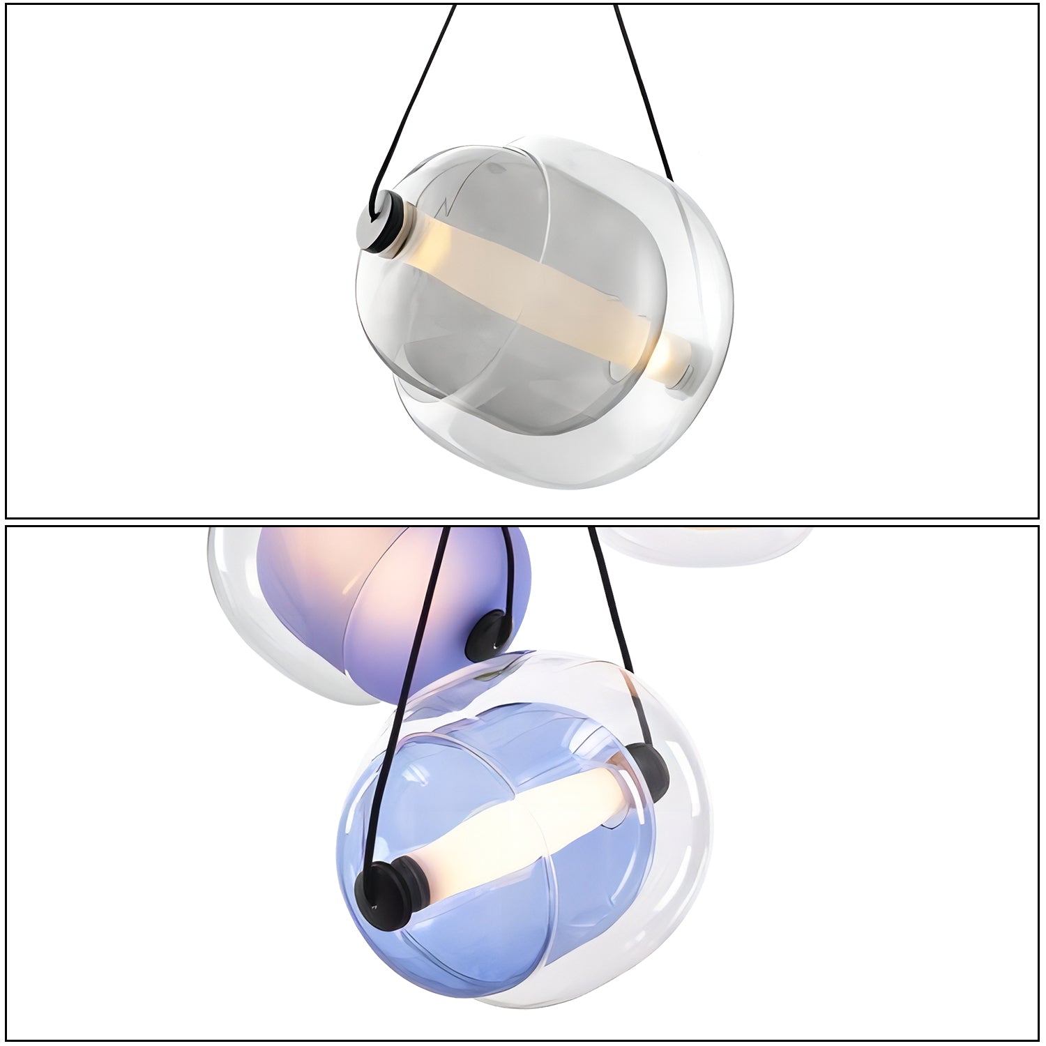 The Capsule Pendant Light features a glass shade with a capsule-like form and a suspended design. The light source is enclosed within the colored inner section, creating a layered look. This fixture is suitable for dining areas, living rooms, or other indoor spaces and can coordinate with different interior styles.