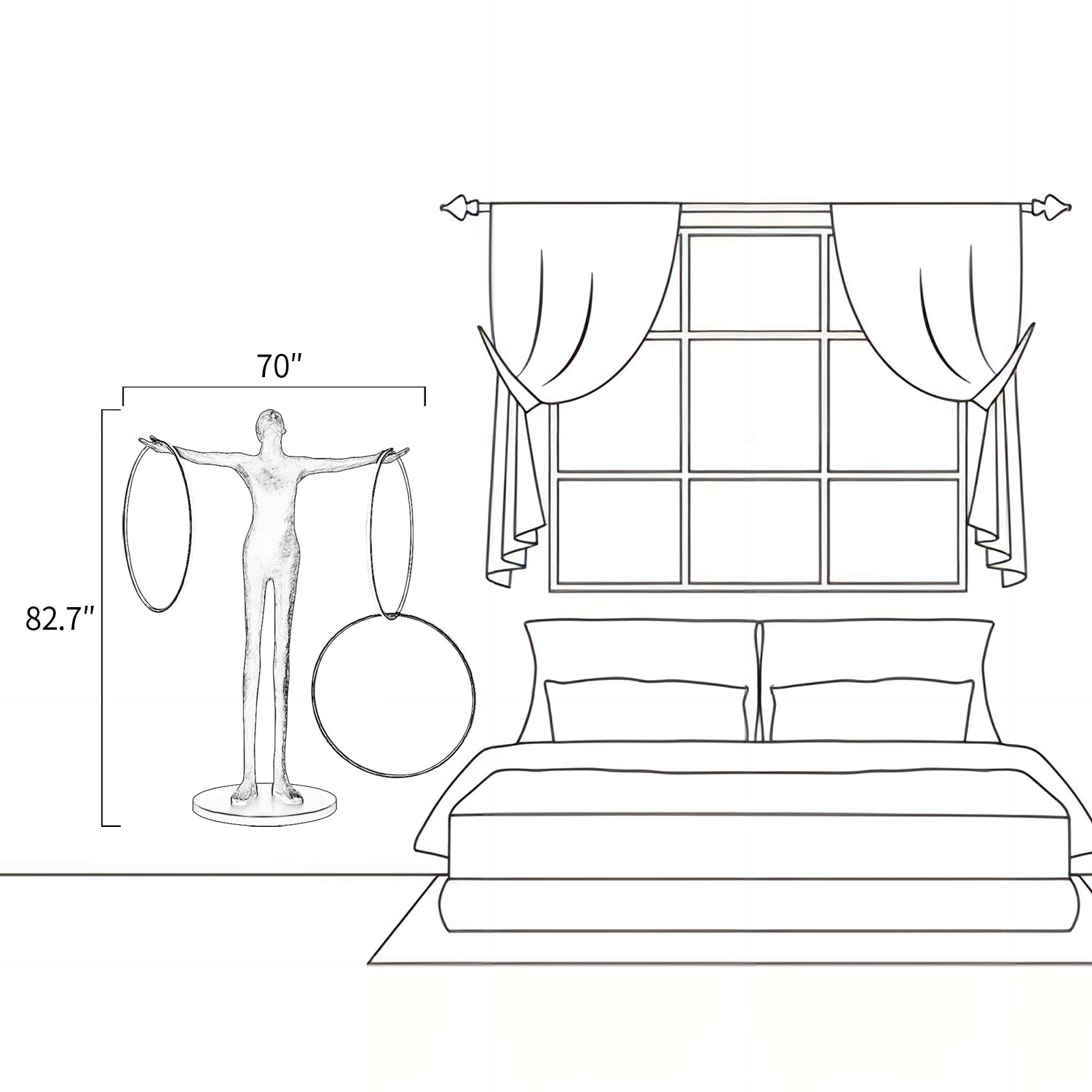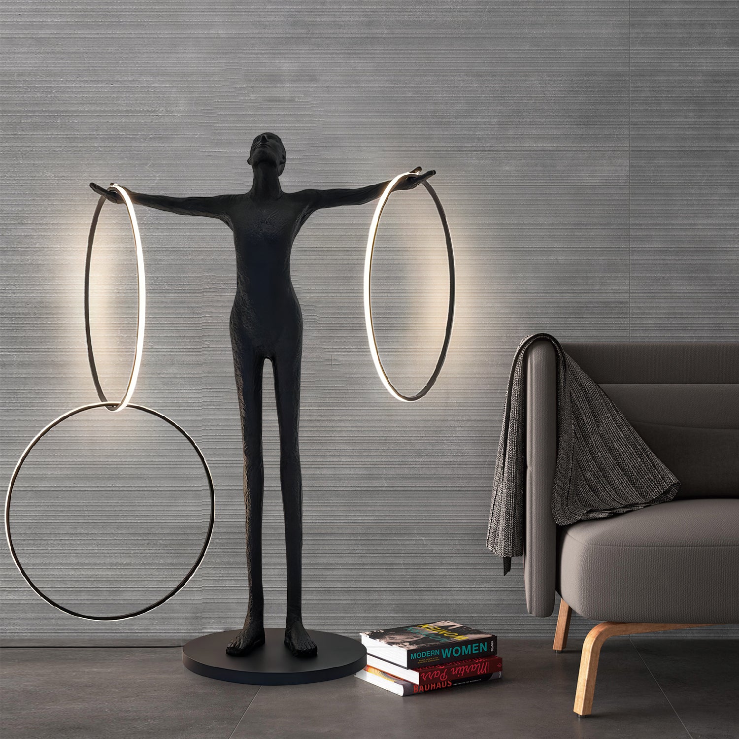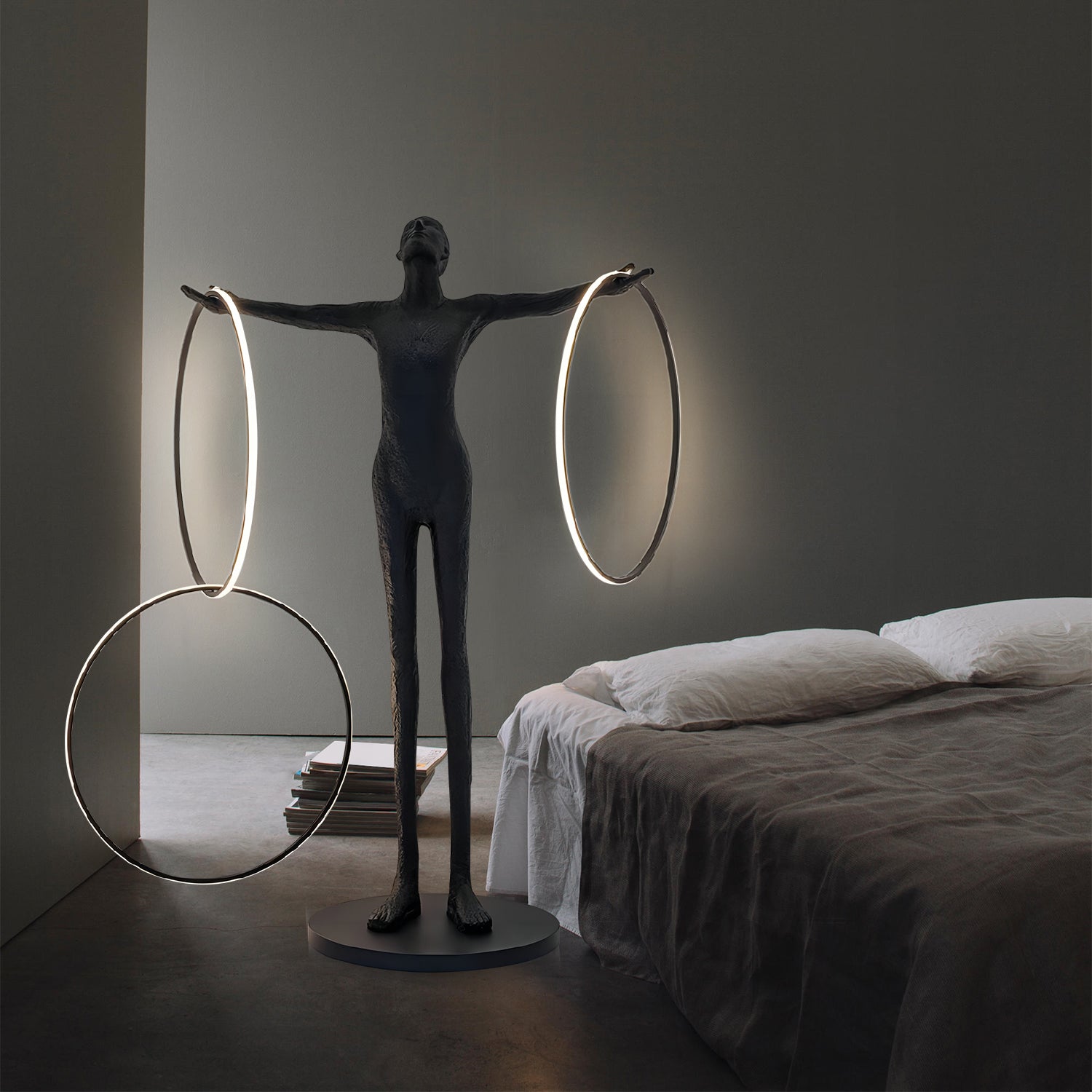 The Circulo Floor Lamp features a sculptural human figure design with two circular light elements. Made from resin and metal, it provides both decorative presence and functional lighting. The lamp stands on a stable round base, making it suitable for placement in living rooms, hallways, or offices. Its design combines lighting with artistic form, offering a practical option for interiors that appreciate modern aesthetics