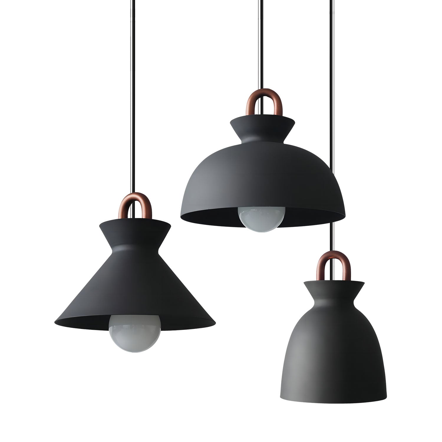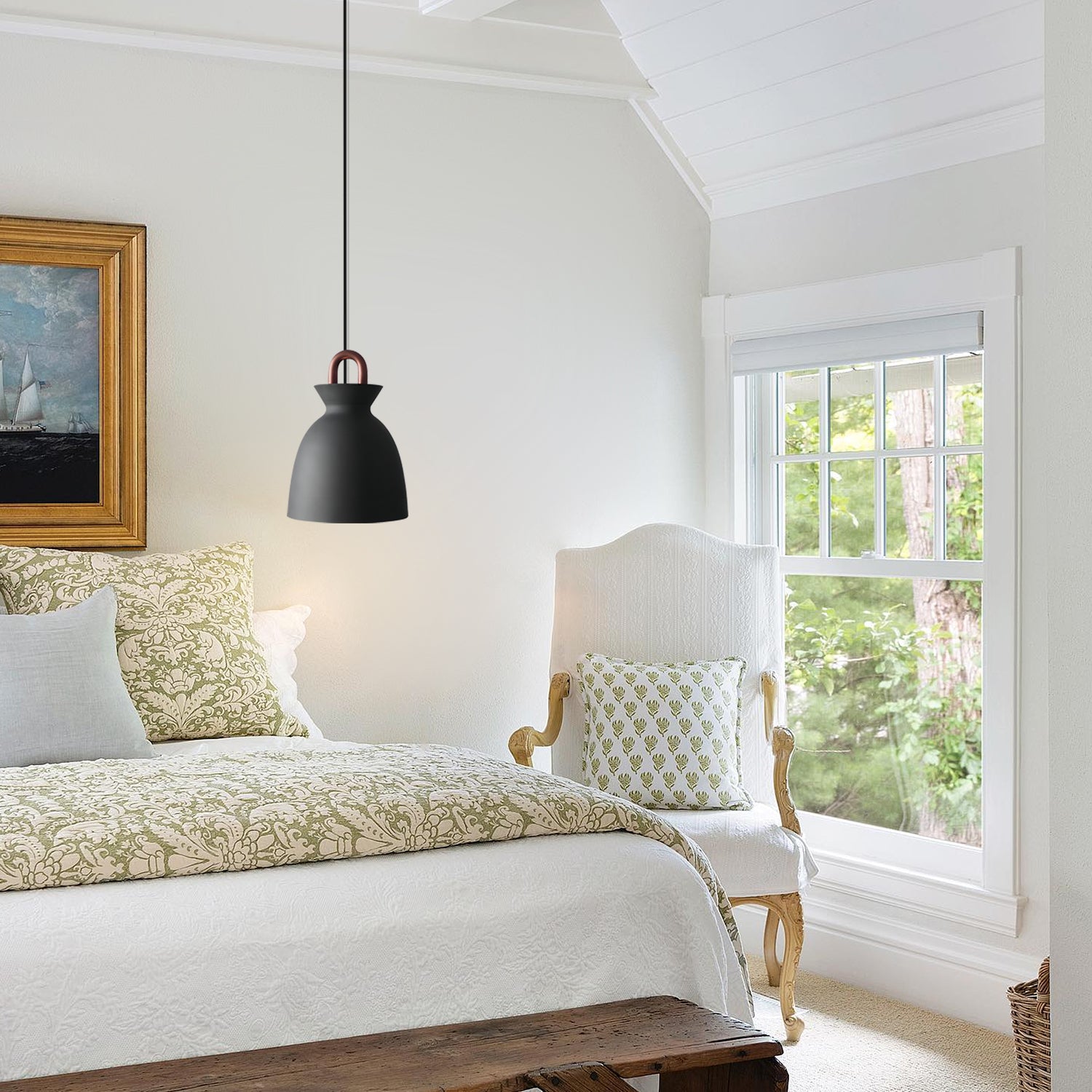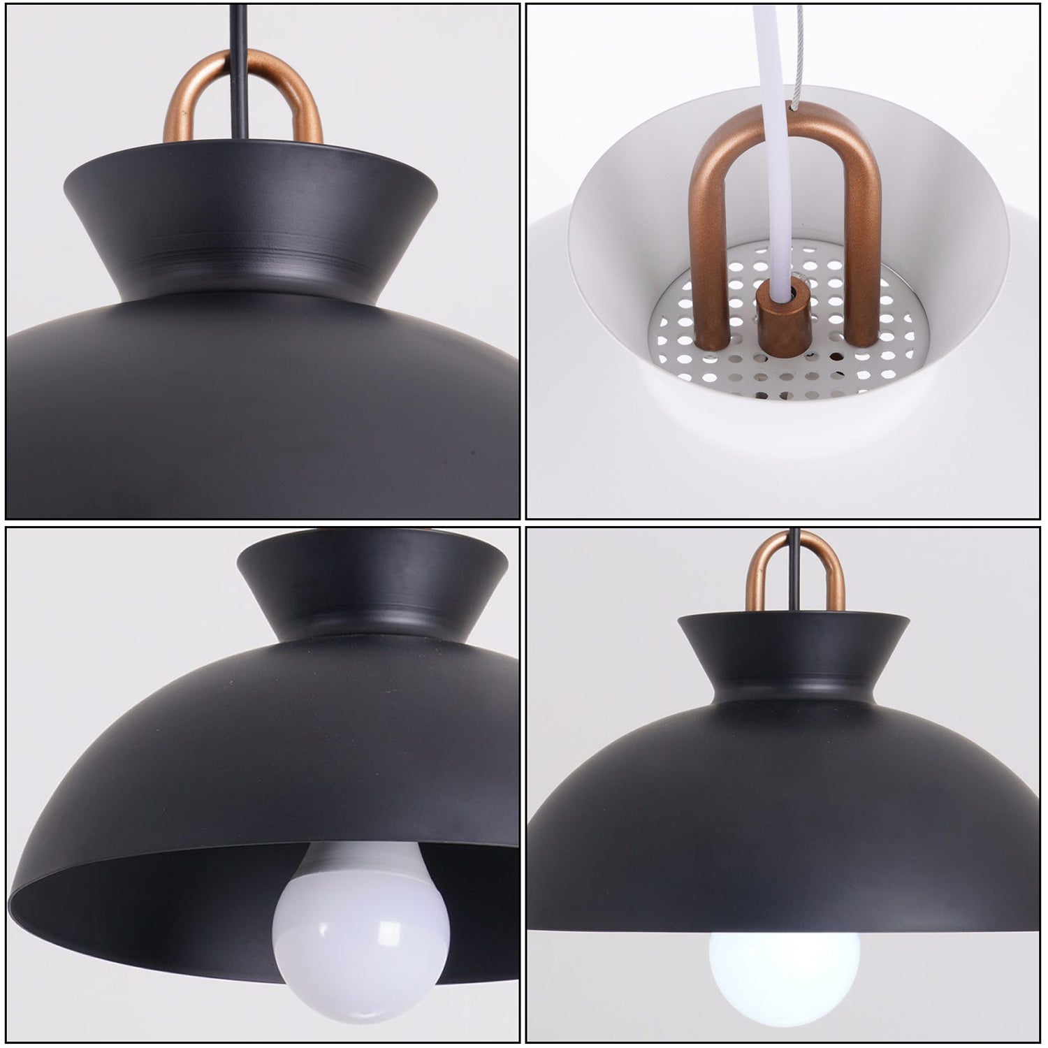 The Coil Pendant Light features a design that blends clean lines with subtle retro-inspired elements. Using a black and white color palette, it offers a balanced, understated look suitable for various interior styles. Its neutral design allows it to complement bedrooms, dining areas, or living rooms.