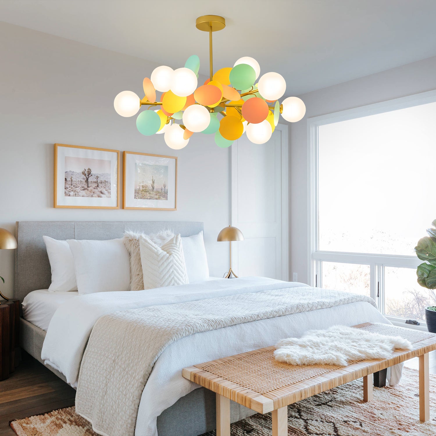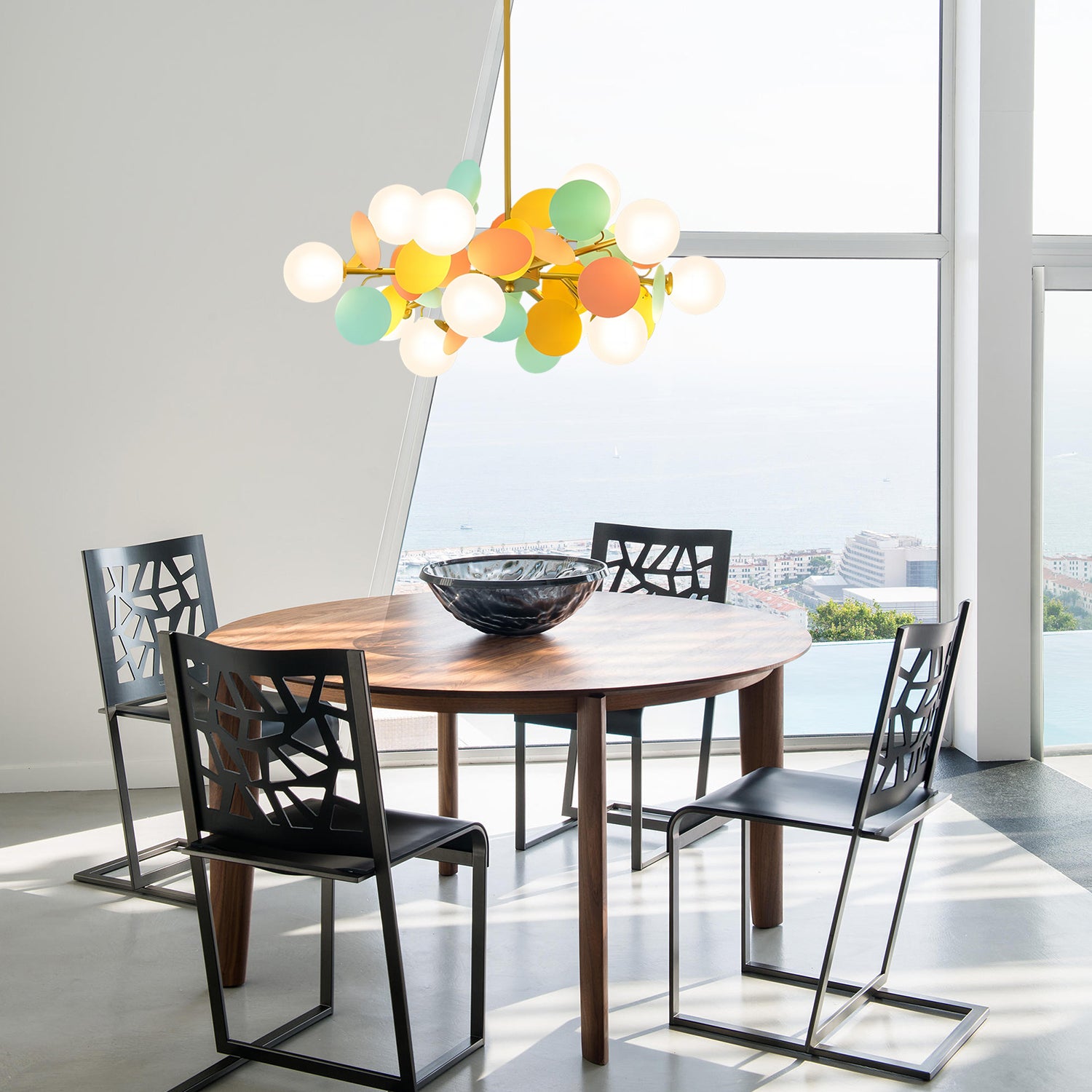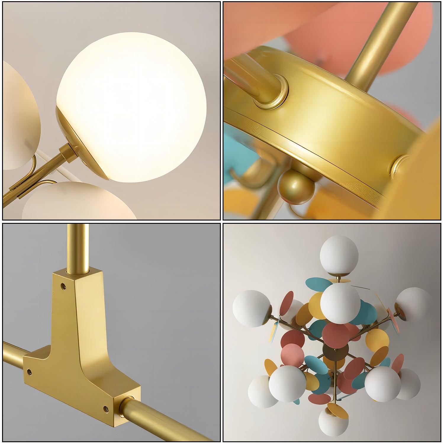The Creative Glass Chandelier features glass globes paired with colored decorative panels, creating a playful yet balanced design. A sturdy metal frame provides stability and support. Its modern style makes it suitable for living rooms, dining areas, or bedrooms. The chandelier delivers soft, diffused lighting to help create a comfortable atmosphere.
