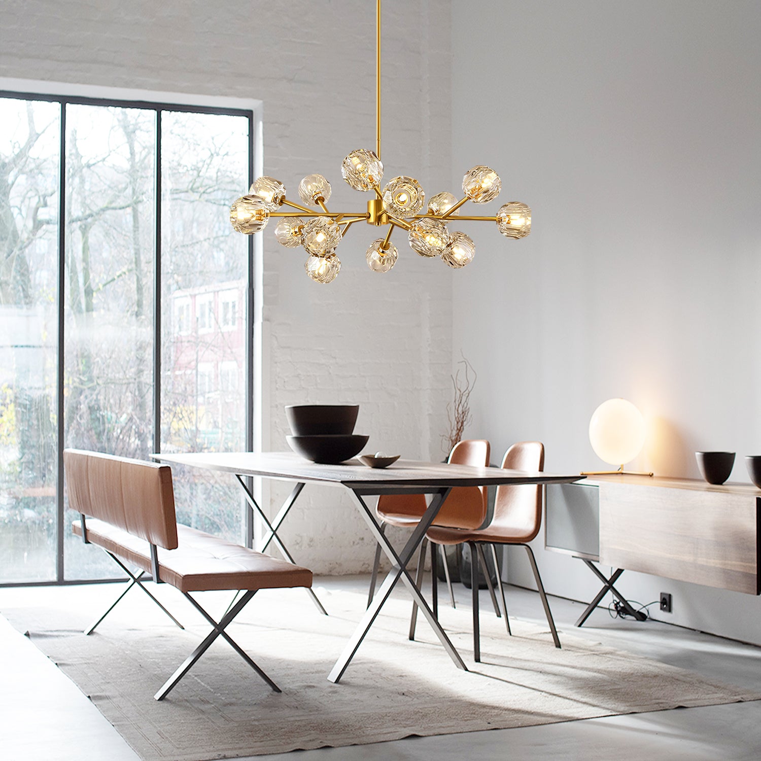 The Crystal Ball Cluster Chandelier features multiple glass ball shades arranged on a gold-finished frame. Its round cluster design provides balanced lighting and a modern appearance. Suitable for living rooms, dining areas, bedrooms, or entryways, this ceiling light combines practical illumination with a simple decorative style.
