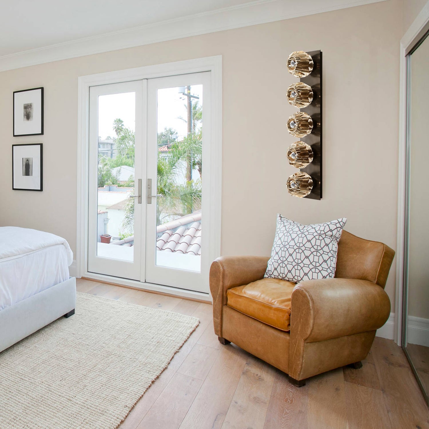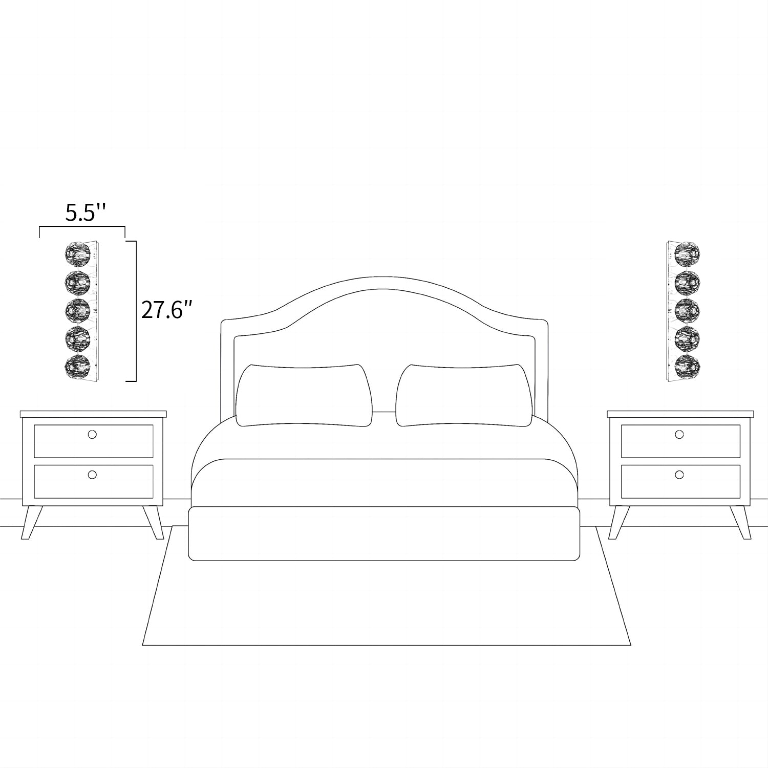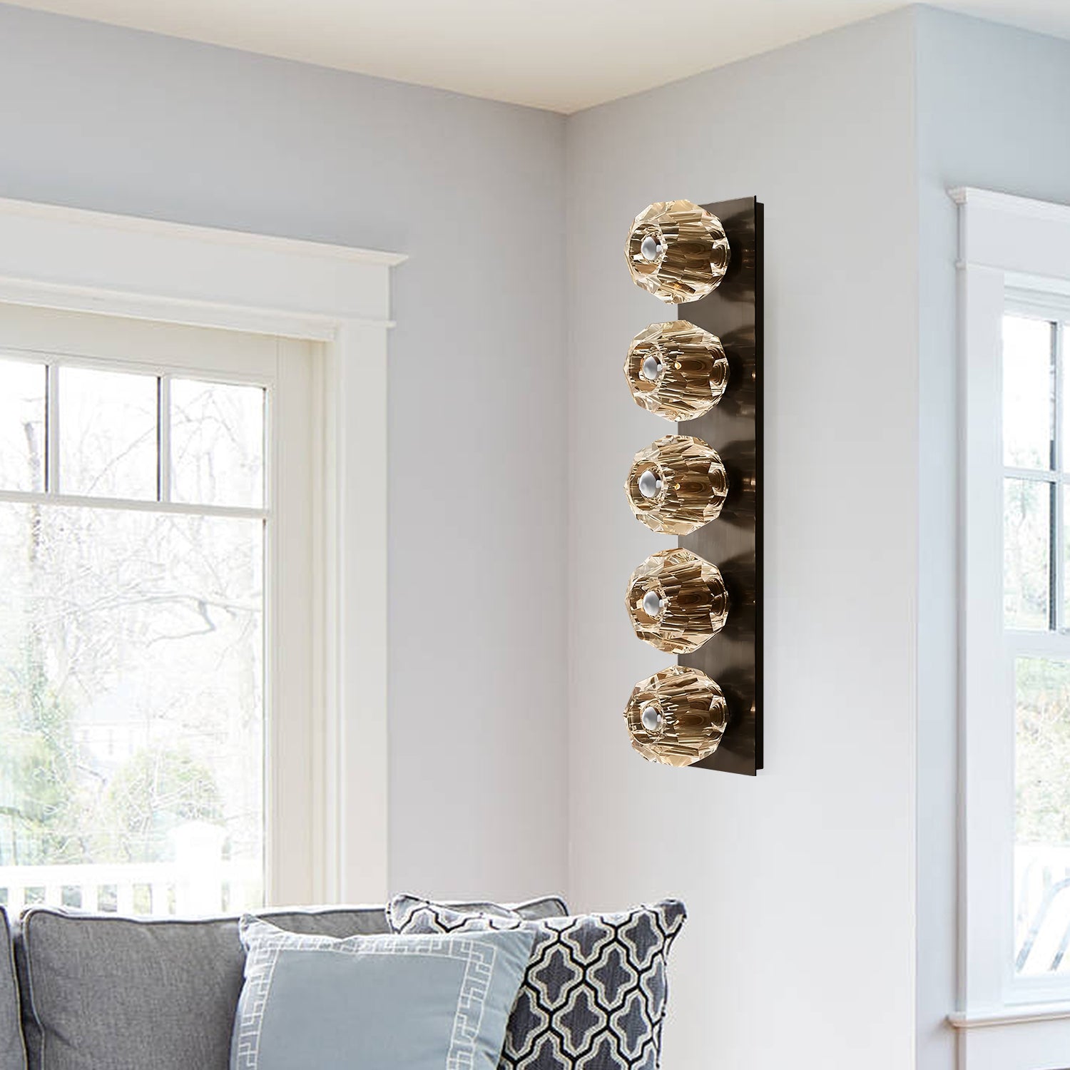 The Crystal Ball Wall Sconce features a vertical metal base with five faceted crystal spheres that encase the light sources. The clear crystal surface helps diffuse the light while showing the bulb inside. Designed for wall mounting, it is suitable for hallways, living rooms, or other indoor areas.
