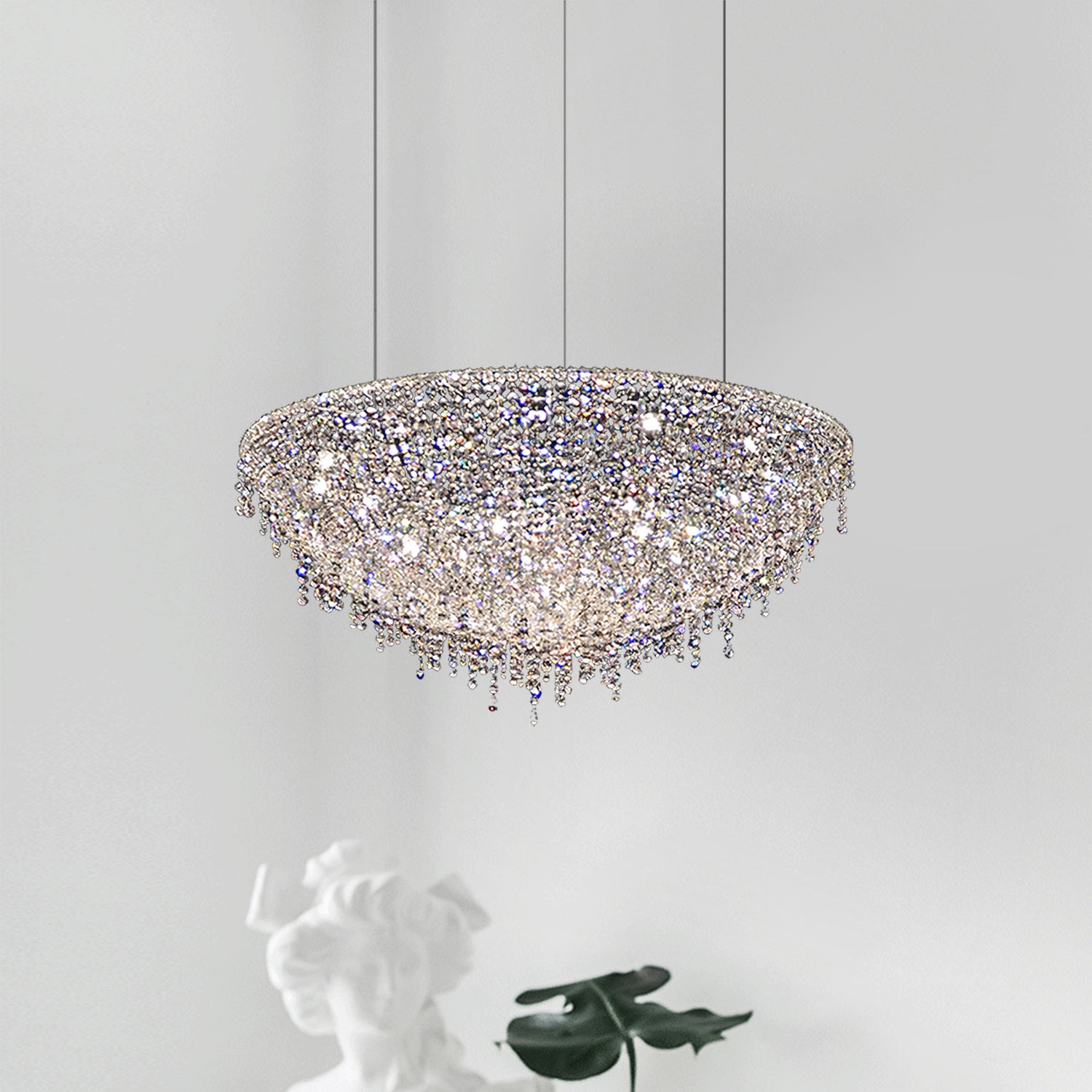 The Crystal Dome Ambient Chandelier features a dome-shaped frame adorned with multiple crystal beads. Each crystal reflects light softly, creating a comfortable and balanced illumination. This chandelier is suitable for dining areas, living rooms, or entryways, adding a refined decorative element to contemporary or classic interiors.