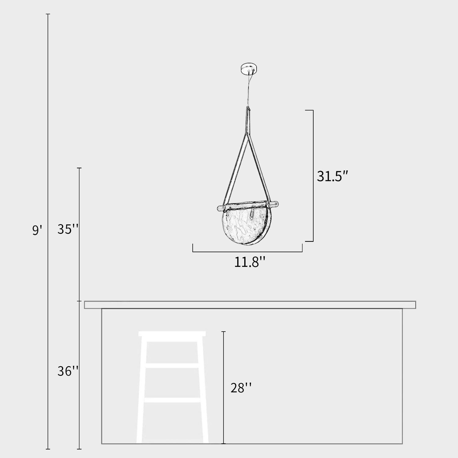 We provide 150 cm / 59 inches of hanging wire. It can be extended upon request.