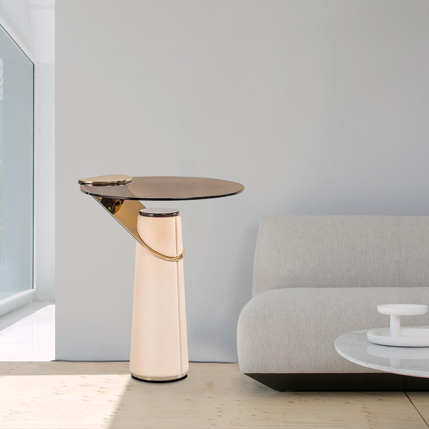 The Eclipse Side Table features a modern structure with a combination of metal, glass, and a stable base. The tabletop is made of tinted glass, offering a smooth and clean surface for everyday use. The supporting metal element provides a simple geometric form that connects the glass top with the base. The lower section is designed with a solid cylindrical shape to keep the table steady.