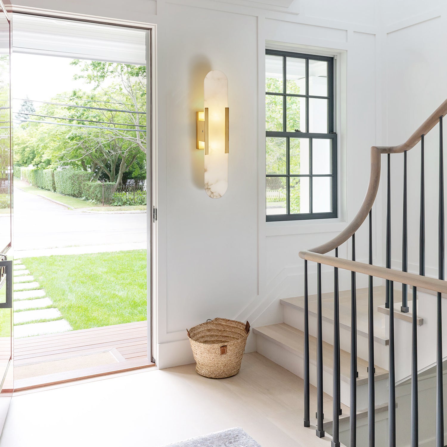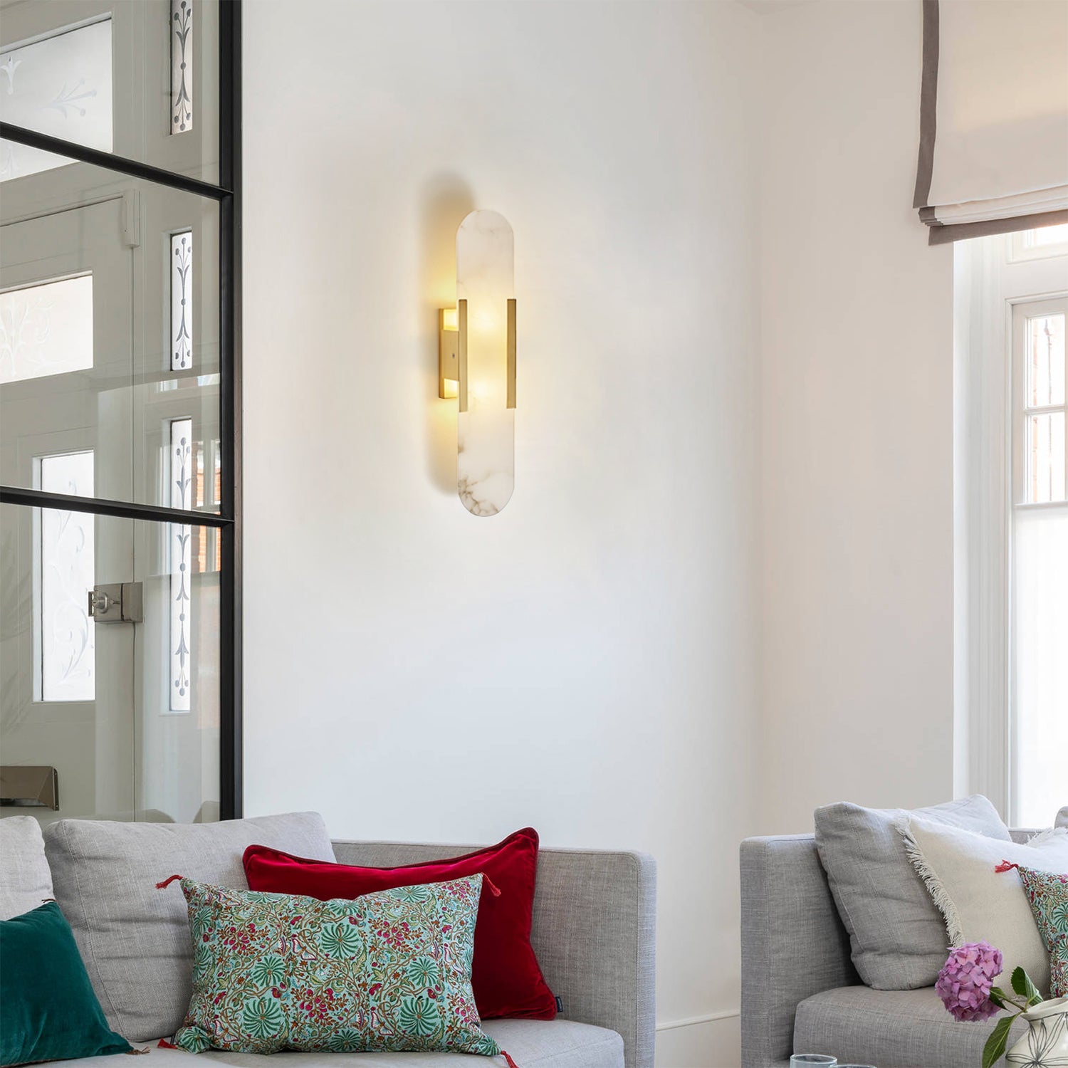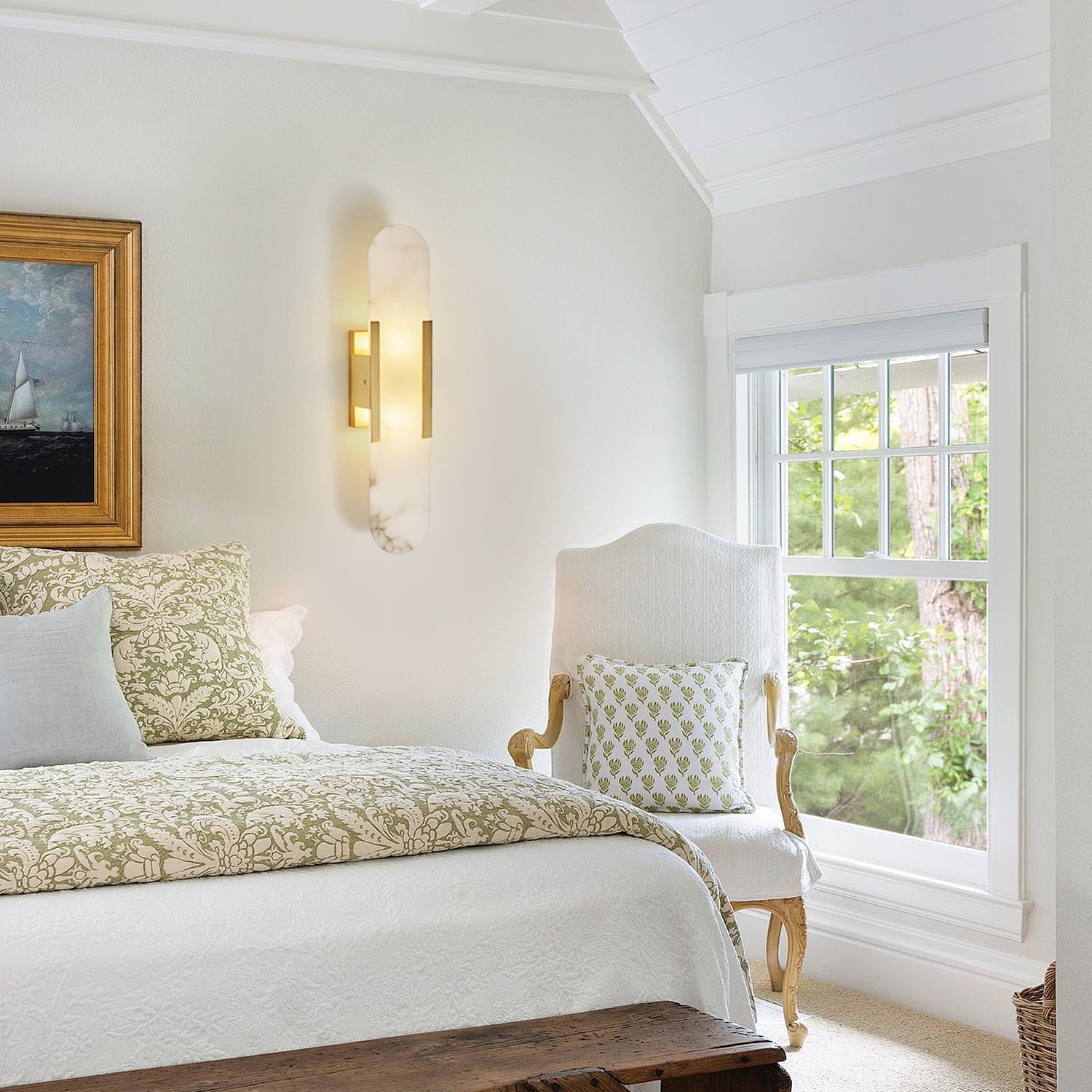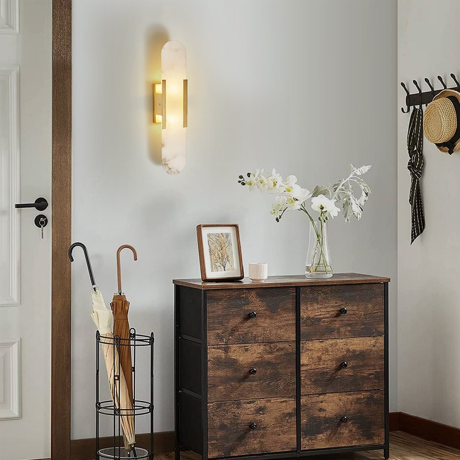 The Elongated Alabaster Sconce features a distinct natural marble pattern that is both vivid and elegant, emitting a gentle, non-glare illumination. Its innovative design blends white alabaster with metal elements, delivering a compelling spatial presence.