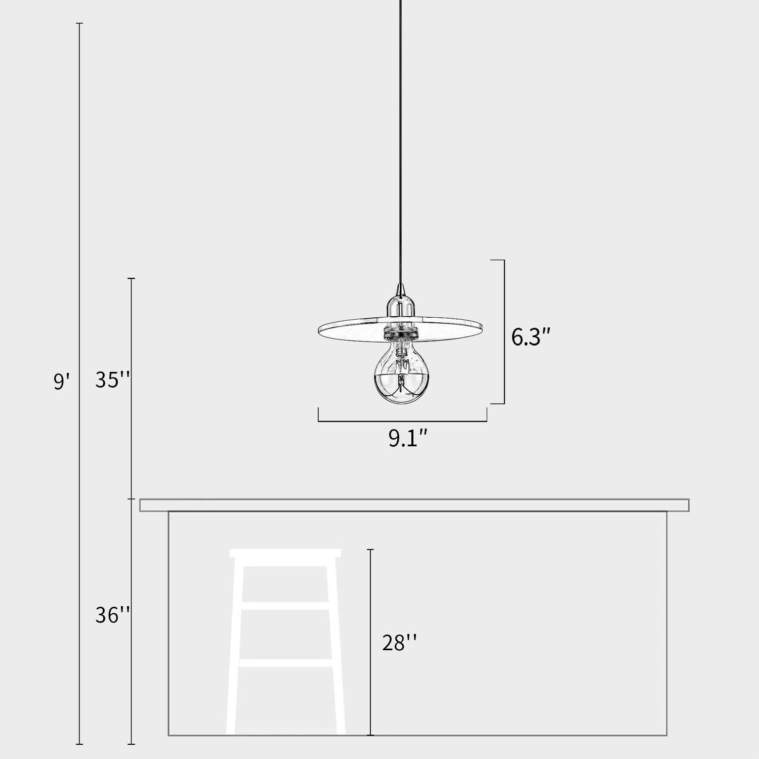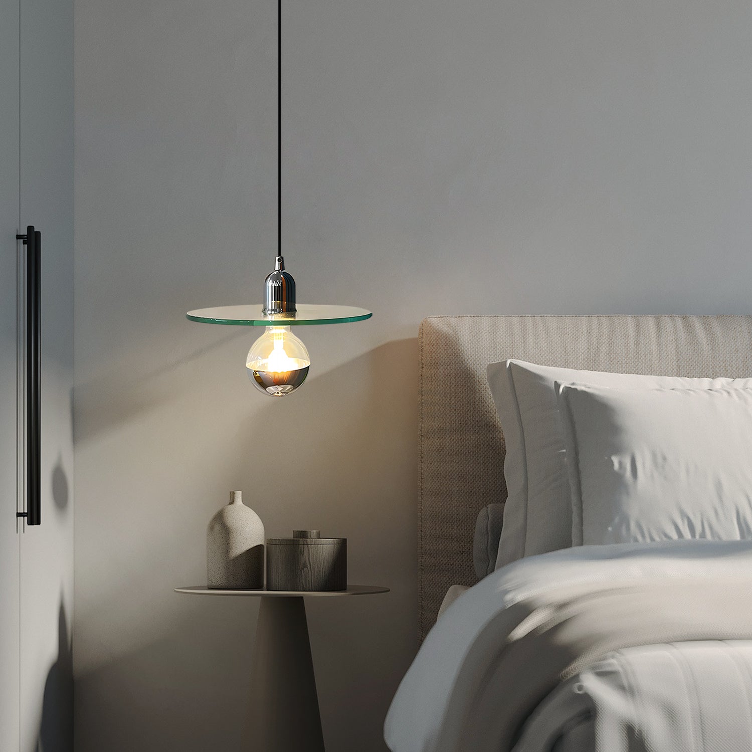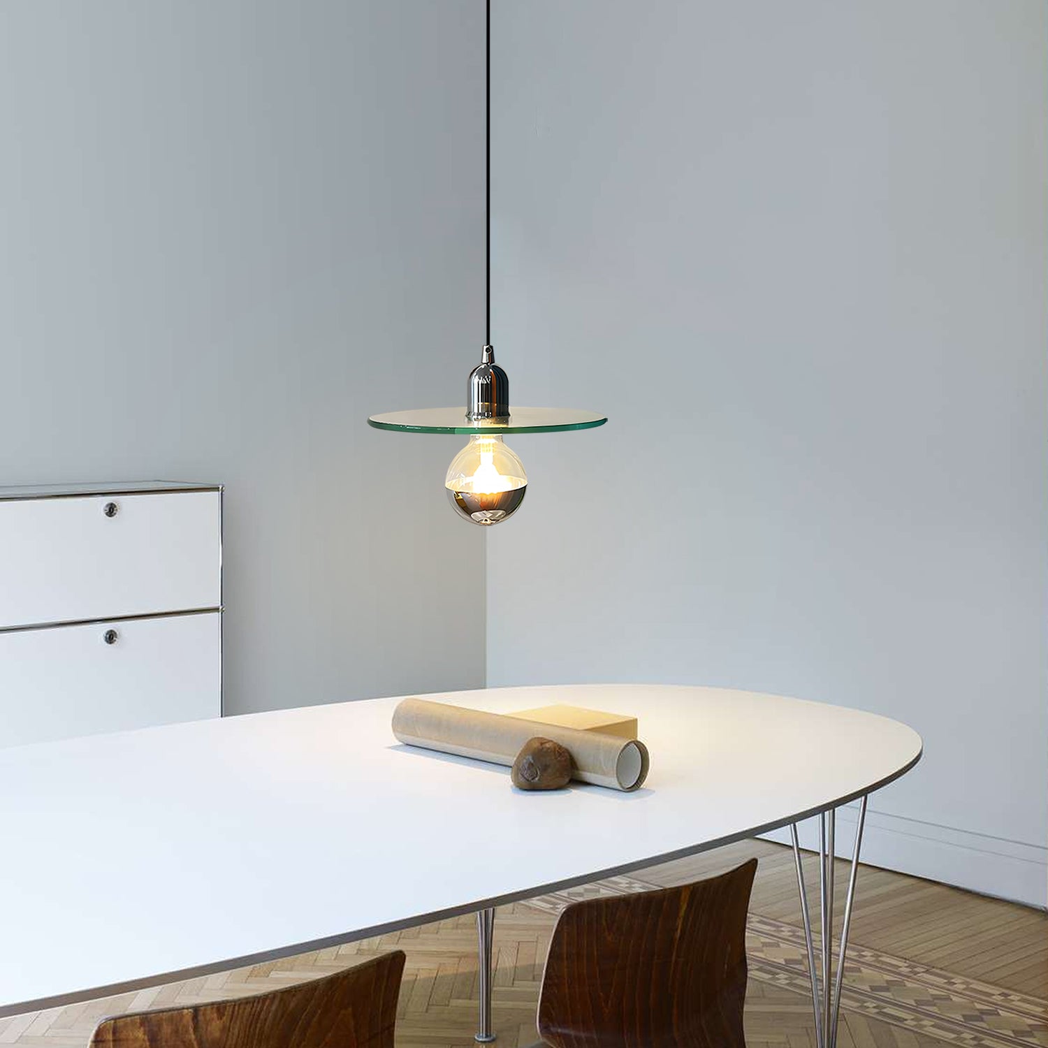 The Flat Glass Pendant Light features a round glass plate paired with a suspended bulb holder. Its simple structure provides direct lighting suitable for dining areas, entryways, or living spaces. The lamp uses a standard socket and hangs from an adjustable cable, making it easy to match different interior settings.