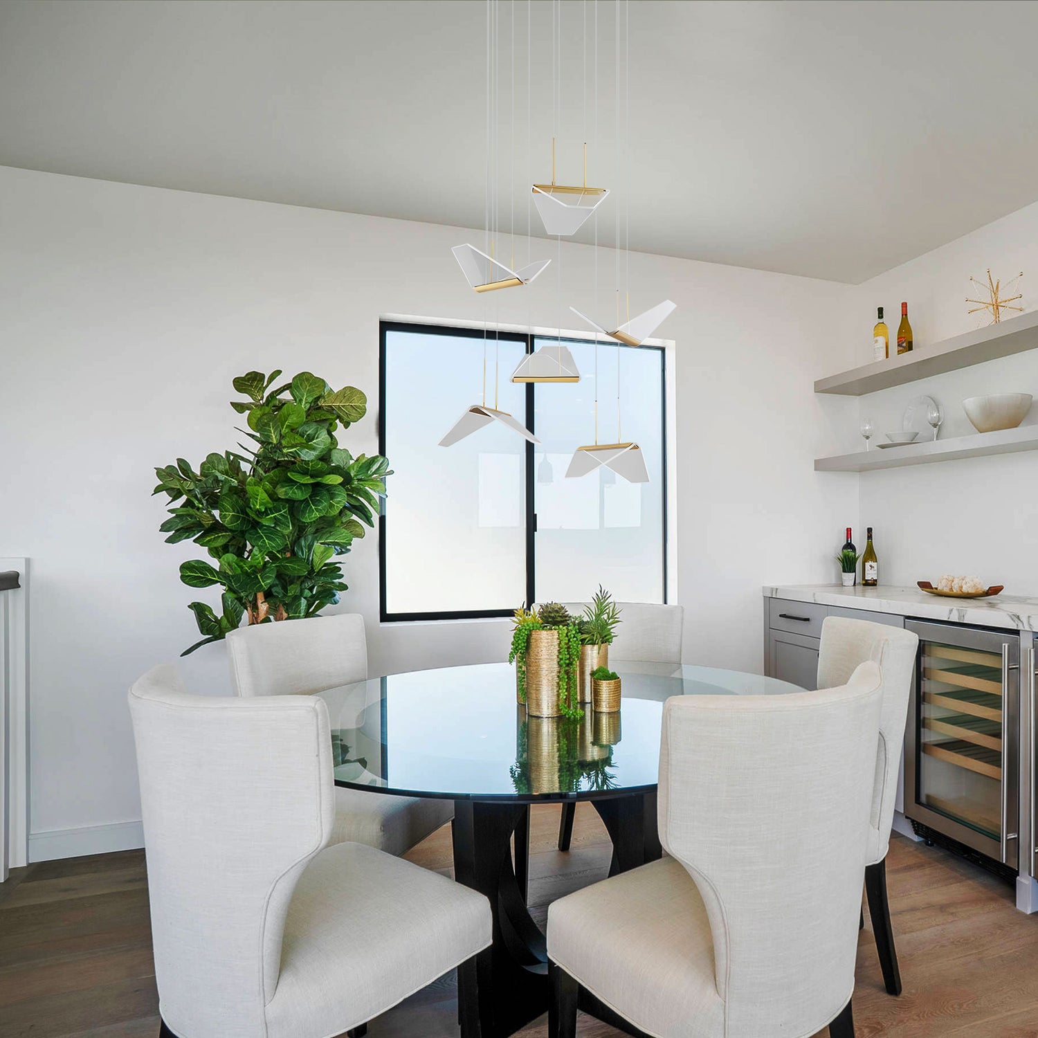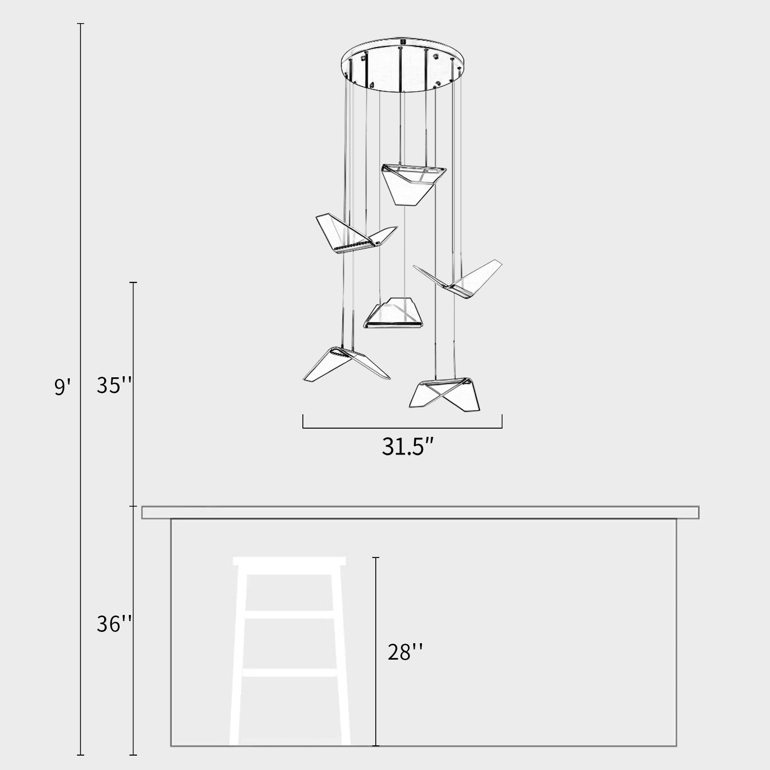 The FLY Origami Pendant Lamp features a series of folded acrylic shades that resemble graceful paper birds in flight. Supported by slim metal rods and adjustable cables, it provides soft and diffused lighting suitable for dining rooms, living spaces, or entryways. The design combines lightness and structure, offering a modern decorative accent that complements various interior styles.