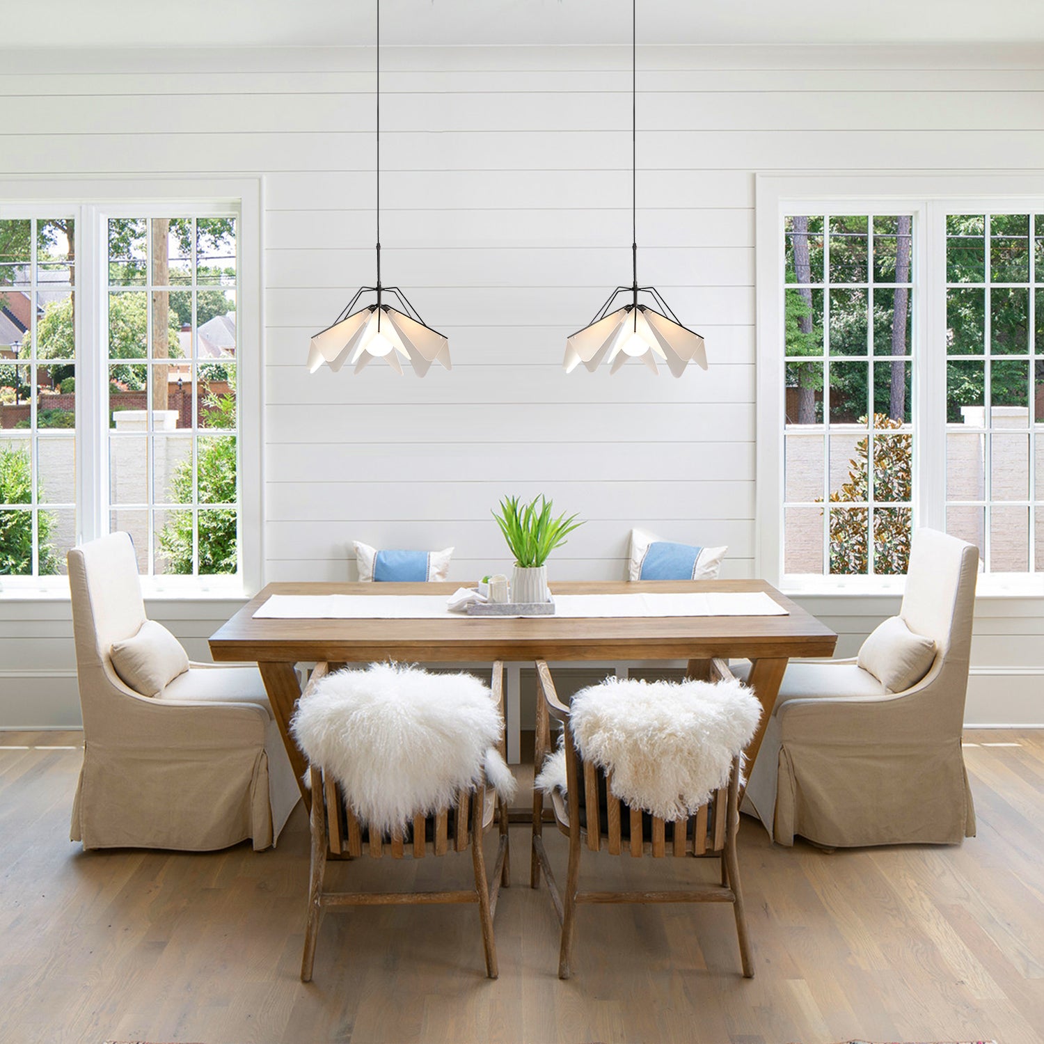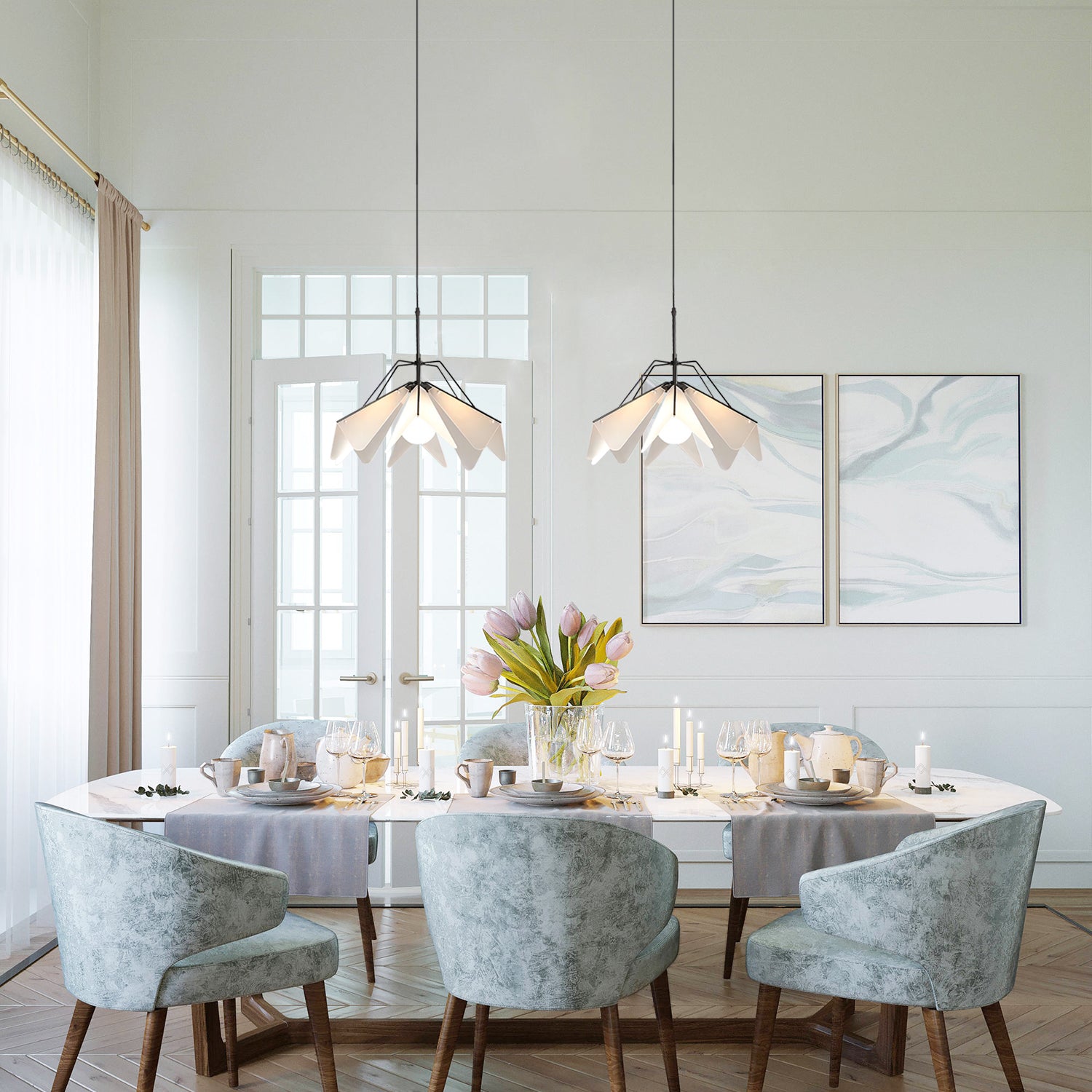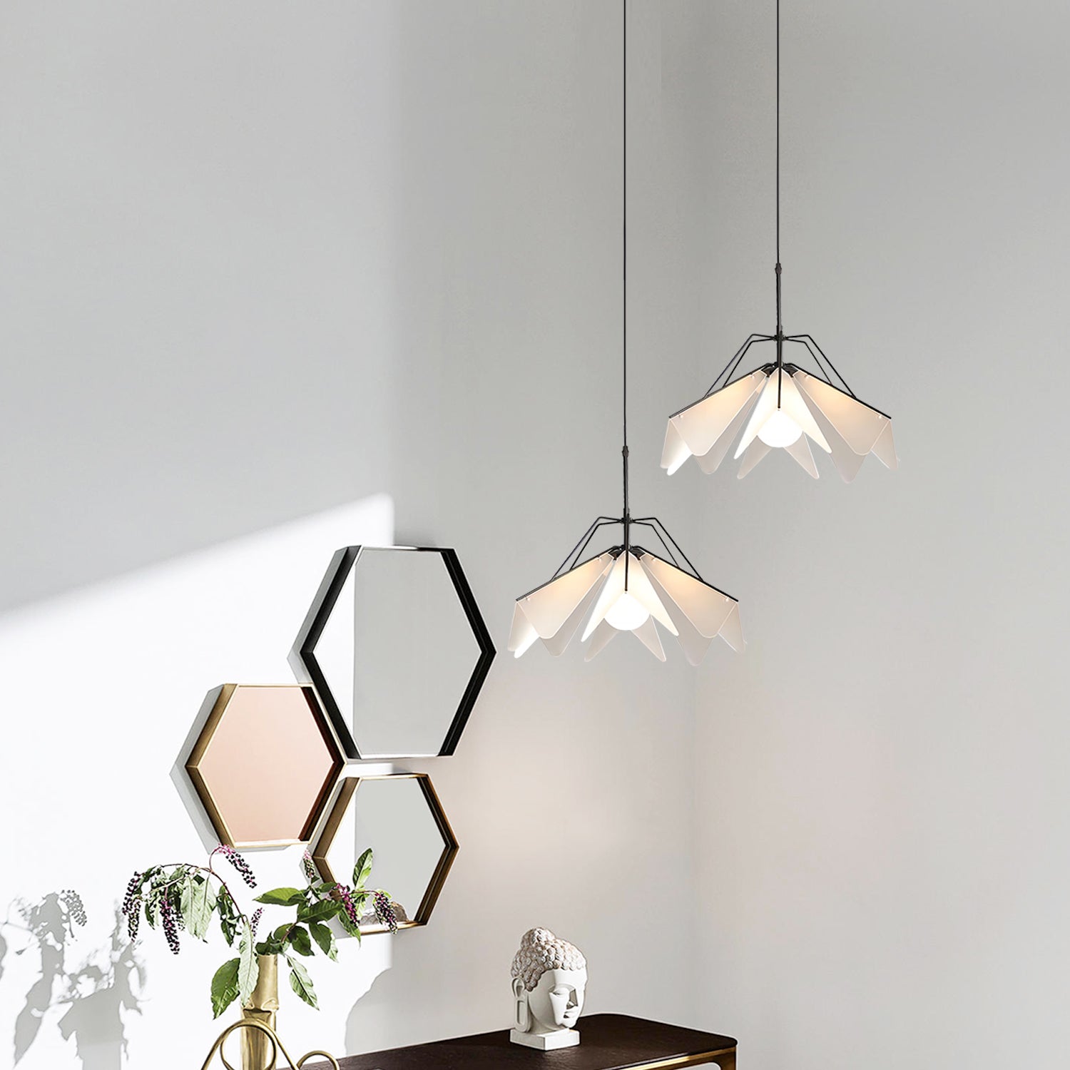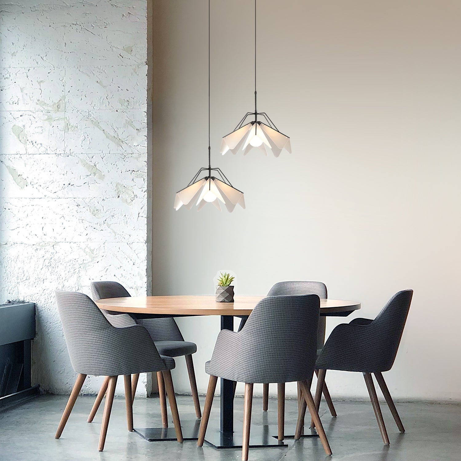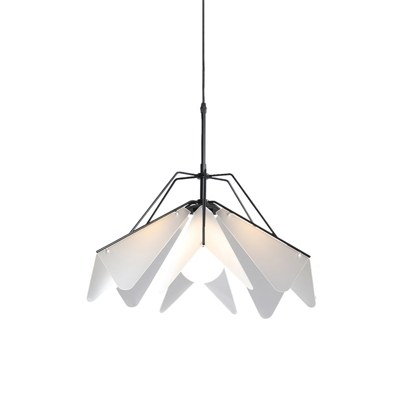 The Fold Petal Pendant Light features a petal-shaped design with folded panels that create a soft, diffused glow. Made with a metal frame and lightweight panels, it is suitable for dining rooms, living spaces, or bedrooms.