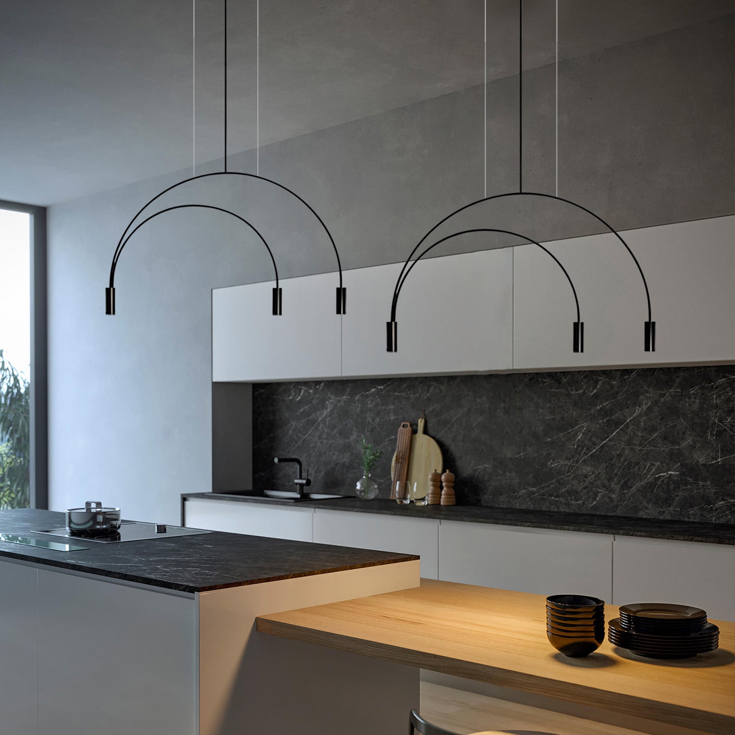 The Geometric Line Pendant Light features a linear metal frame with a curved geometric structure designed for ceiling installation. It provides focused illumination suitable for dining areas, kitchen islands, or modern interior spaces. The fixture is constructed from metal components and is suspended by an adjustable cord to accommodate different ceiling heights. It supports standard LED-compatible bulbs and is intended for indoor use.