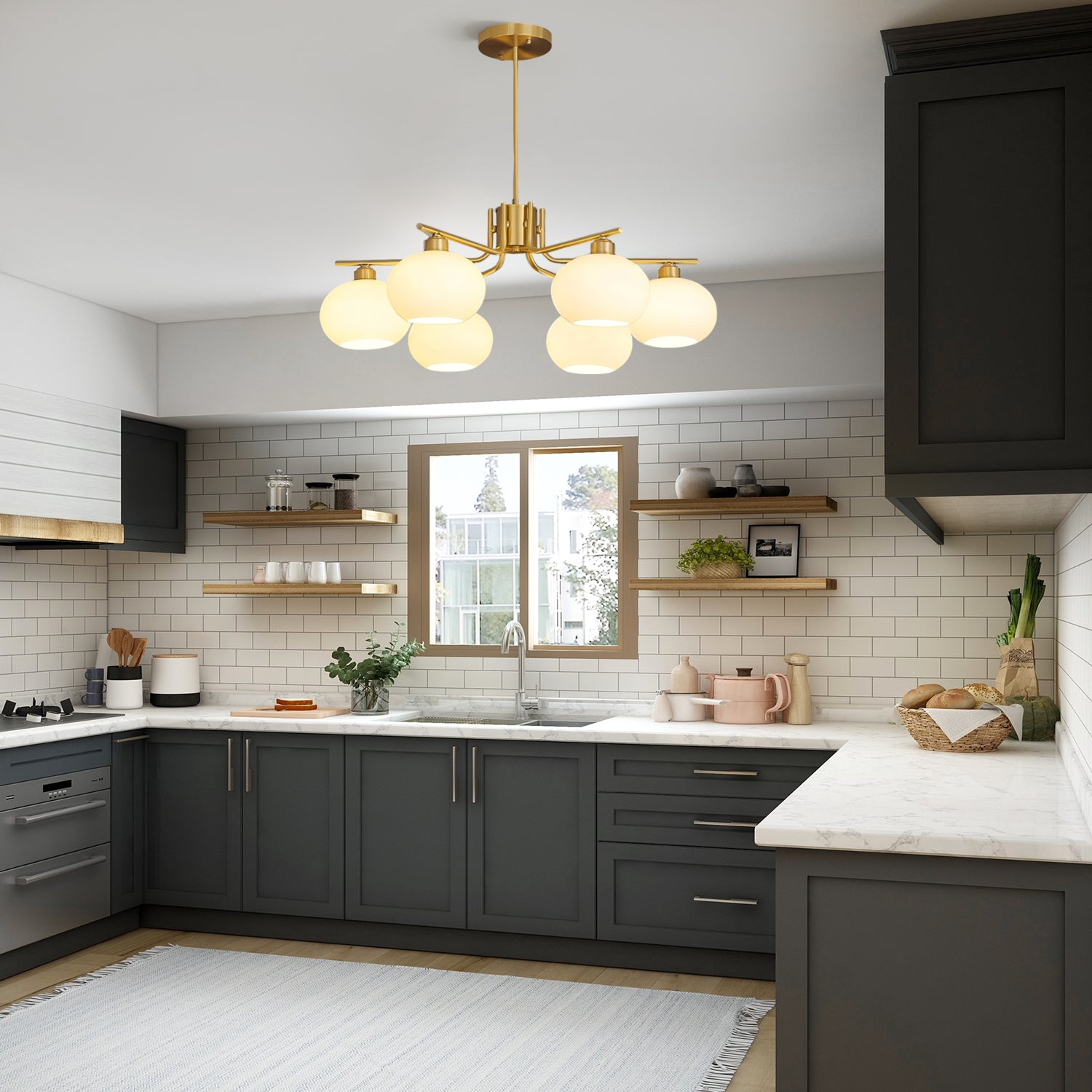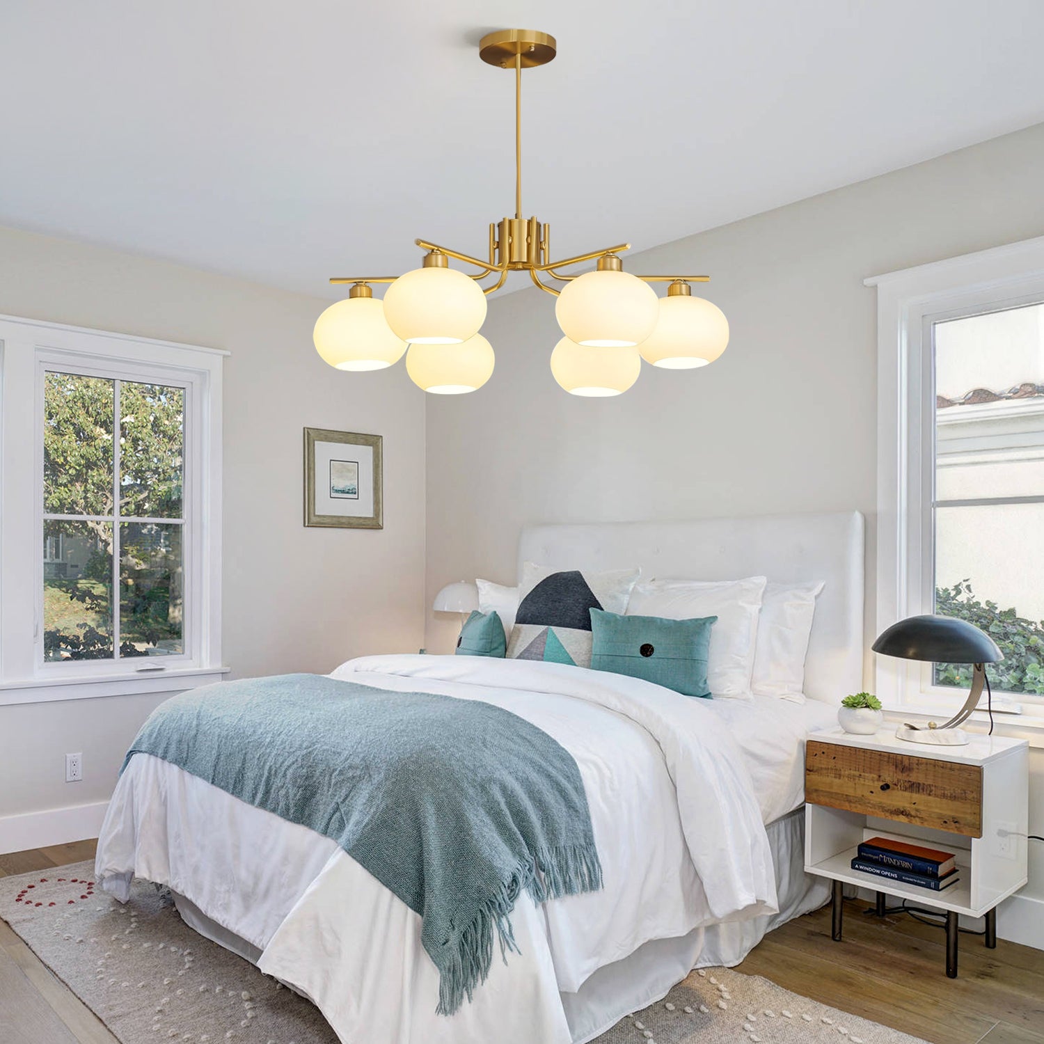 The Gino Persimmon Chandelier features a sleek metal frame with a warm gold finish and round opal glass shades. Its balanced design provides gentle, even lighting suitable for living rooms, dining areas, and bedrooms. The chandelier’s simple form and smooth texture add a refined touch to modern or contemporary interiors.