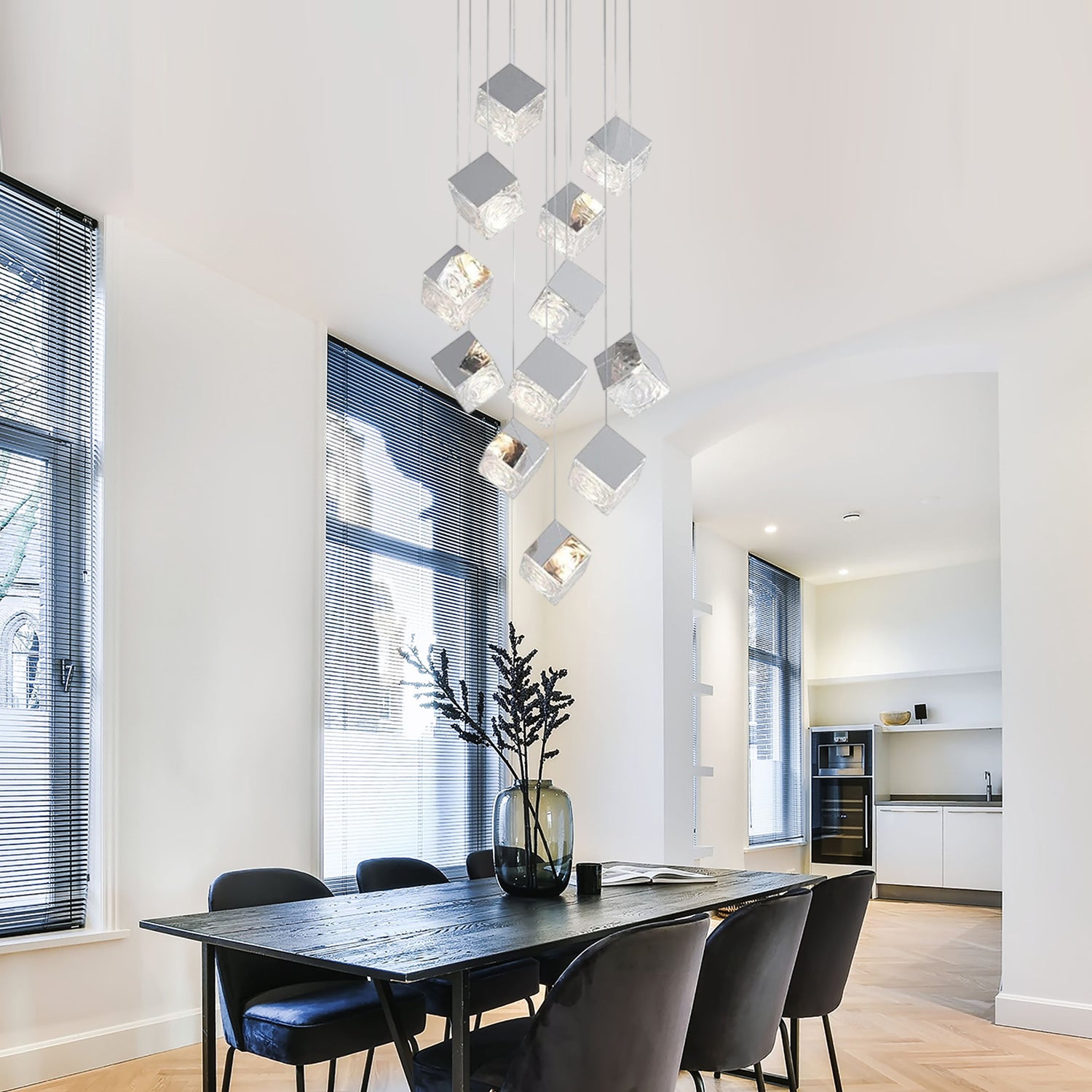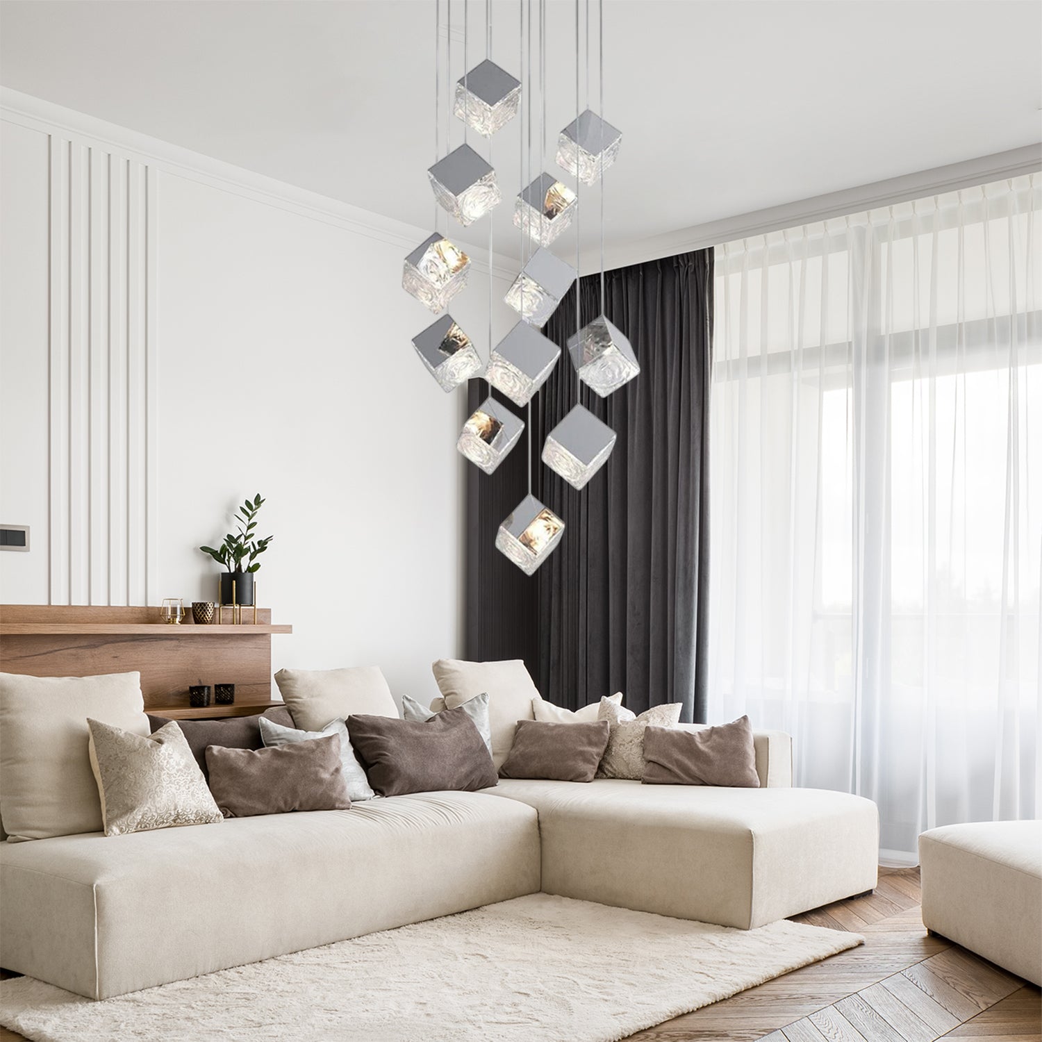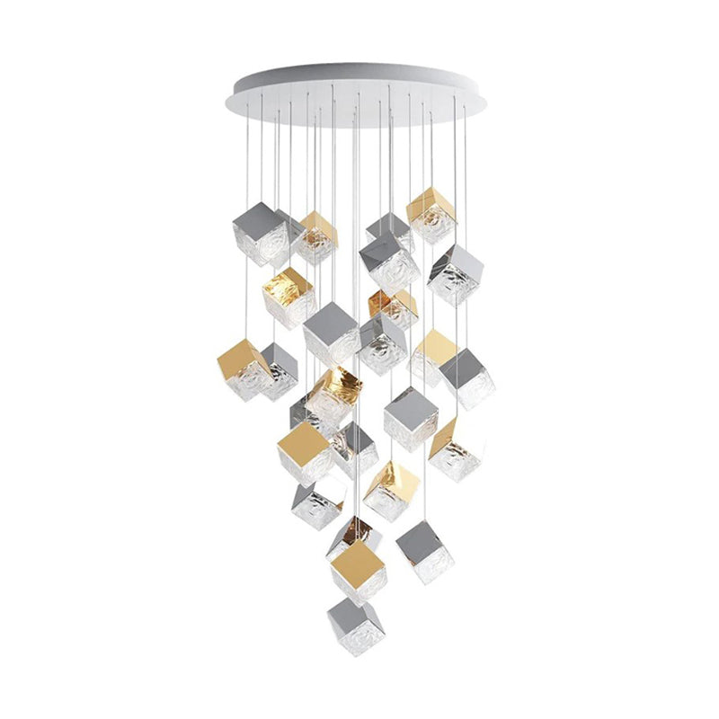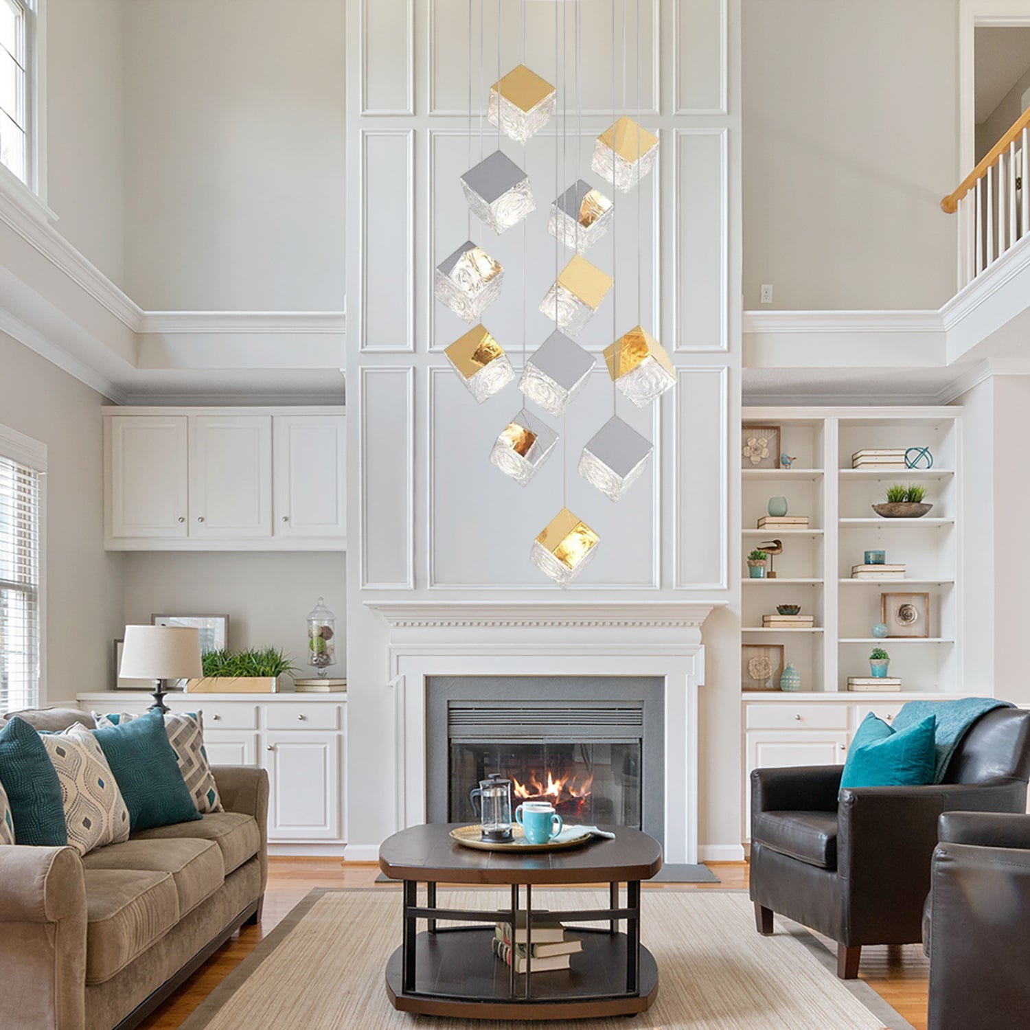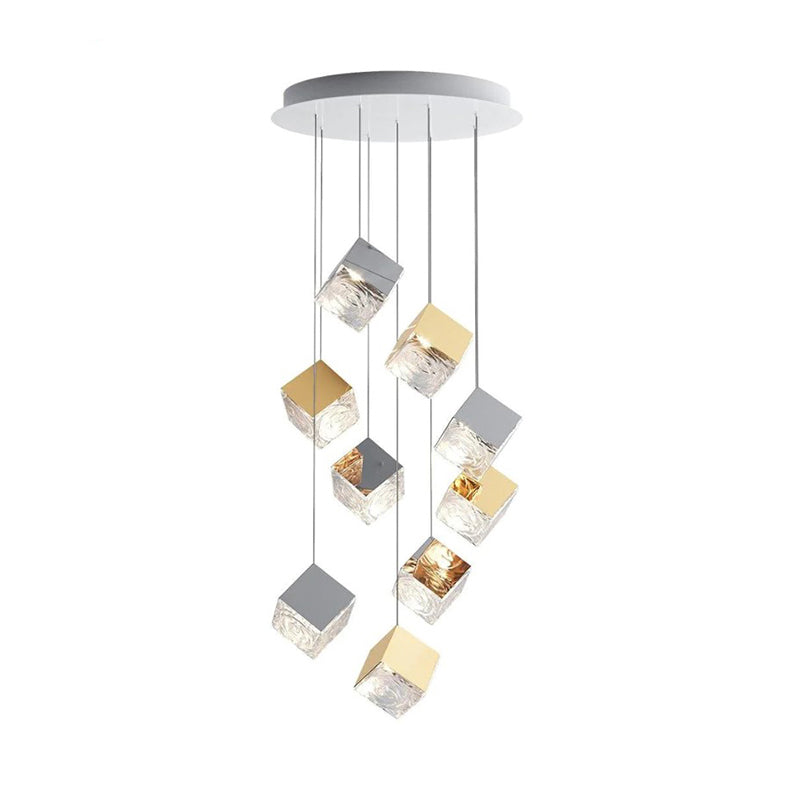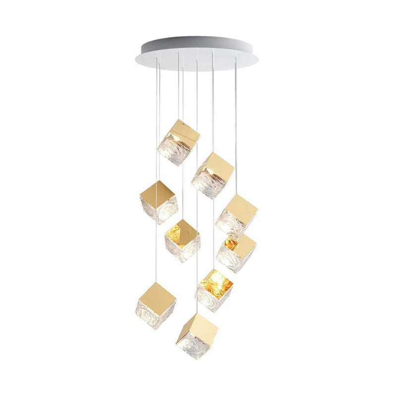 The Ice Crystal Cube Pendant features a modern cube design combining clear textured glass with a warm metallic finish. Each shade softly diffuses light, creating a gentle and balanced glow. Suitable for dining areas, living rooms, or hallways, this pendant adds a refined geometric touch to contemporary interiors.