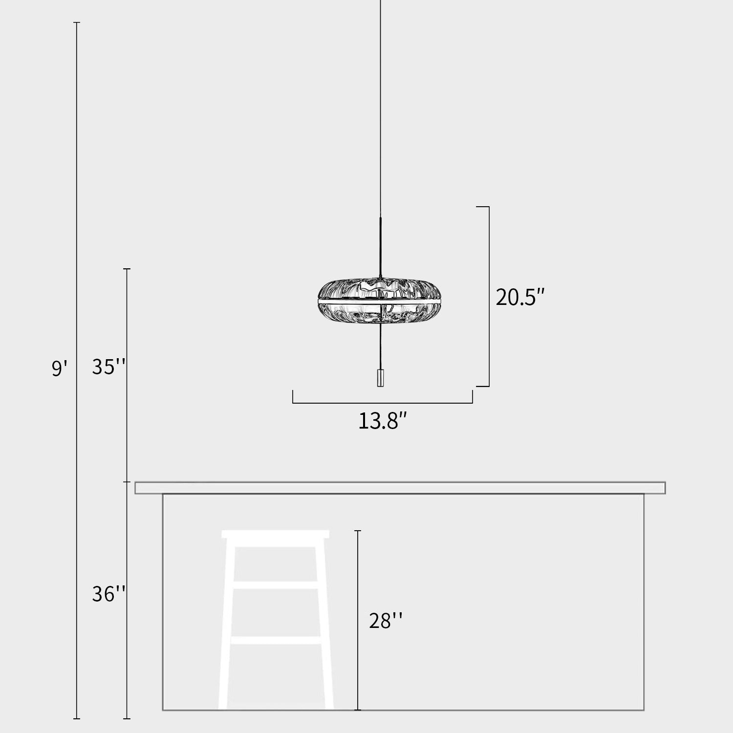 We provide 150 cm / 59 inches of hanging wire. It can be extended upon request.