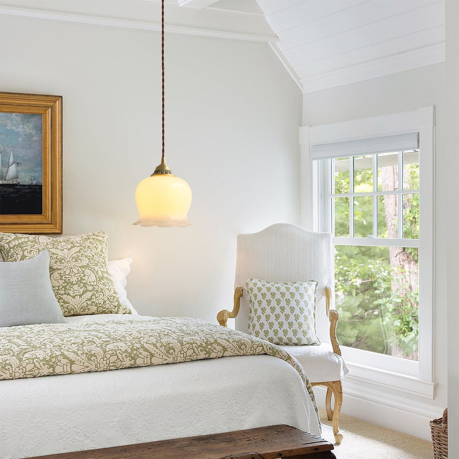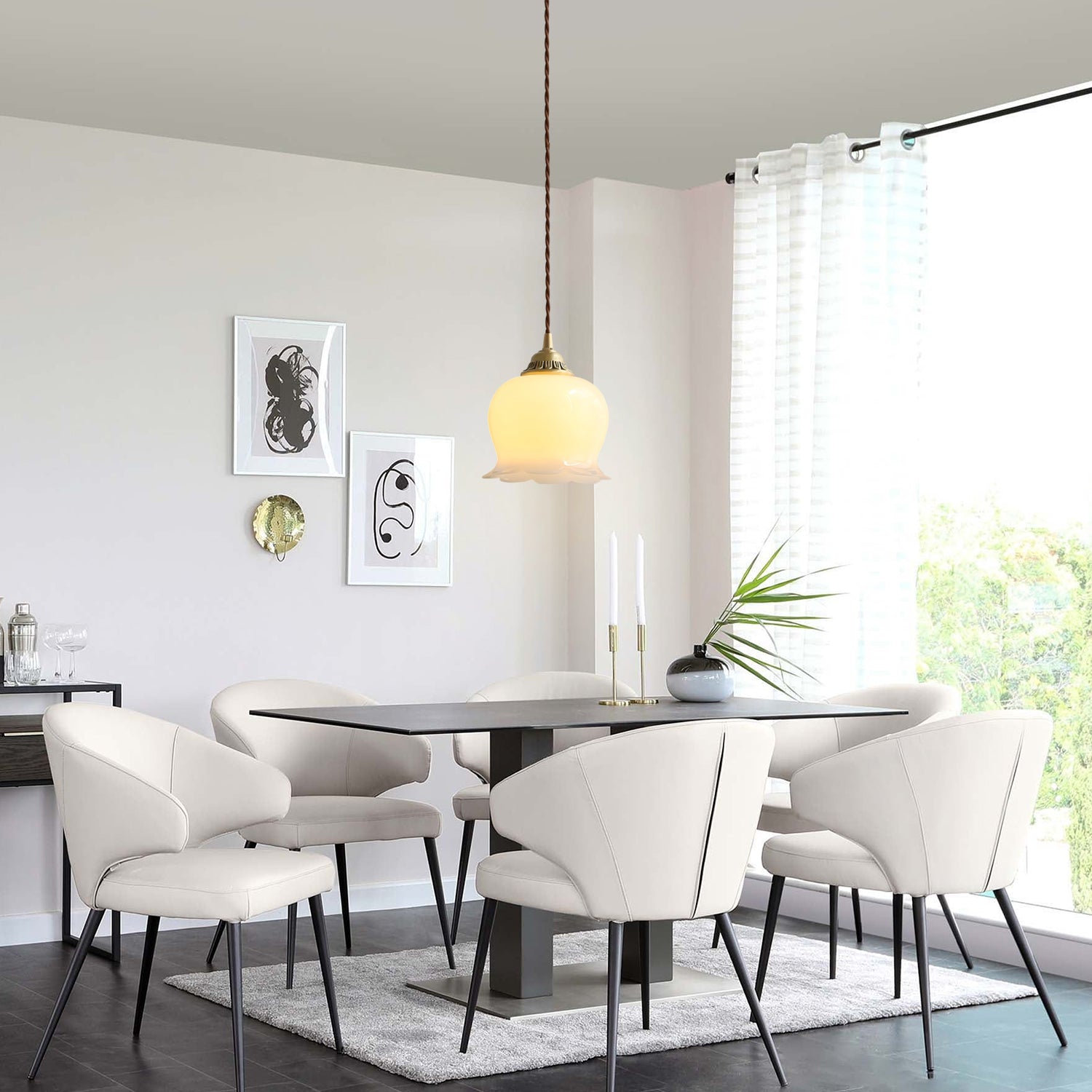 The Lily Flower Pendant Lamp features a petal-inspired glass shade suspended from a metal fixture. Its soft, diffused light creates a calm and pleasant atmosphere, suitable for dining rooms, bedrooms, or living spaces. The simple floral design blends easily with both modern and classic interiors.