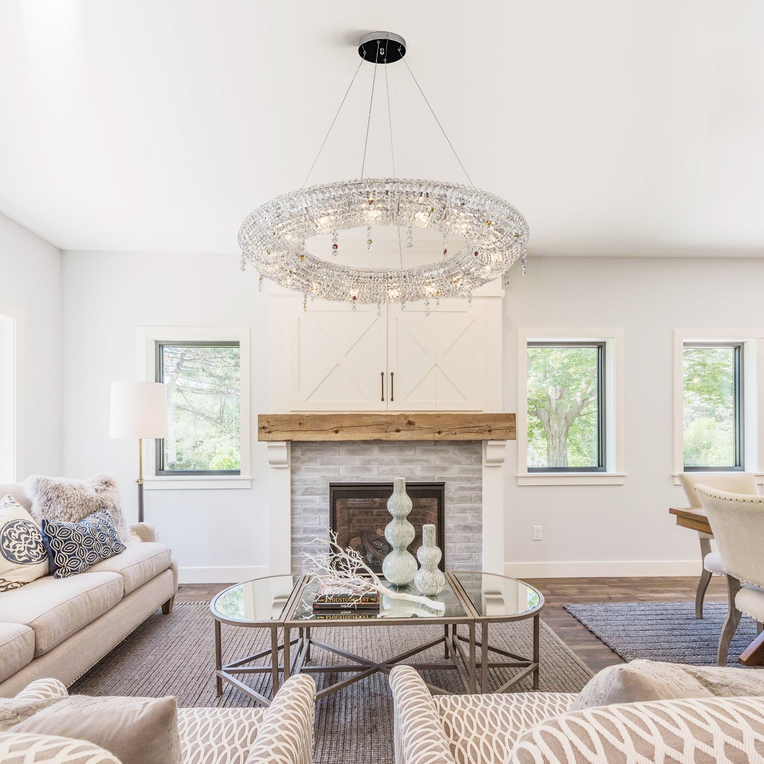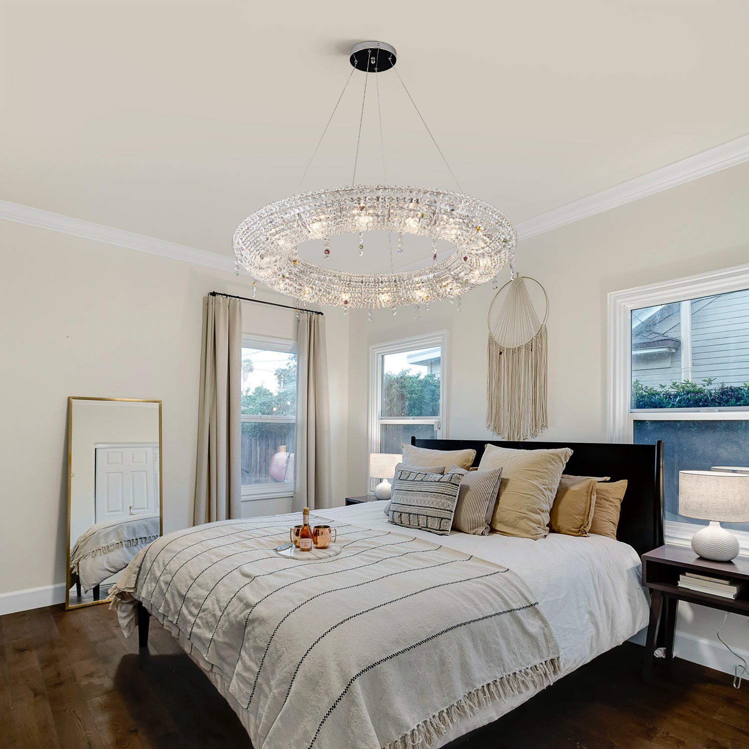 The Looop Crystal Ring Chandelier features a modern circular design with clear crystal accents that reflect soft, even light. Made with a durable metal frame and high-quality crystal pieces, it offers a simple yet elegant lighting solution for dining rooms, living areas, or bedrooms. The chandelier provides balanced illumination and can complement both contemporary and classic interiors.