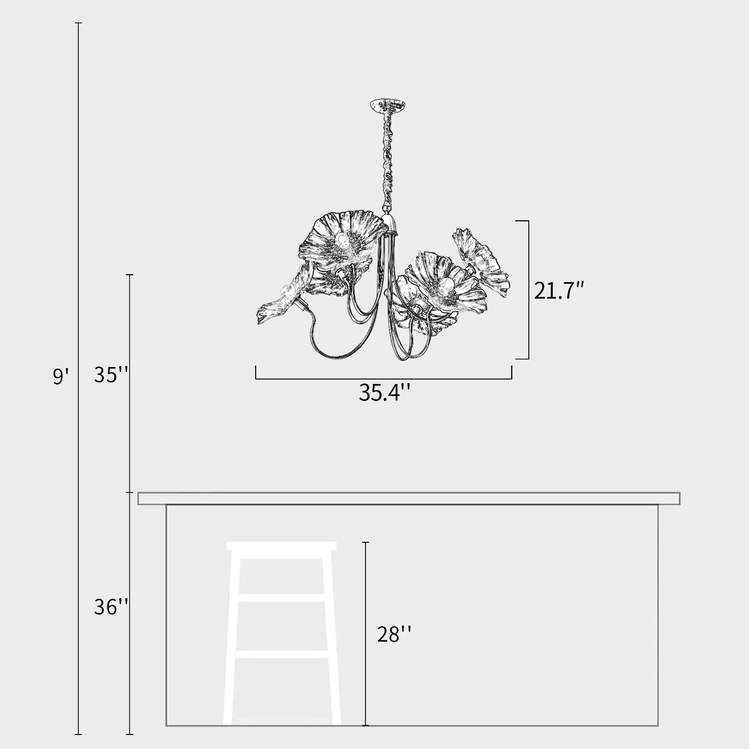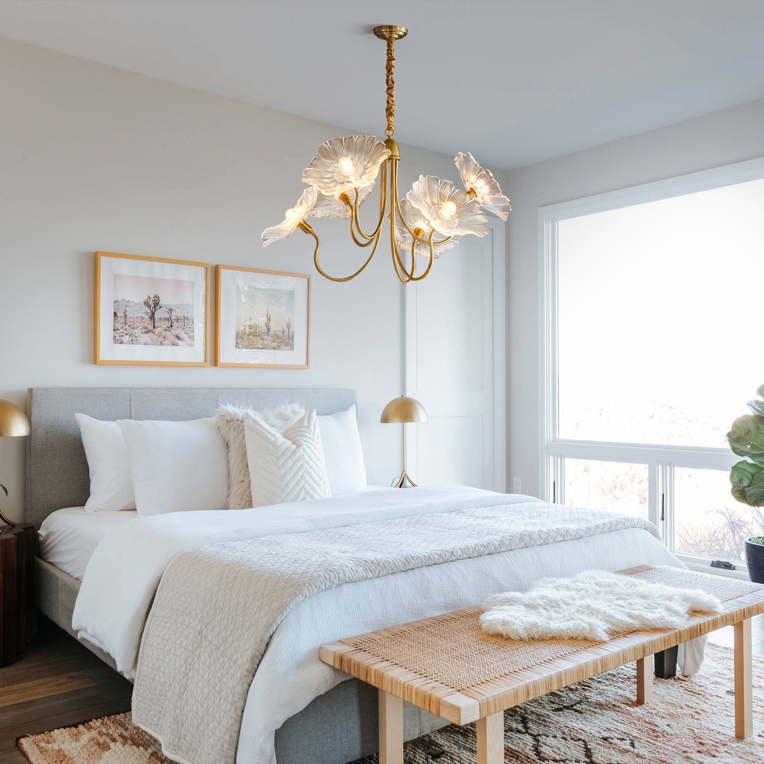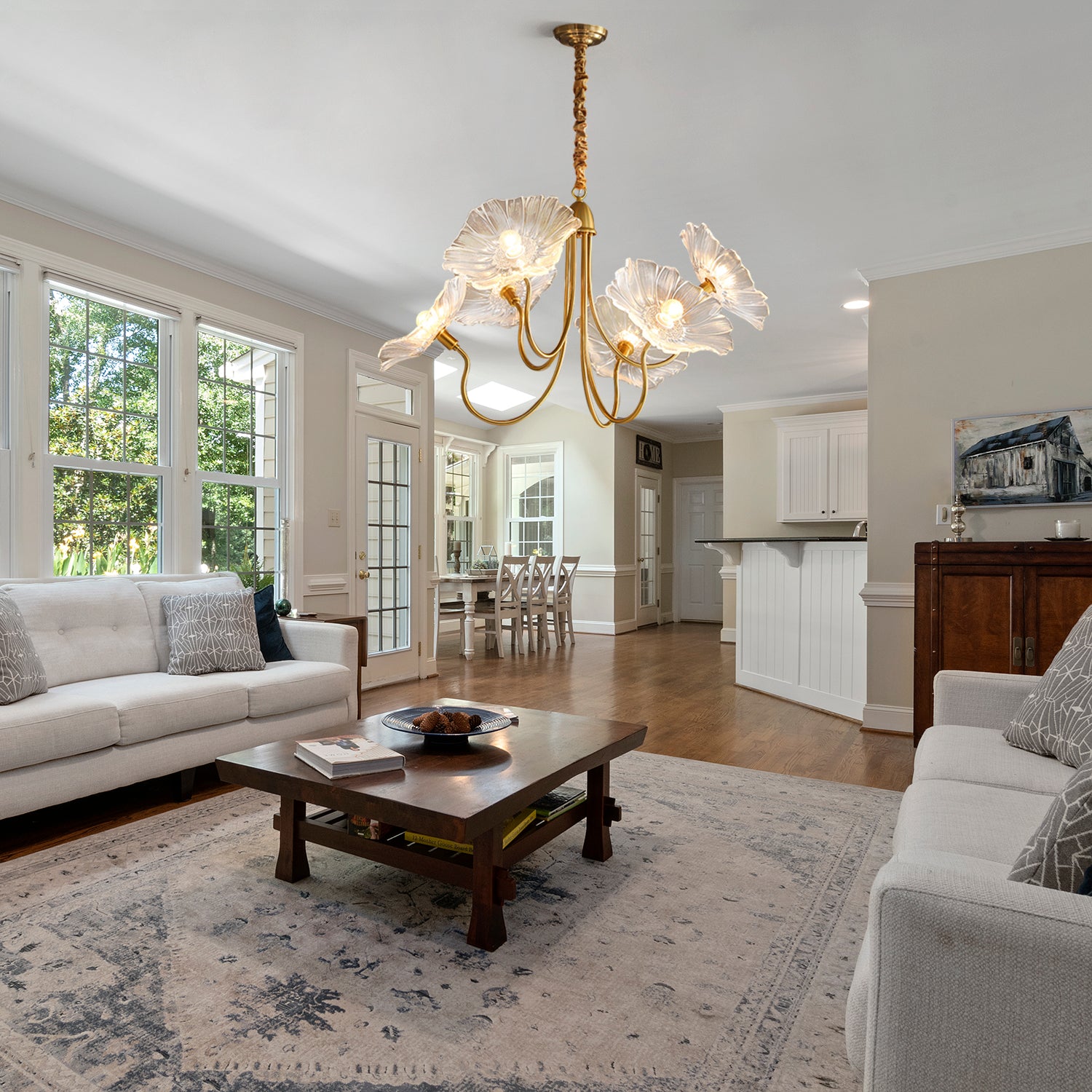 The Lotus Leaf Glass Chandelier features layered leaf-shaped glass panels with a suspended design. It provides ambient lighting suitable for dining spaces, living areas, or bedrooms.