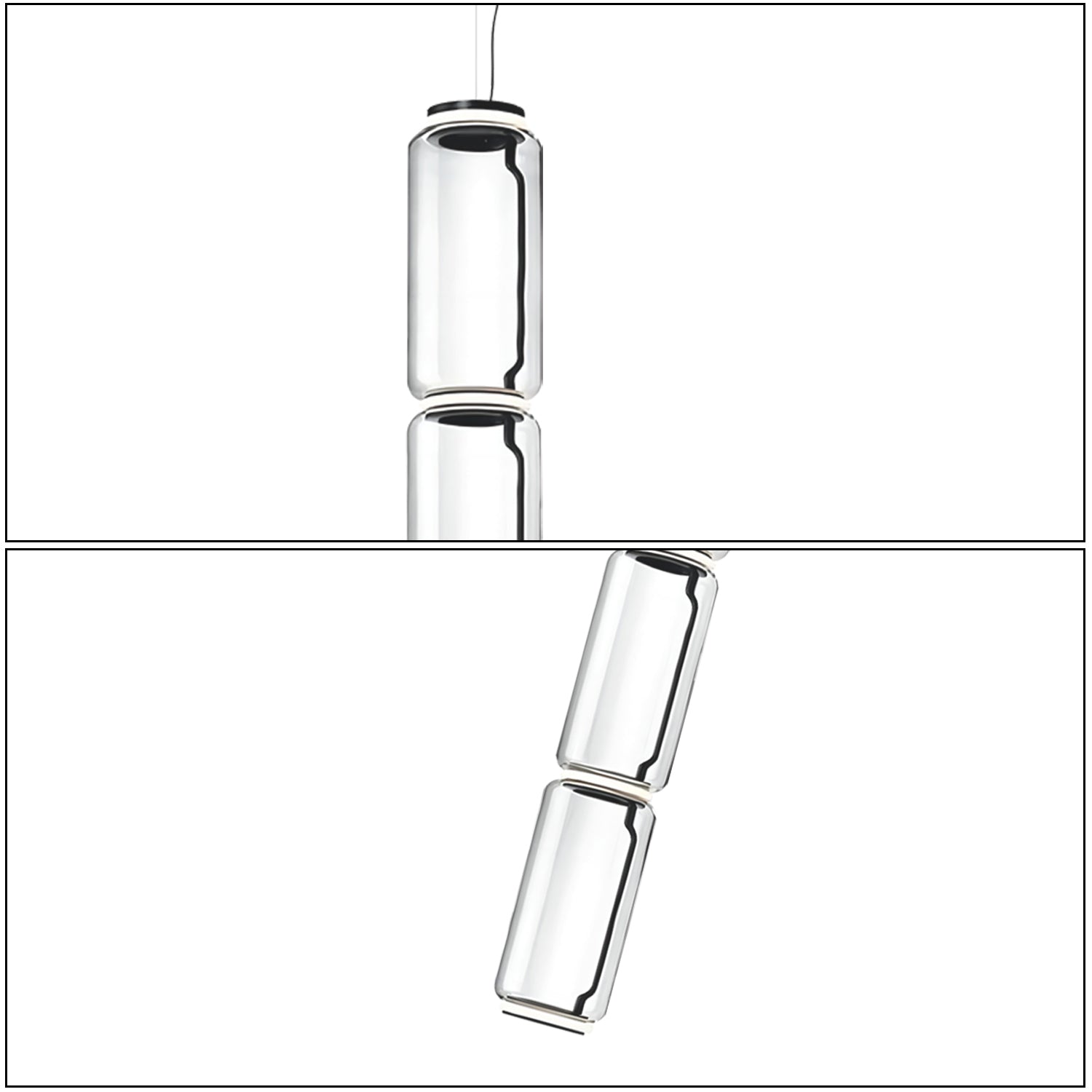 The Noctambule Glass Pendant Lamp features a clear glass body with a smooth, cylindrical form. Its minimalist design allows soft and balanced illumination, suitable for dining rooms, living areas, or modern interiors. The combination of glass and metal gives it a refined appearance while maintaining a simple aesthetic.