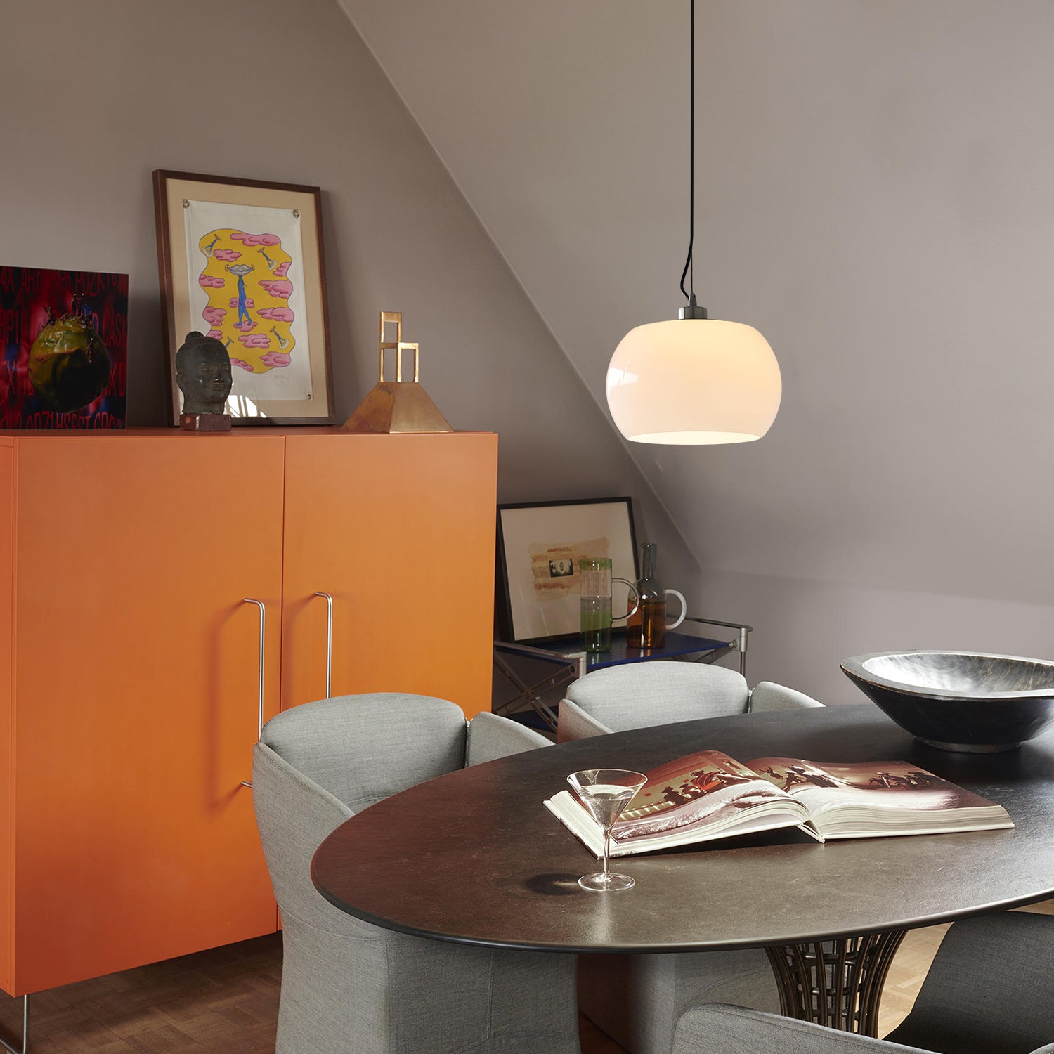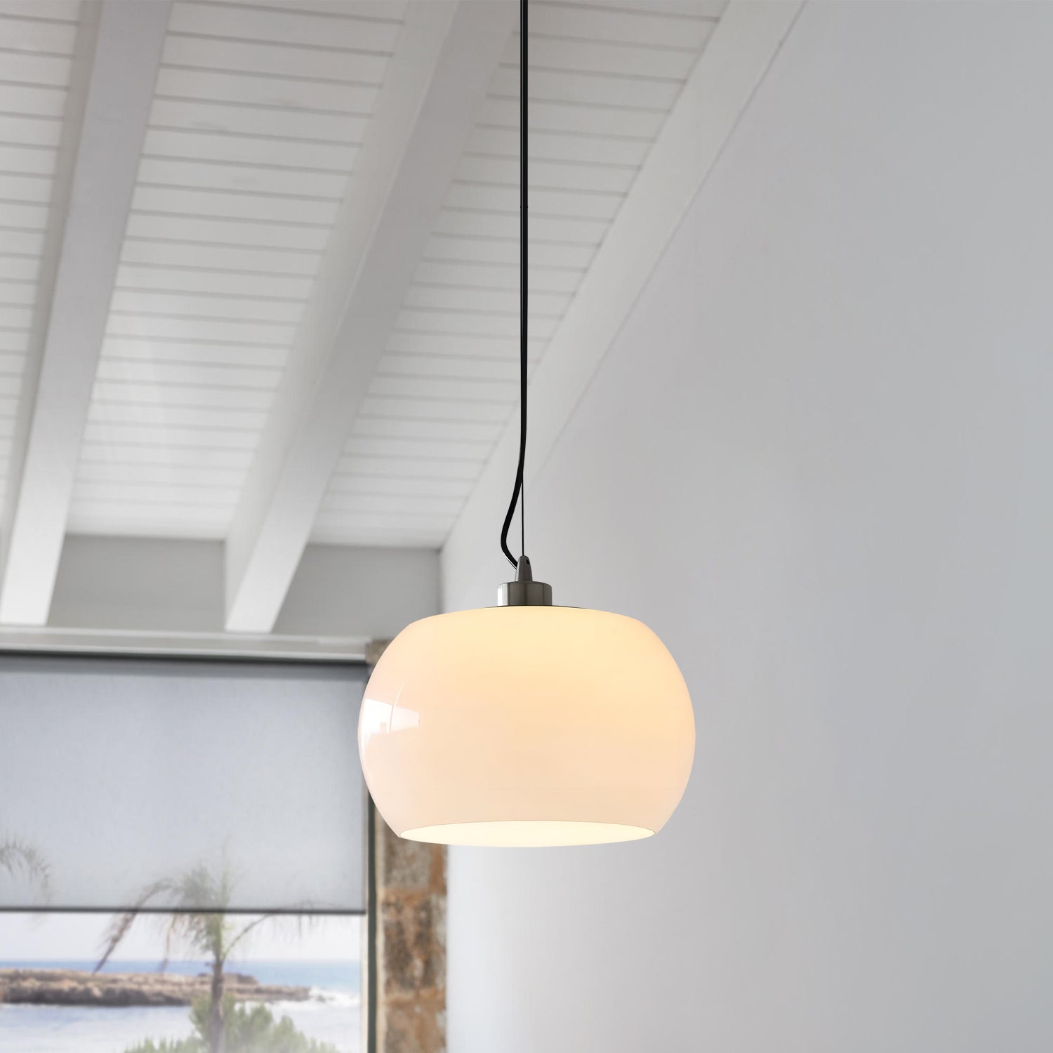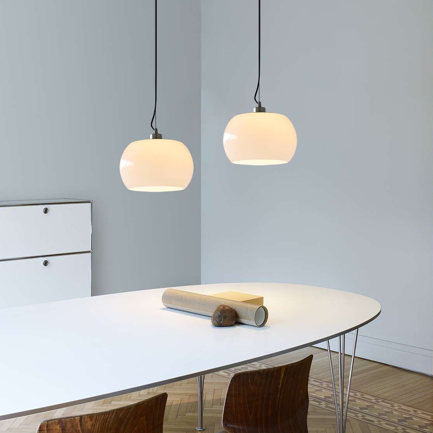 The Persimmon Oval Glass Pendant features an oval-shaped glass shade with a smooth surface and a suspended metal fixture. It provides ambient downward lighting suitable for dining areas, kitchen islands, or living spaces. The pendant is designed for standard ceiling installation and supports common bulb types, including LED options. The hanging height can be adjusted to fit different ceiling conditions.