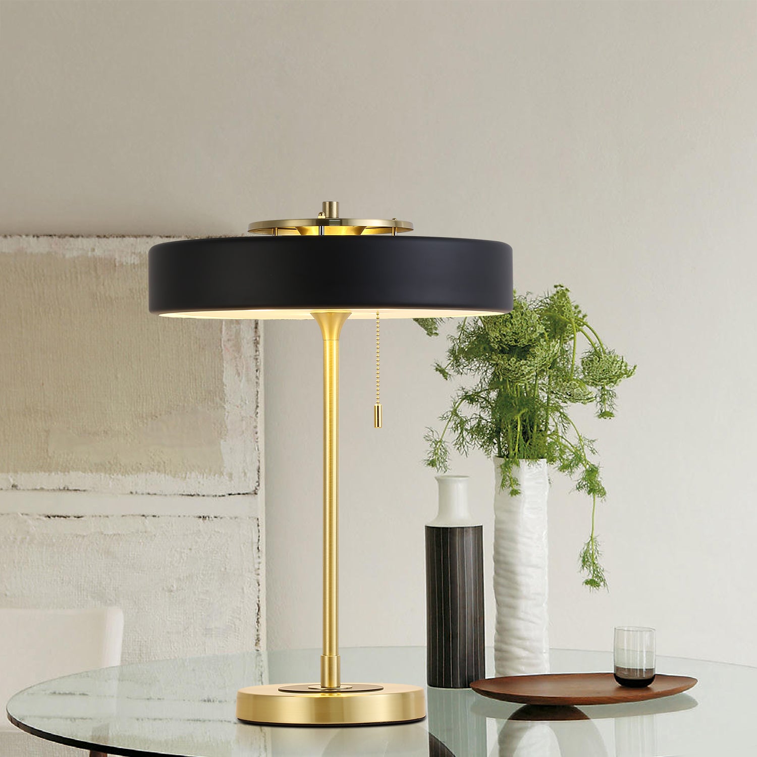 The Revolve Metal Table Lamp has a metal base with a zipper switch positioned beneath a glass lampshade. When lit, the combination of glass and light produces a soft, diffused glow. Its design blends metal and glass elements, suitable for desks, bedside tables, or living spaces.