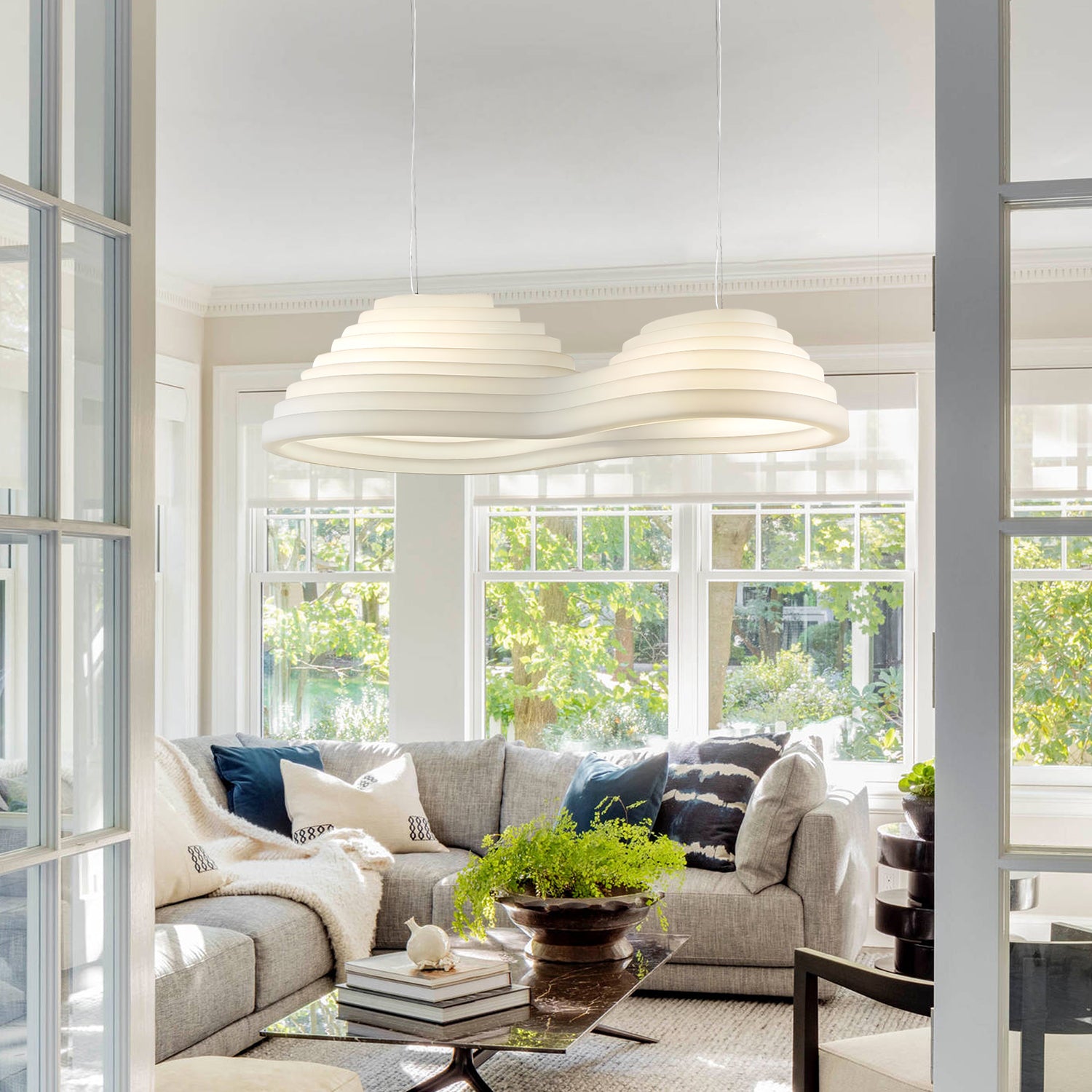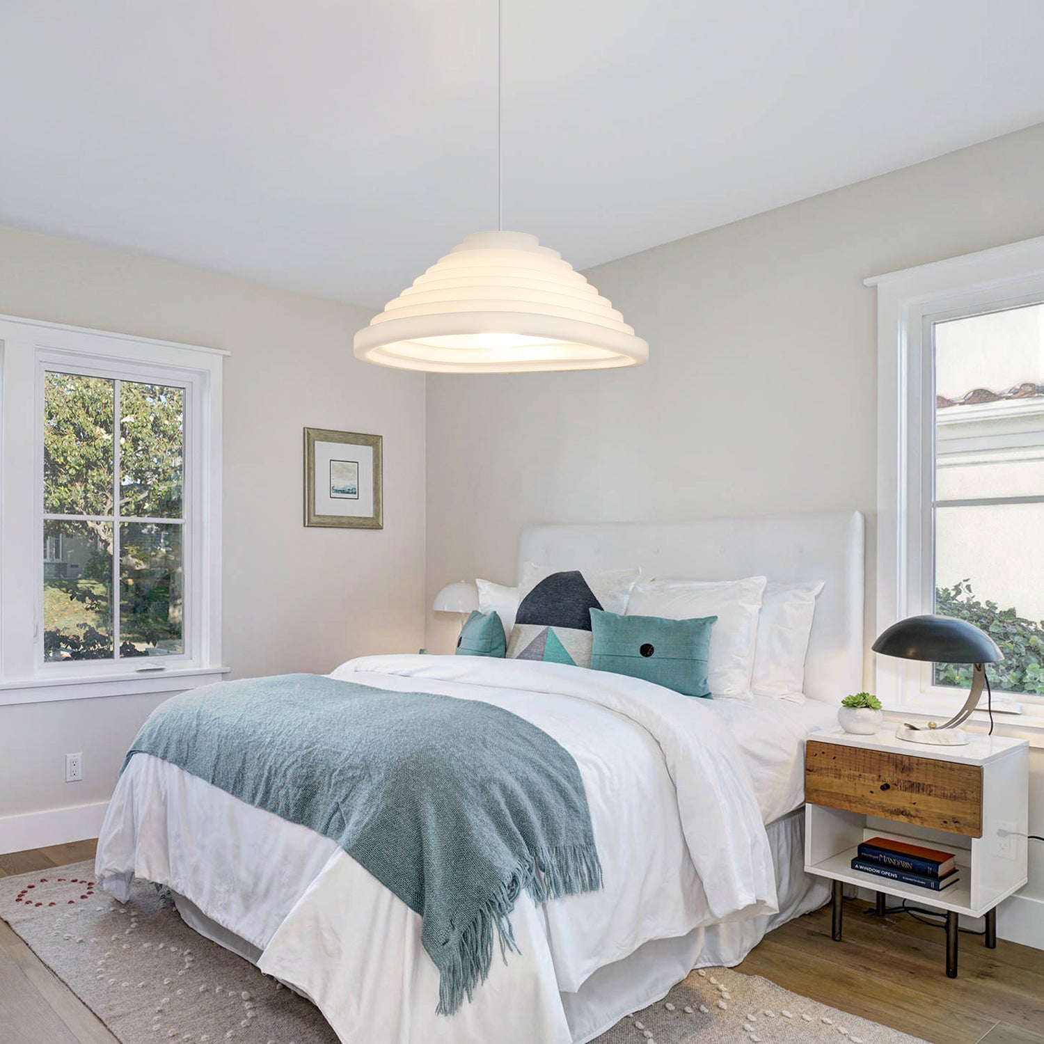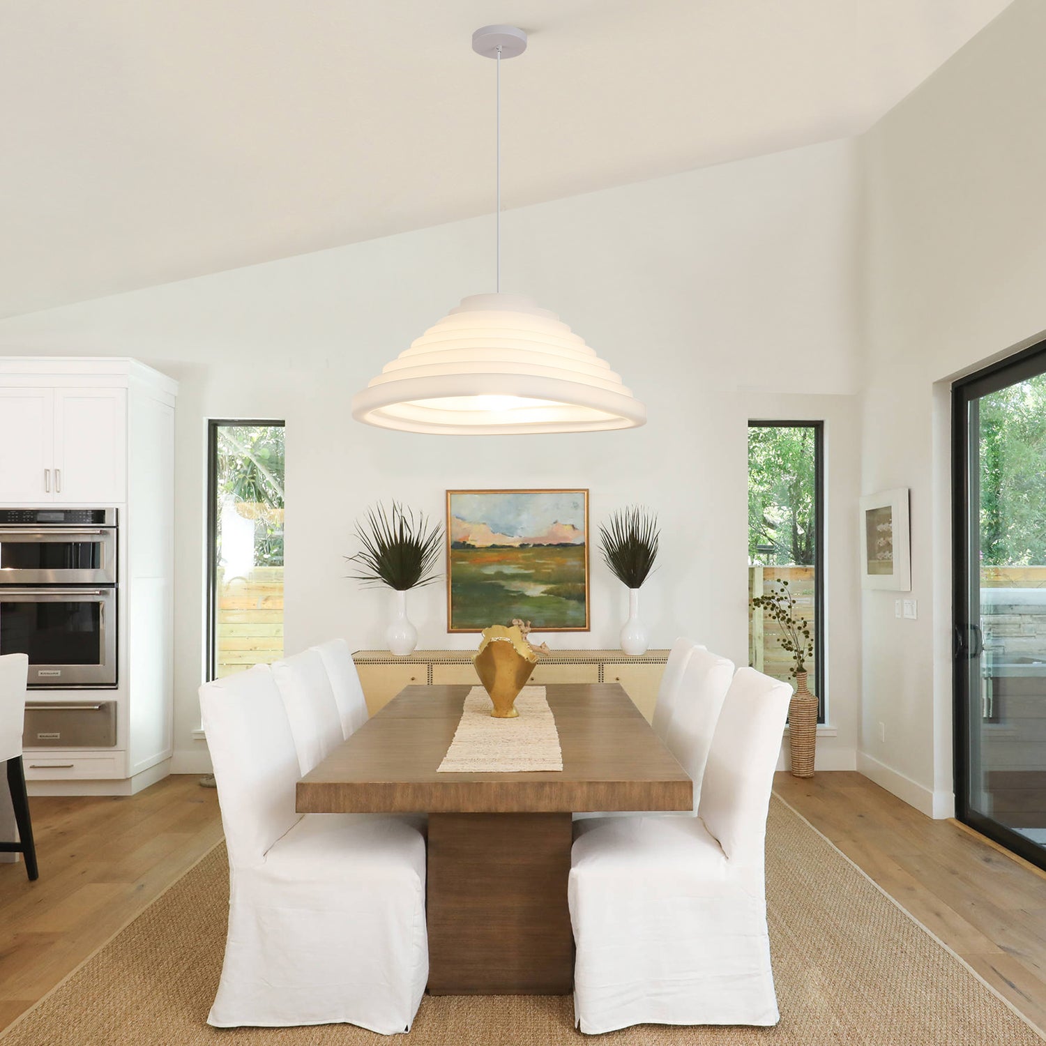 The Rice Field Wave Pendant features a layered design inspired by the curves of terraced fields. Made from durable materials with a soft white finish, it provides a gentle, even light suitable for dining rooms, living spaces, or offices. Its modern form blends functionality with a calm aesthetic, creating a comfortable atmosphere without glare.