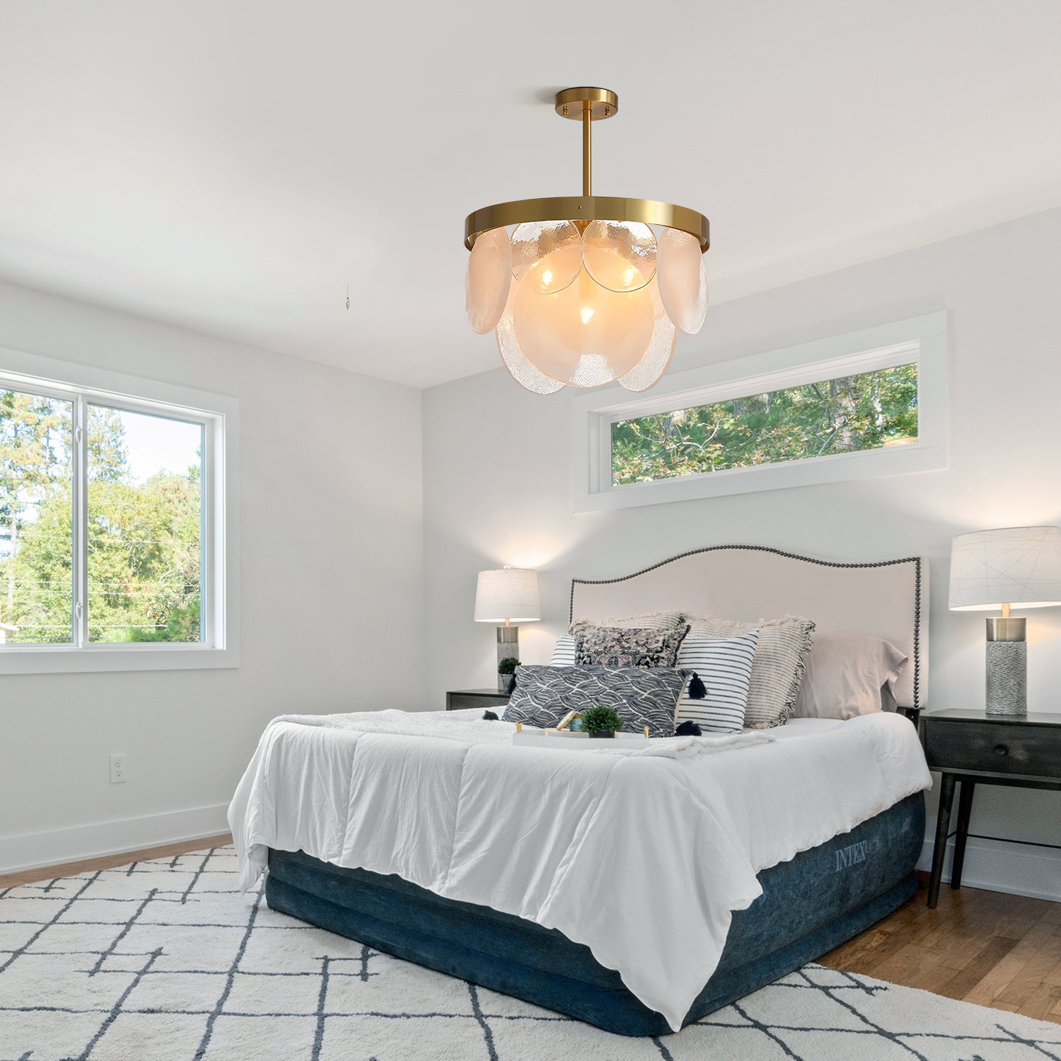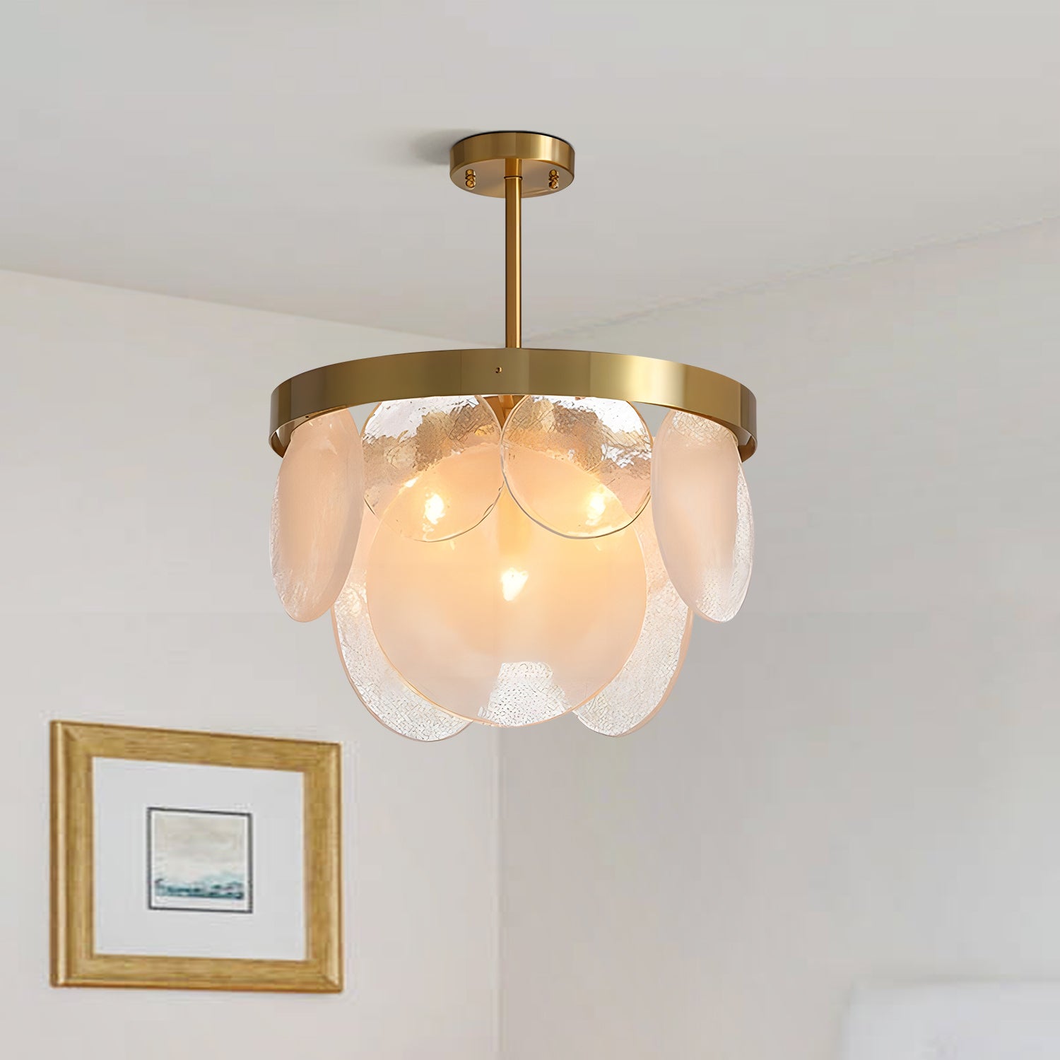 The Sasha Cloud Chandelier features a metal frame with layered glass discs. The glass design diffuses light softly and creates a natural cloud-like appearance. Suitable for dining rooms, living rooms, or bedrooms, it offers a simple and clean look for indoor spaces.