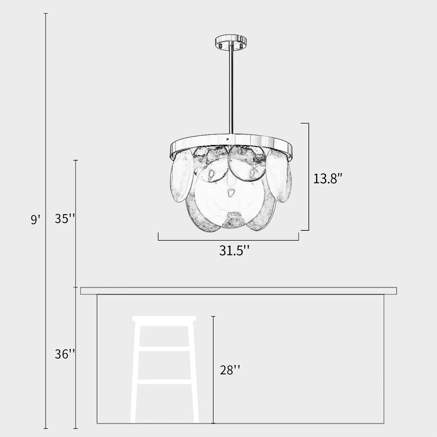 We provide 150 cm / 59 inches of hanging wire. It can be extended upon request.