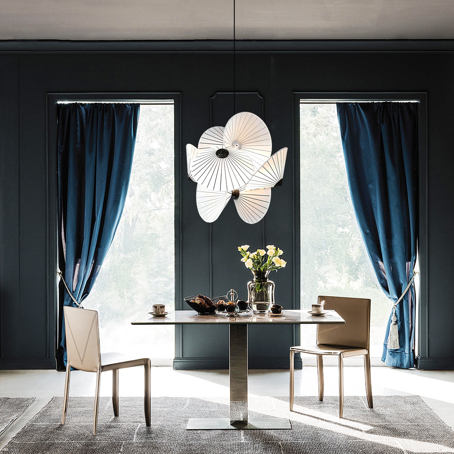 The Serpentine Pendant Light features a layered shade design inspired by curved fan-like forms. The shades are made from a lightweight material with fine linear detailing that creates a soft and even diffusion of light. The pendant hangs from a single cable and provides a simple decorative element suitable for living rooms, dining areas, or other indoor spaces. Its neutral color and sculptural structure allow it to integrate into different interior styles.