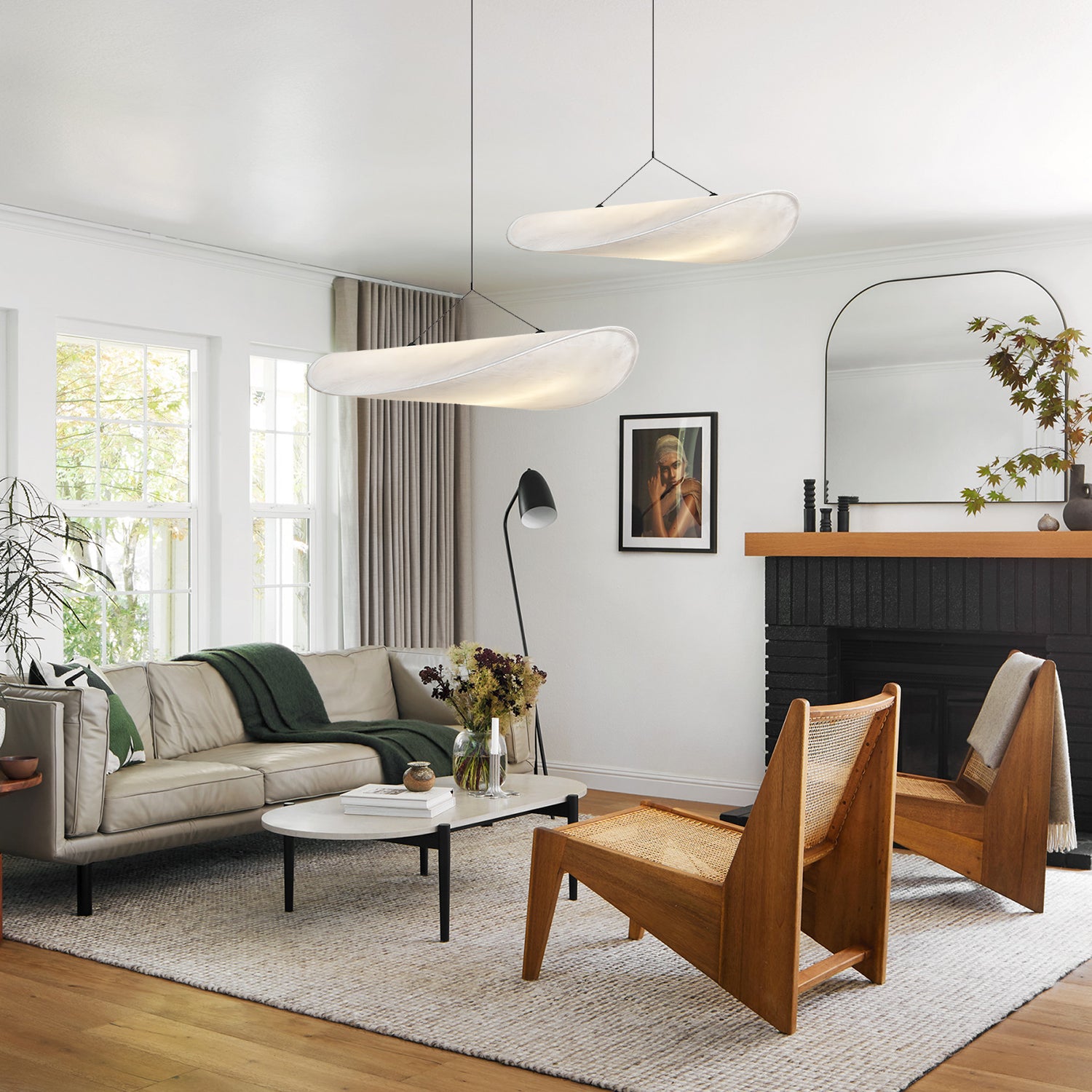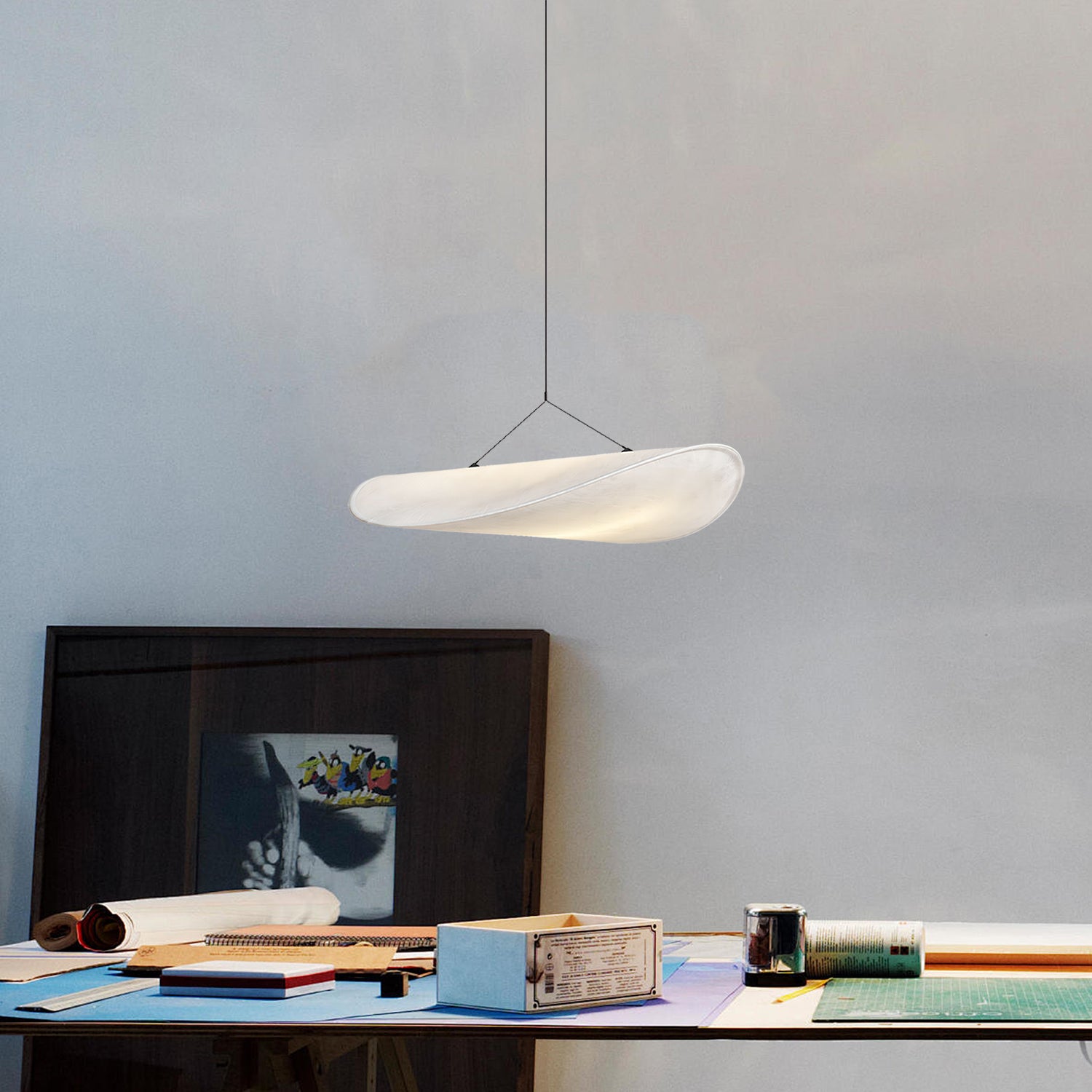 The Silk Tense Pendant Light features a fabric shade made from stretched silk material. Its soft, curved form provides diffused illumination suitable for living rooms, bedrooms, or dining spaces.