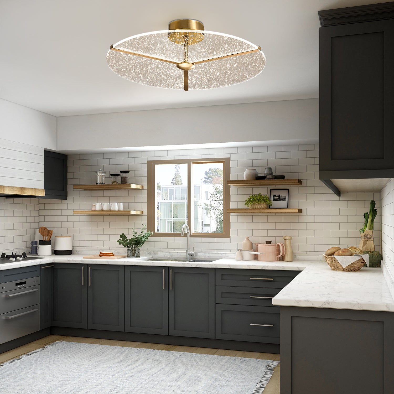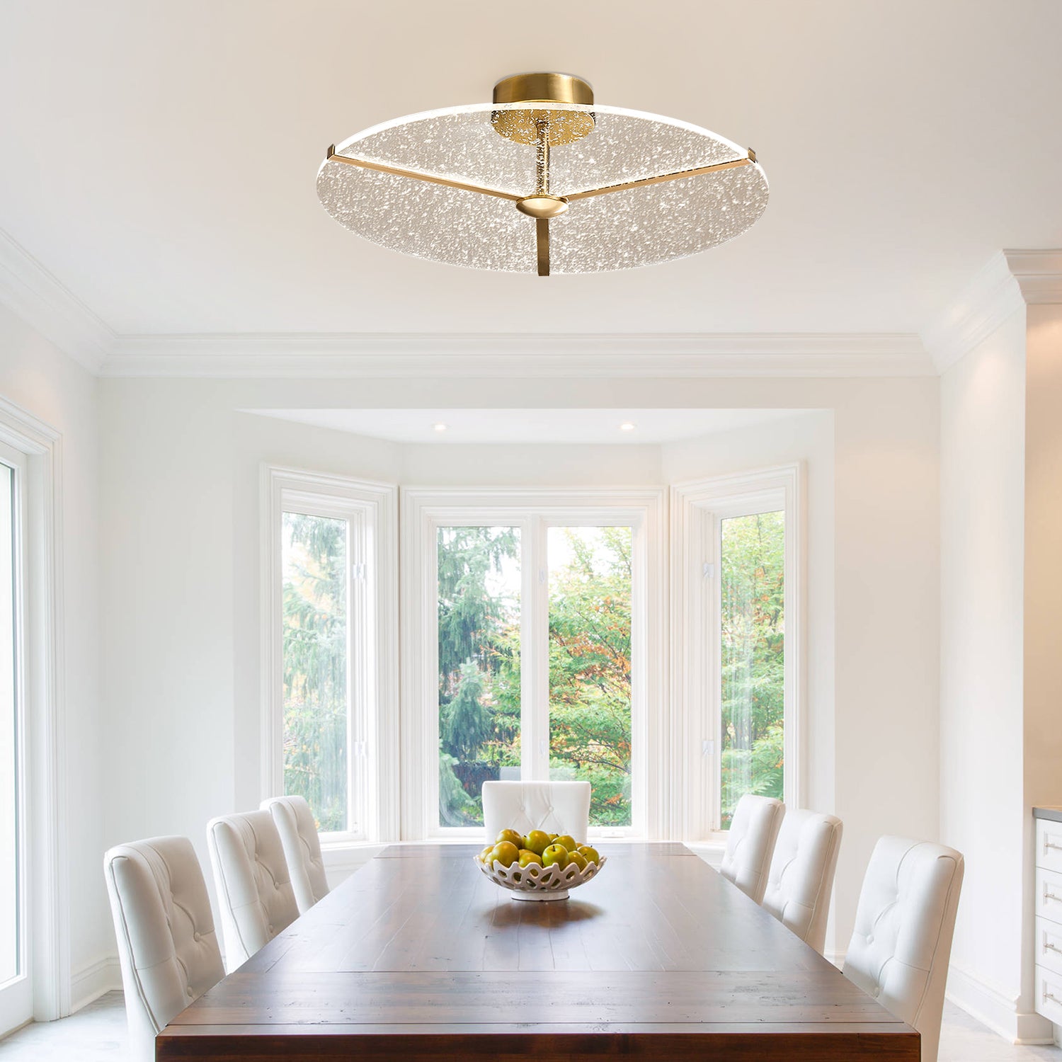 The Snowflake Round Ceiling Light features a circular glass panel with a subtle textured surface that resembles scattered snowflakes. Supported by a metal frame in a warm finish, the light is designed to provide balanced illumination for indoor spaces. Its simple round form makes it suitable for use in living rooms, bedrooms, or hallways, offering a clean and versatile lighting option.