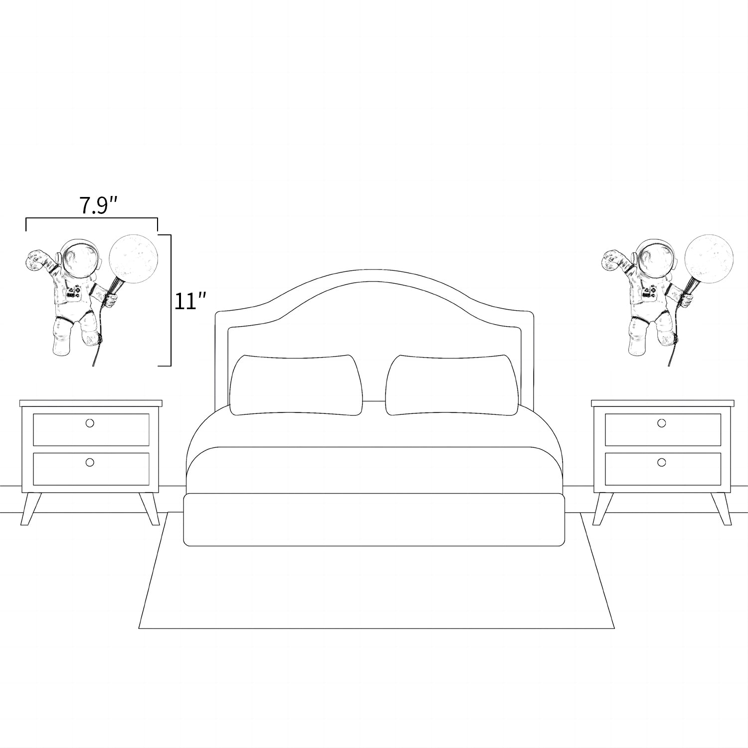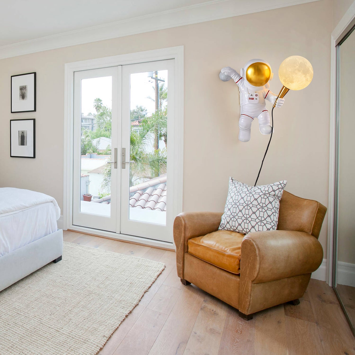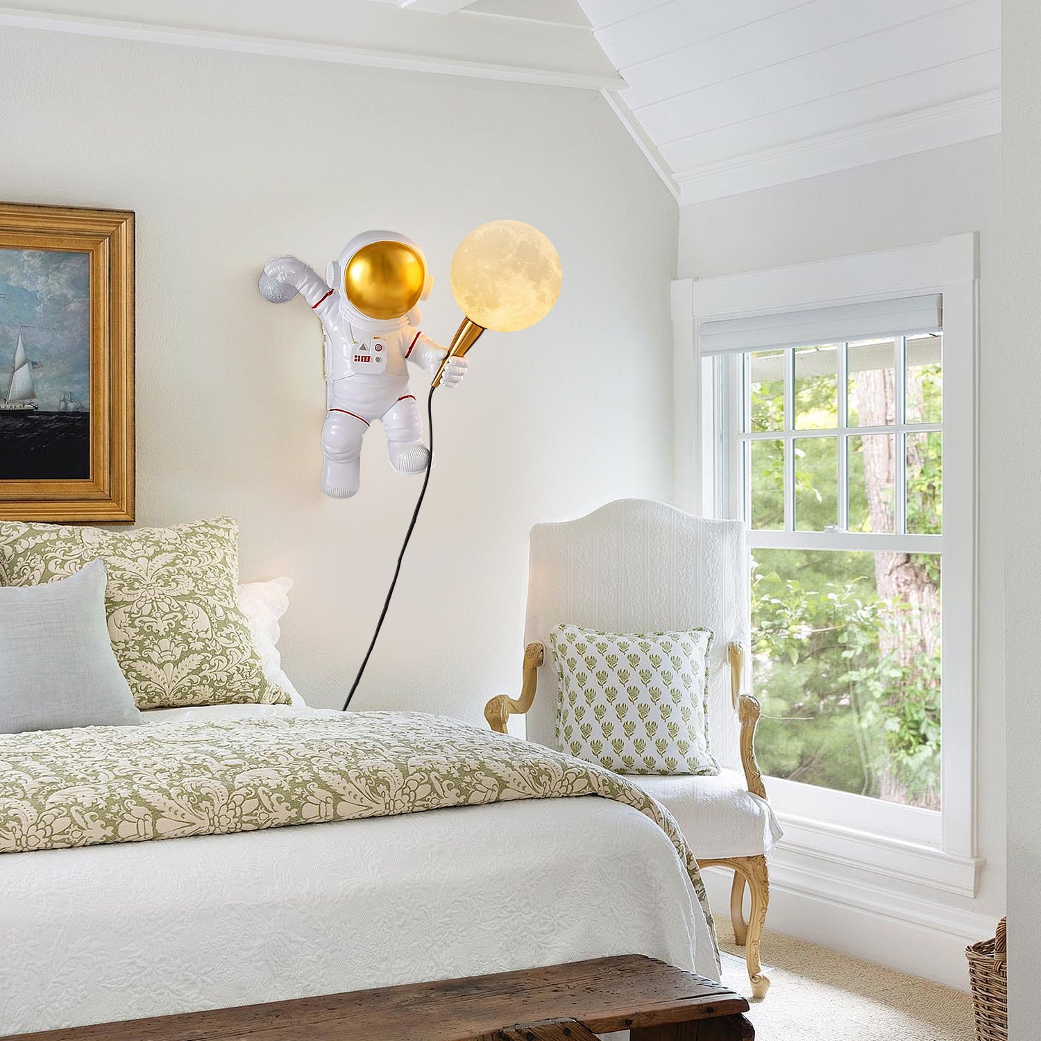 The Space Explorer Sconce has a resin astronaut figure paired with a round lampshade. It mounts to the wall and offers practical lighting for areas such as bedrooms, living rooms, or hallways.