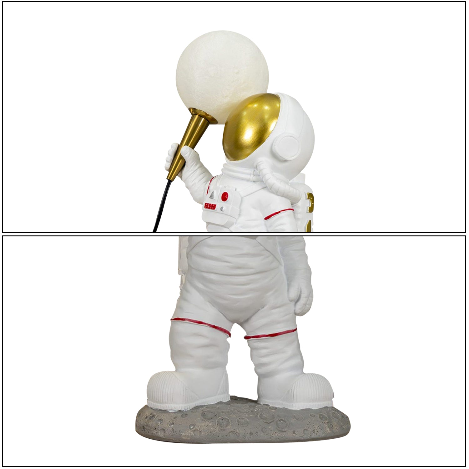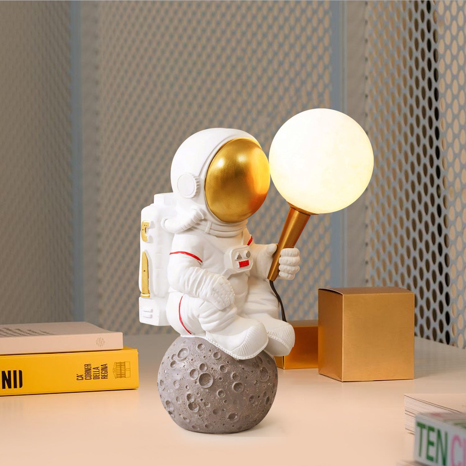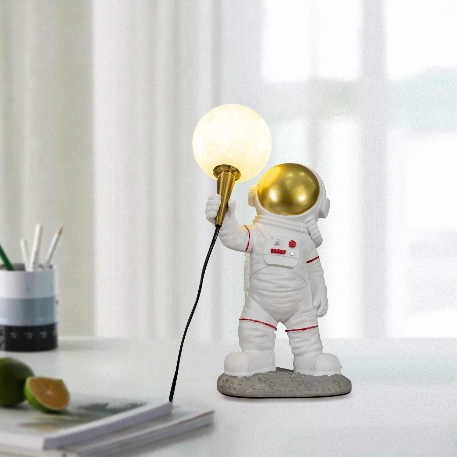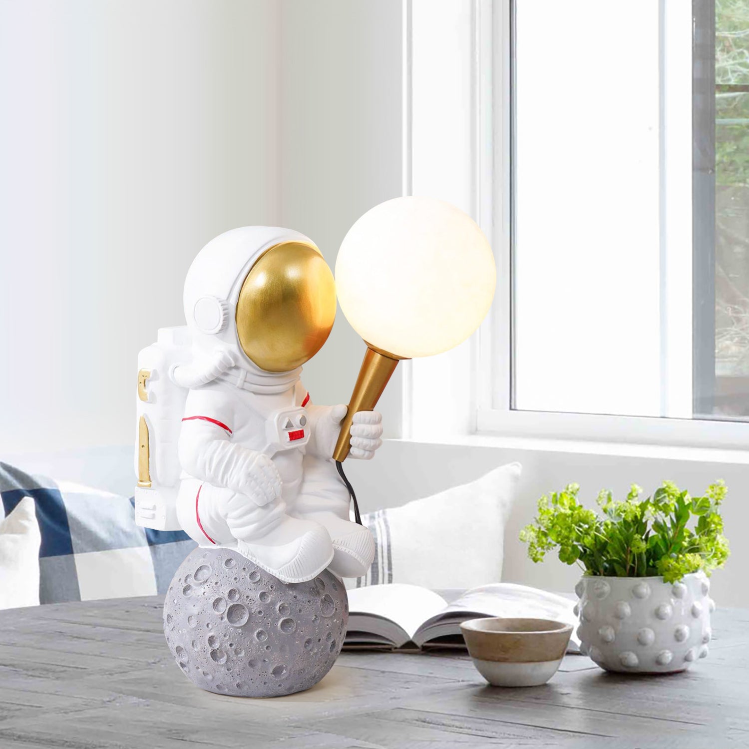 The Space Explorer Table Lamp features a resin astronaut figure holding a round lampshade. It is designed with a stable base and is suitable for use on desks, bedside tables, or shelves, providing soft lighting for everyday use.