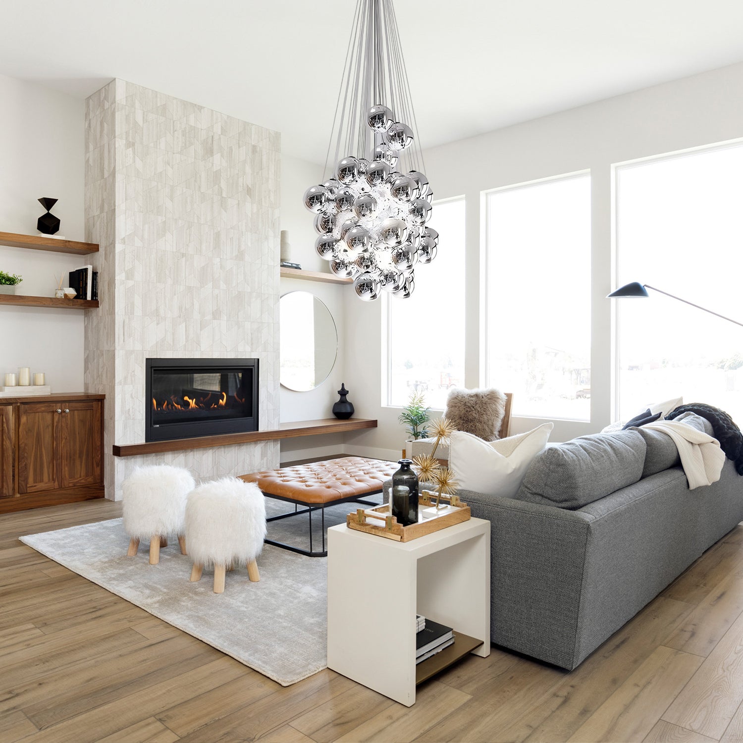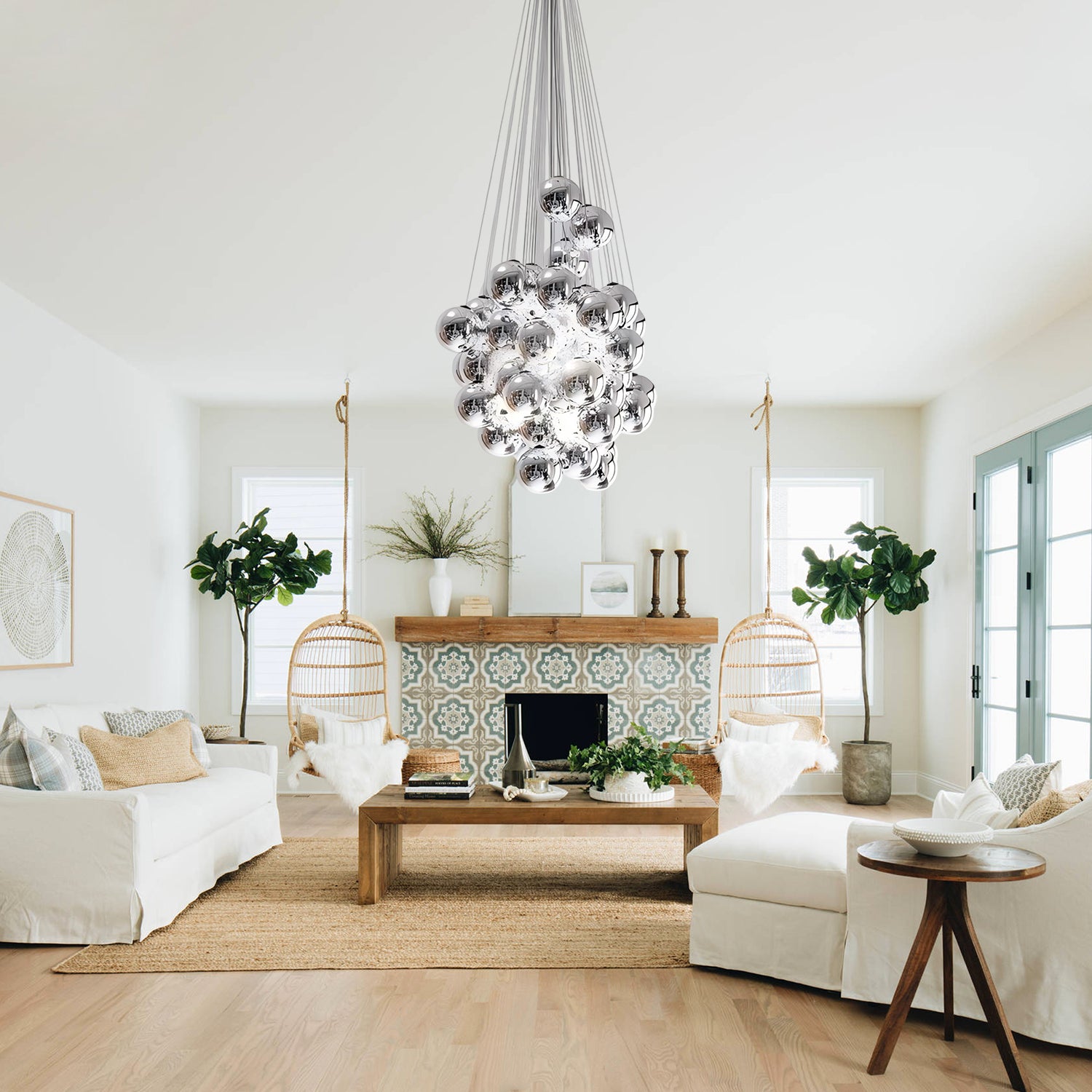 The Stochastic Bubble Chandelier features a cluster of glass spheres arranged at varying heights. The metal frame holds each sphere in place, creating a balanced and layered appearance. It provides ambient illumination suitable for living rooms, dining areas, or open spaces.