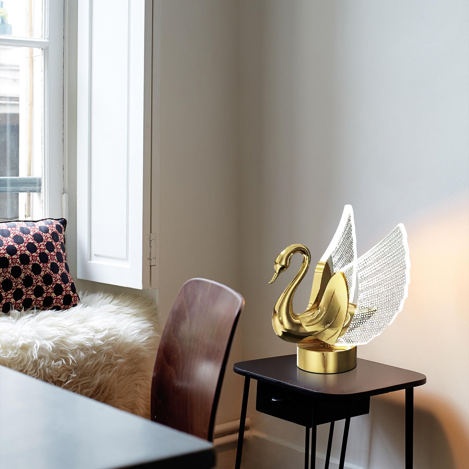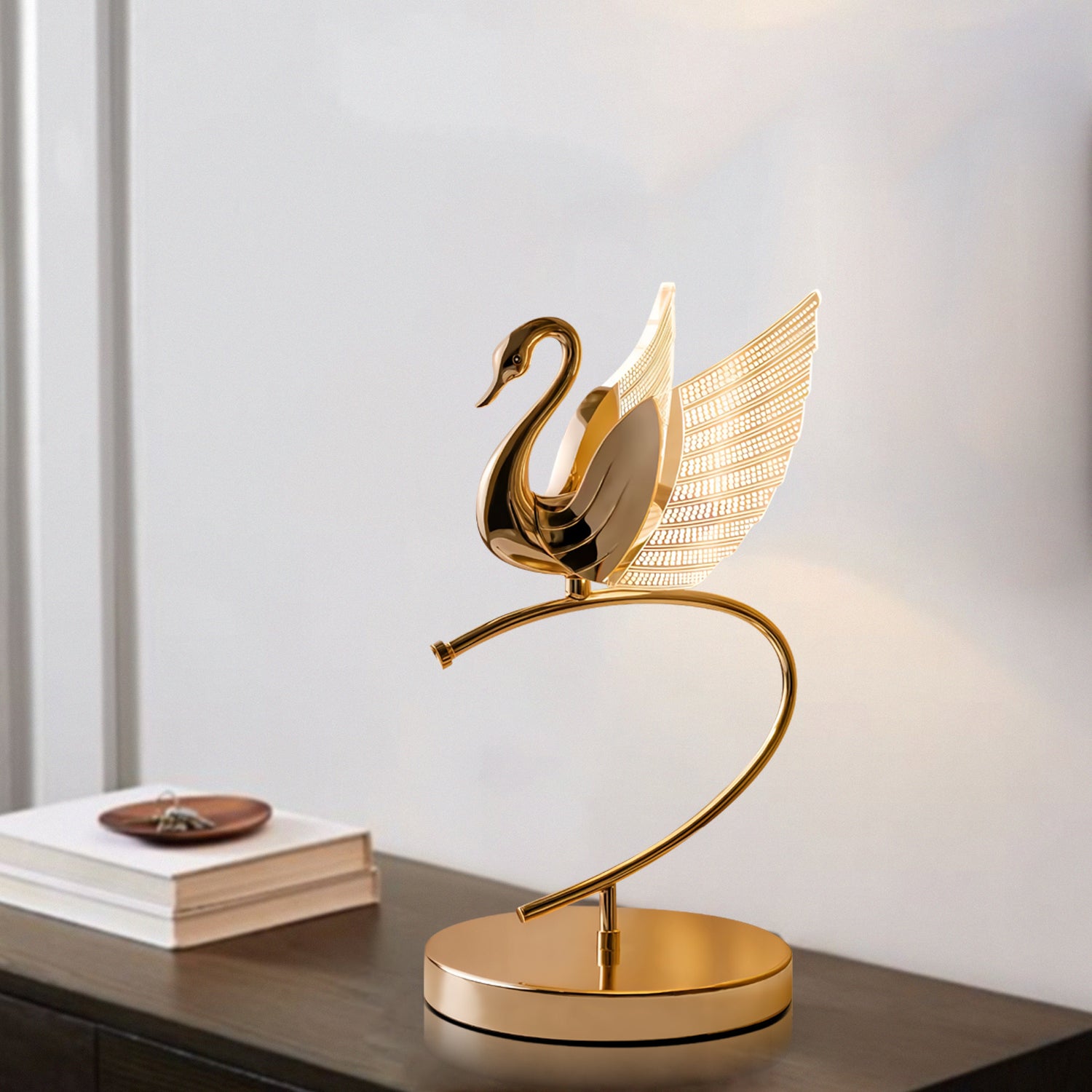 The Swan Table Lamp features a metal body with acrylic panels. Designed in the shape of a swan, the panels allow light to pass through and create a soft glow. It is suitable for bedrooms, living rooms, or study areas, offering both lighting and decorative use.
