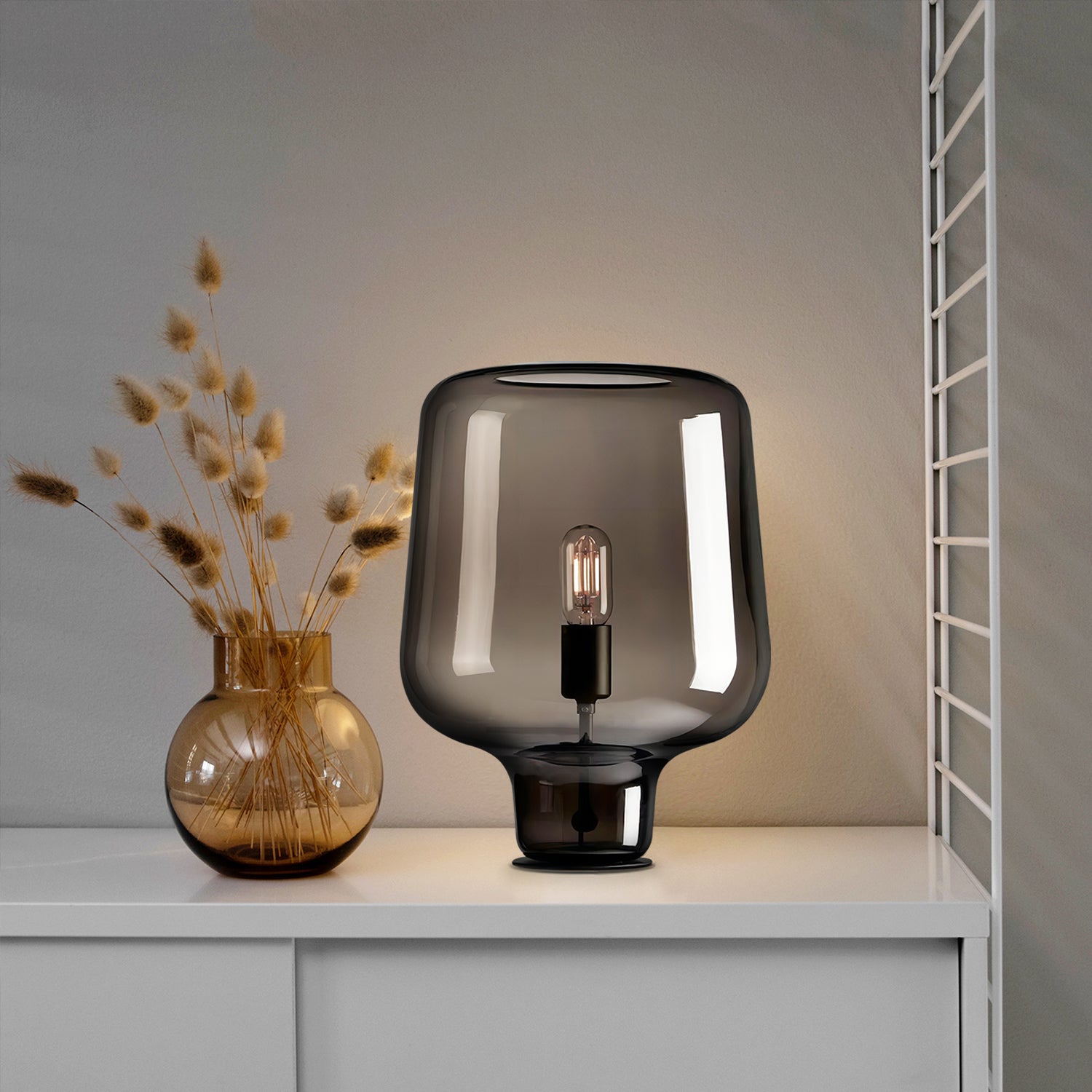 The Teutonic Table Lamp features a transparent glass design that creates a calm and inviting atmosphere. Crafted from hand-blown glass, each piece exhibits subtle variations, adding a unique touch to its elegant appearance.