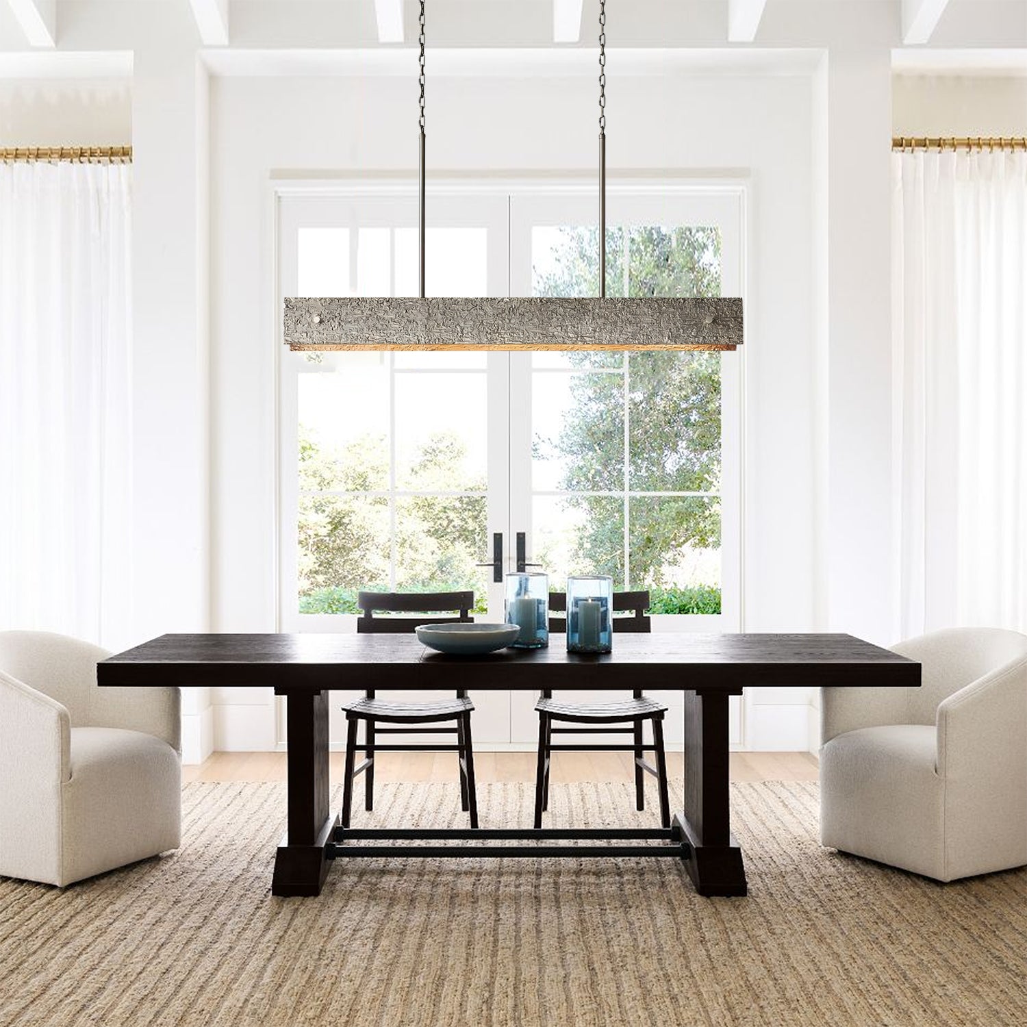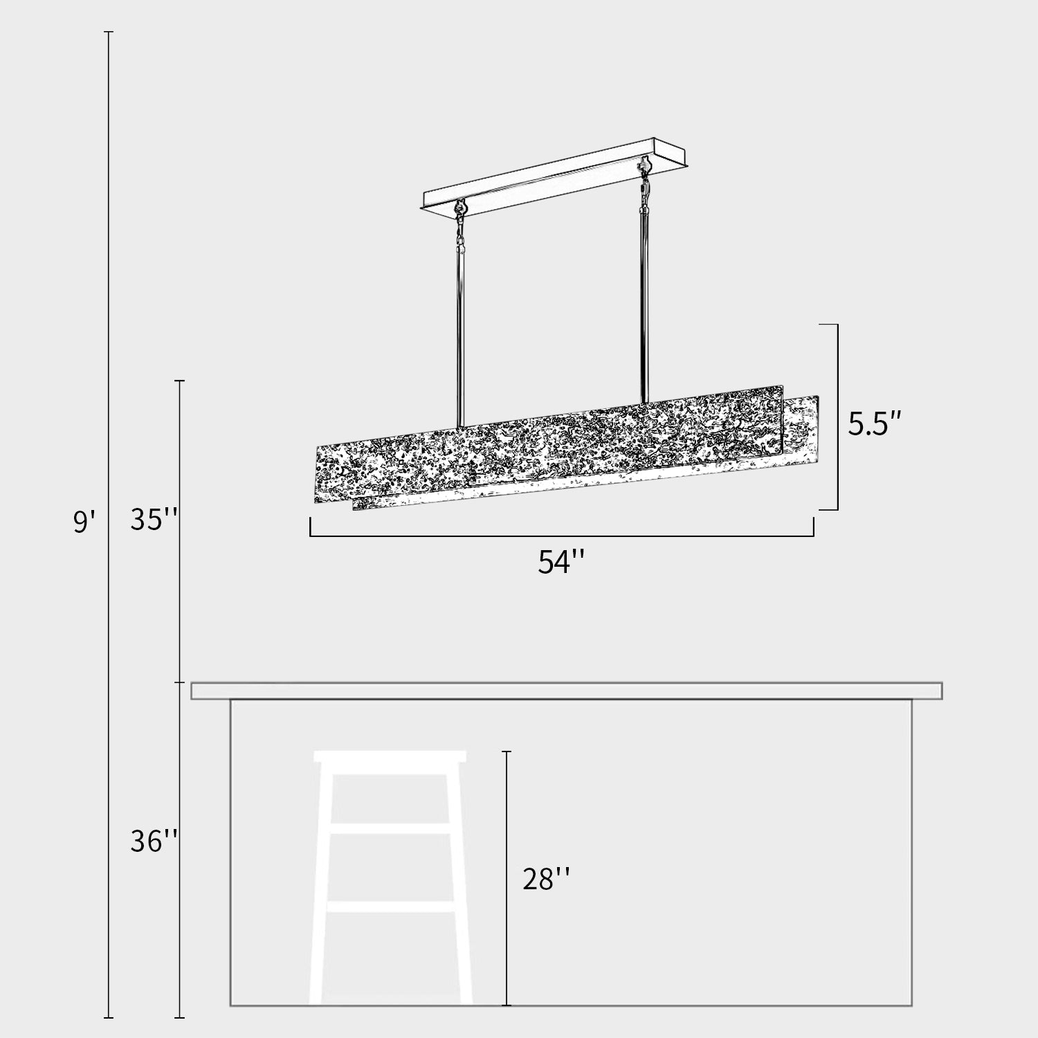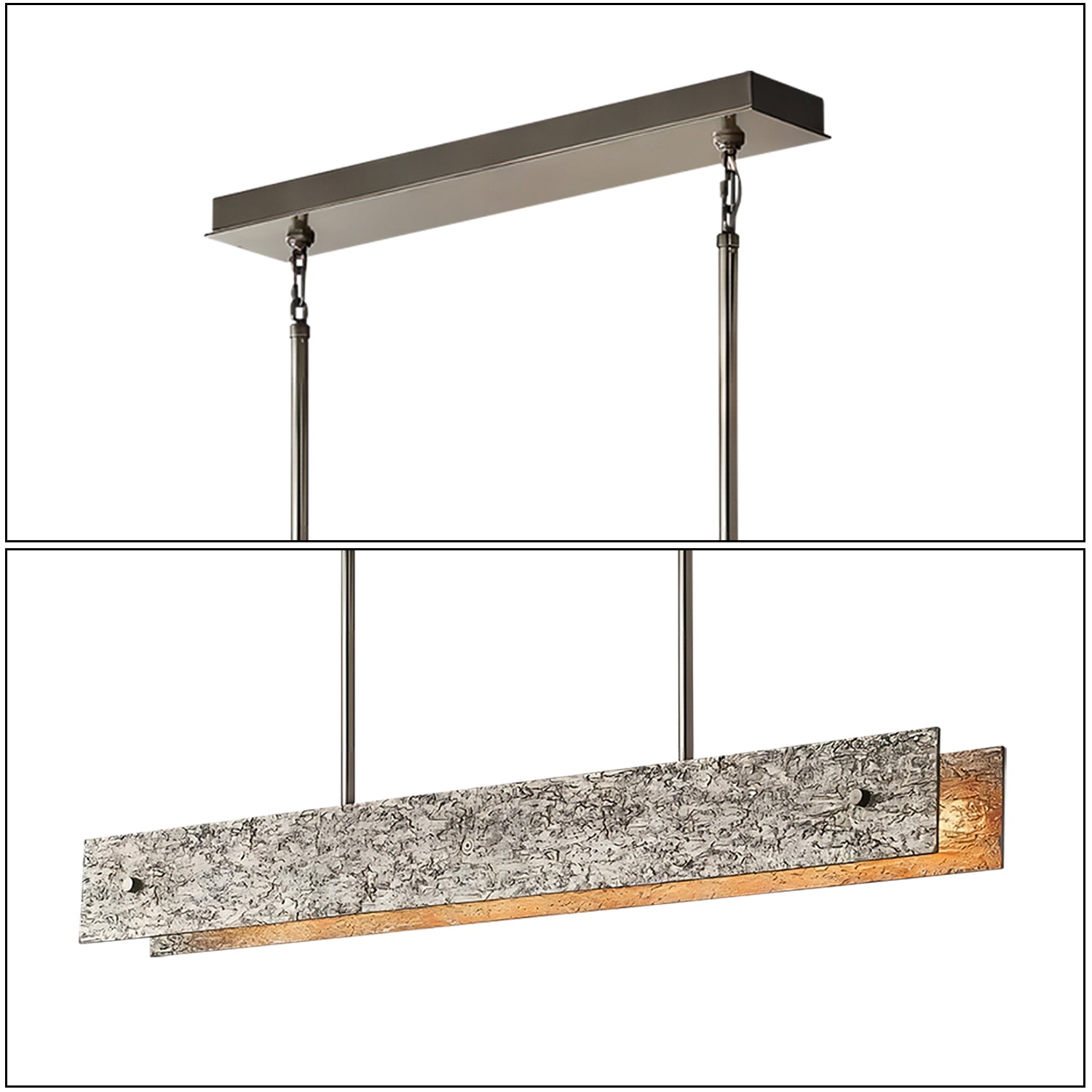 The Textured Linear Pendant features an elongated rectangular frame with a brushed brass finish. Suspended from two adjustable rods, the design provides even illumination along its length. Its linear form makes it suitable for placement above dining tables, kitchen counters, or workspaces.