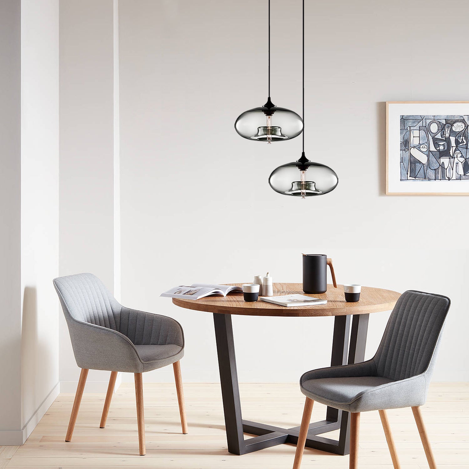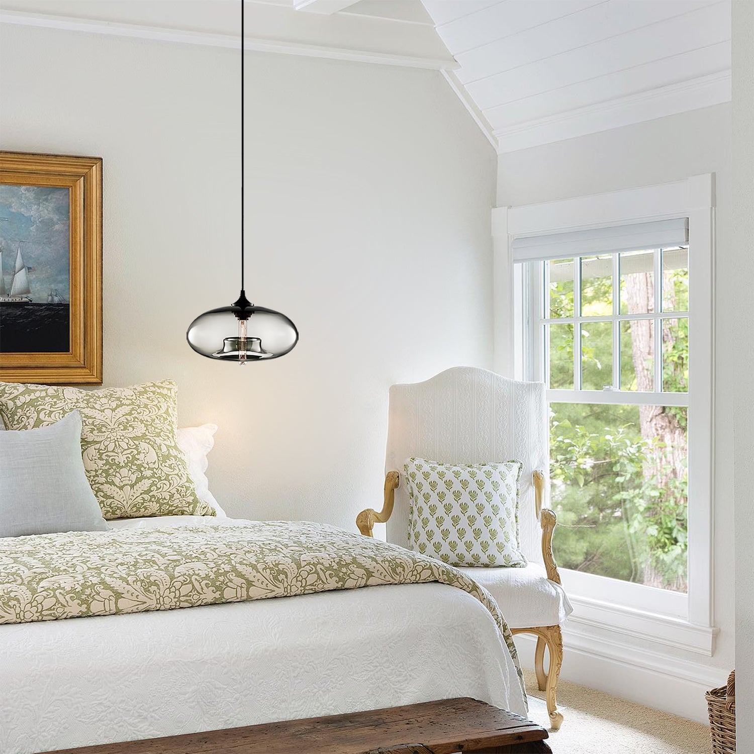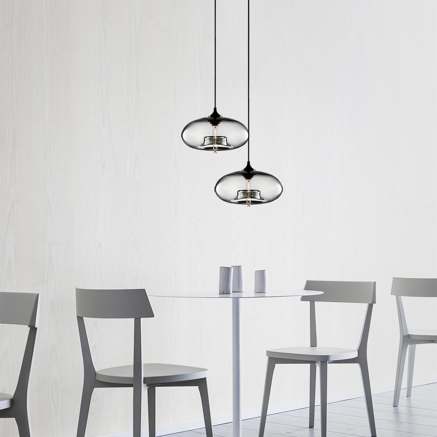 The Tomato Glass Pendant Lamp features an oval form with a fully transparent design on one side. Its unconventional shape maintains aesthetic harmony without overwhelming the space. The subtle graphics gently draw the eye without demanding focus, contributing to a calming ambiance.